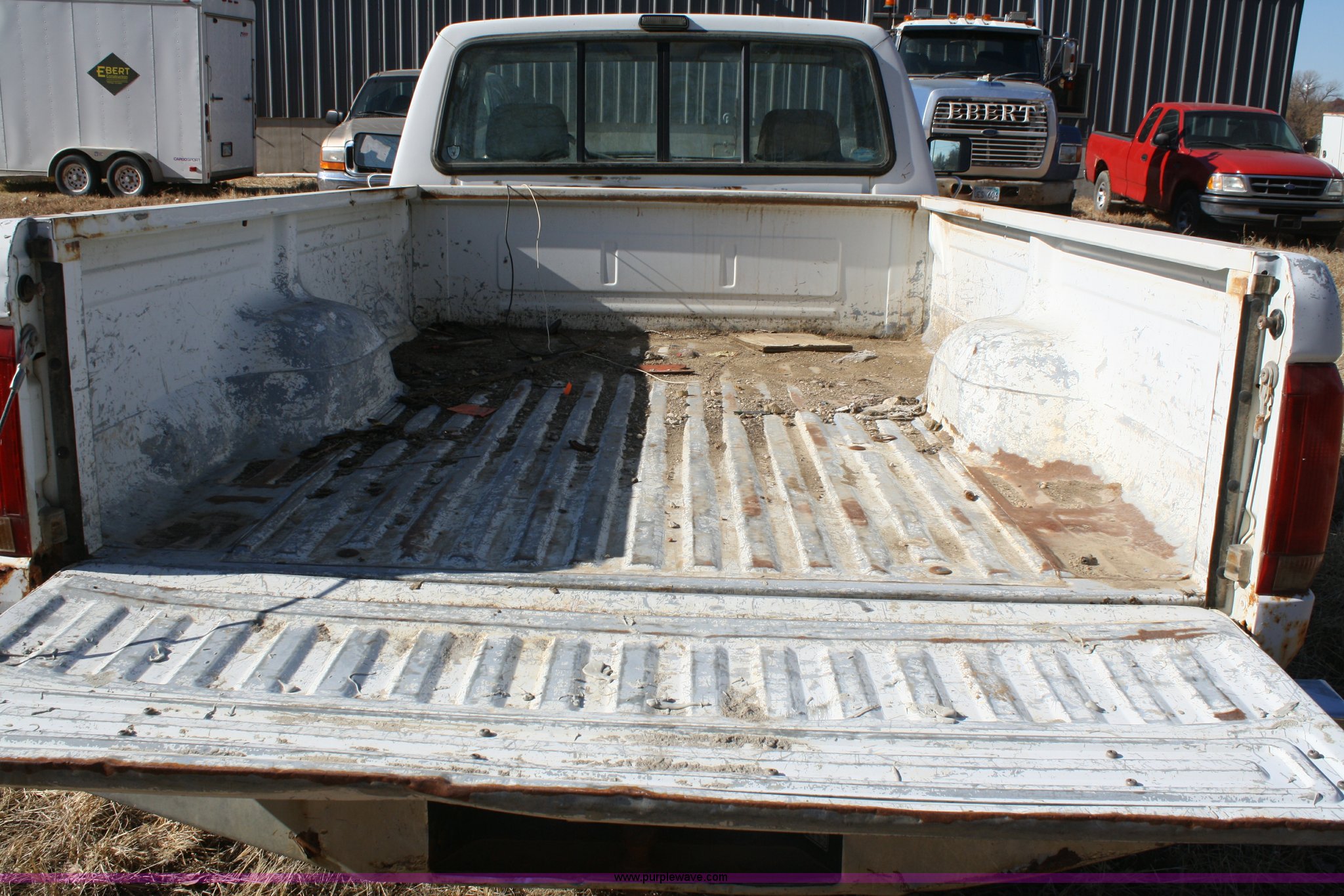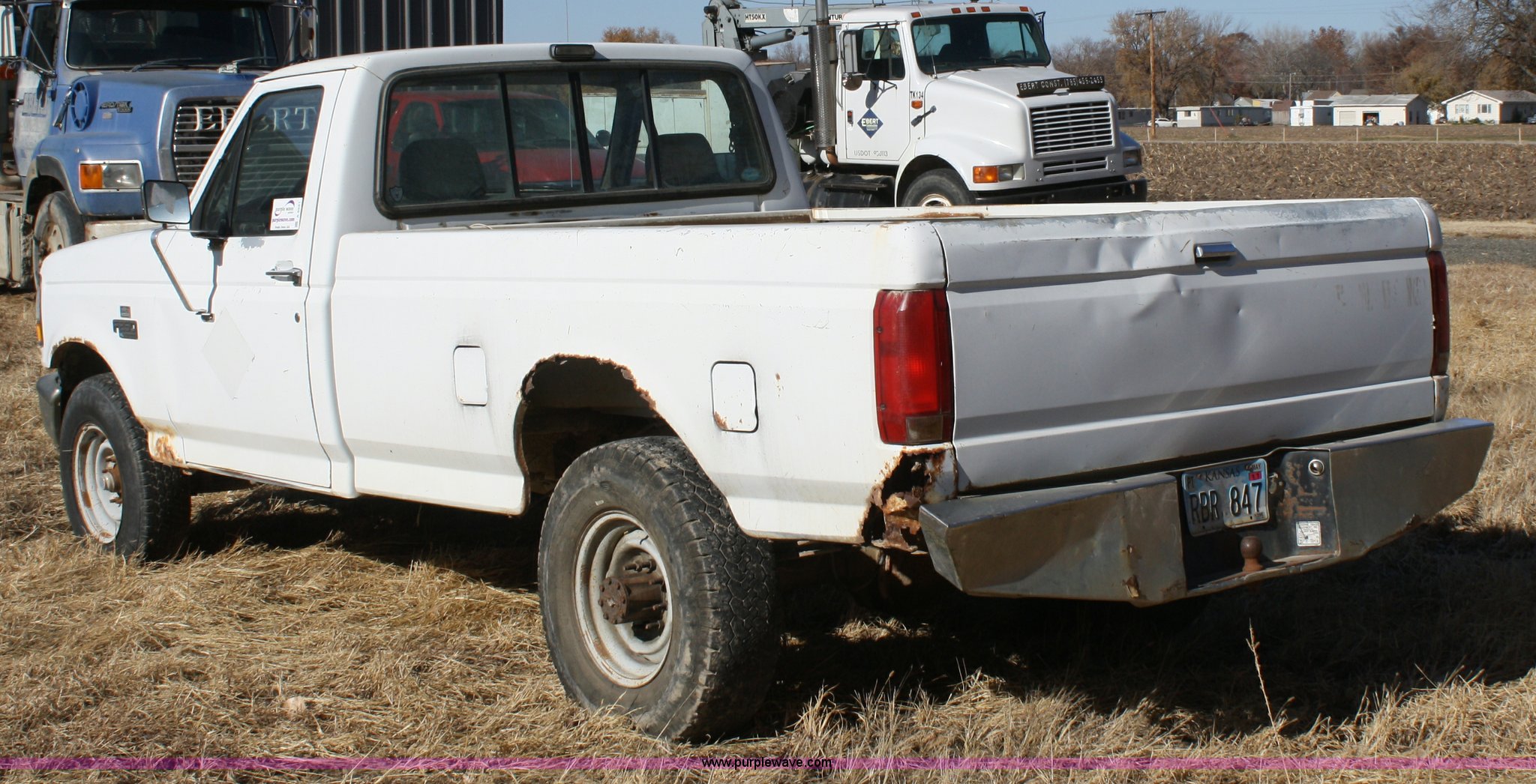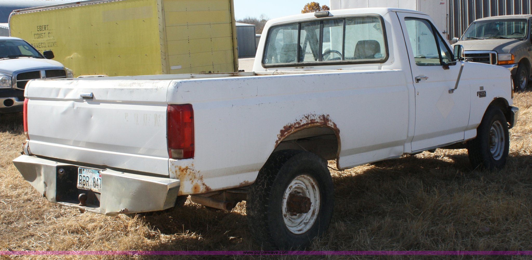 1993 Ford F250 XL pickup truck. Mileage unknown, 4.9L I6 EFI gas engine, Five speed manual transmission, 265/75R16 tires, Heat and AC, AM/FM, Manual windows and locks, Vinyl interior, Dead battery, Starter issues, Has not been used in approx. two years, EID P93. 1FTHF25Y4PNA51039. Shipping quotes available. Ebert Construction Co., Inc.. 103 W. Valley St.. Wamego, KS 66547