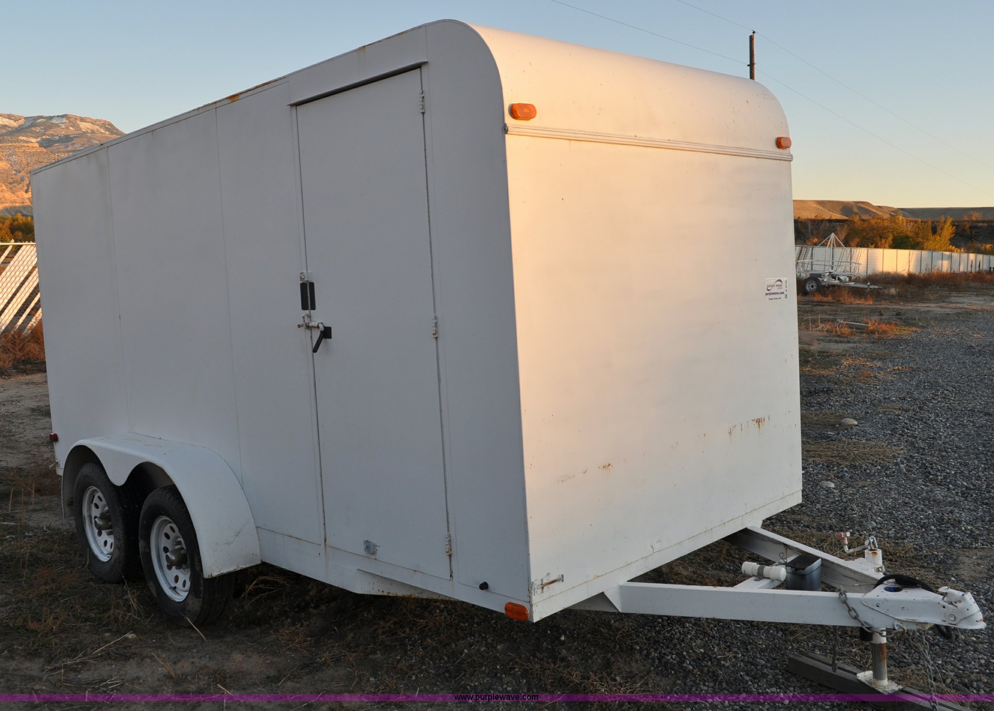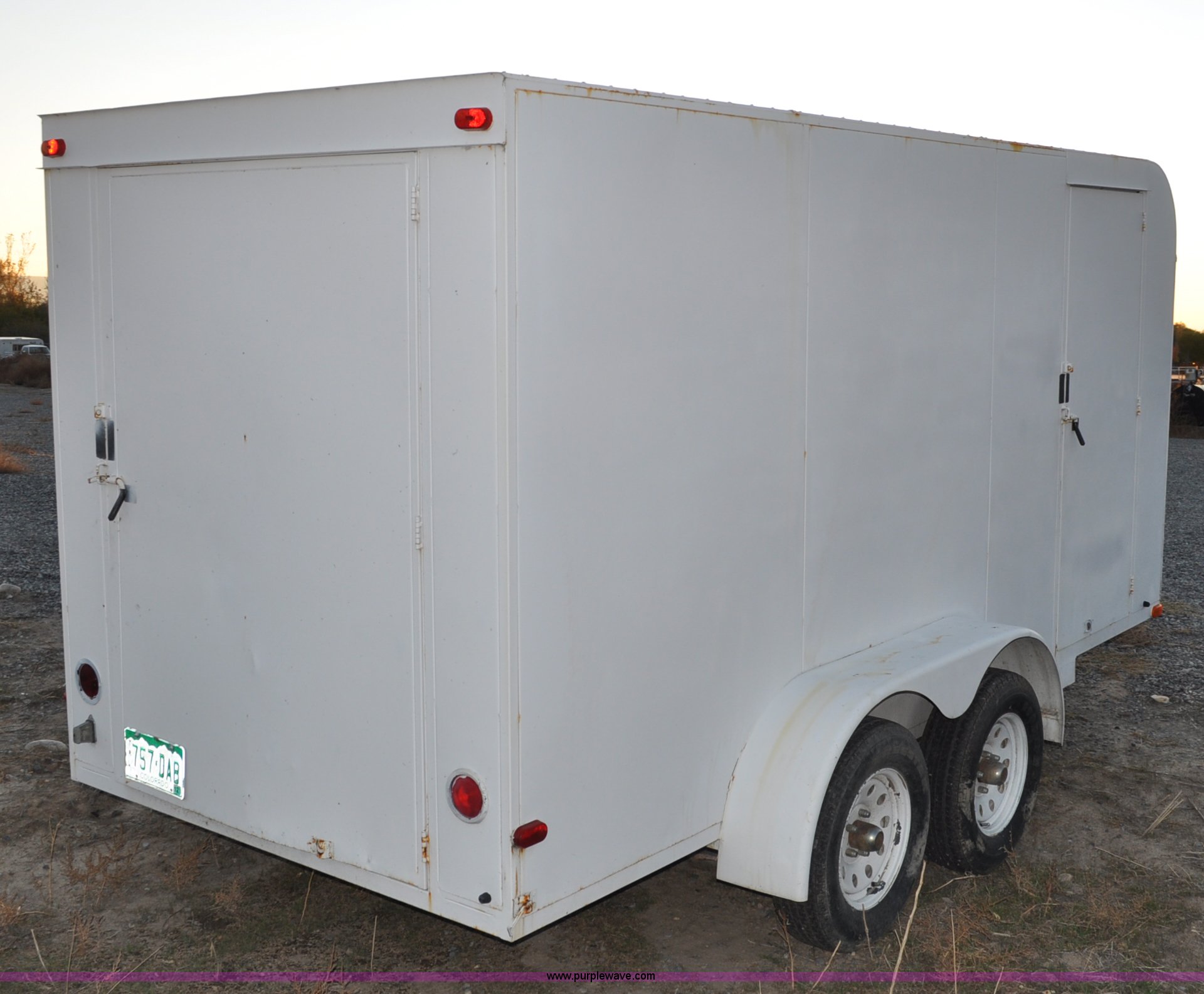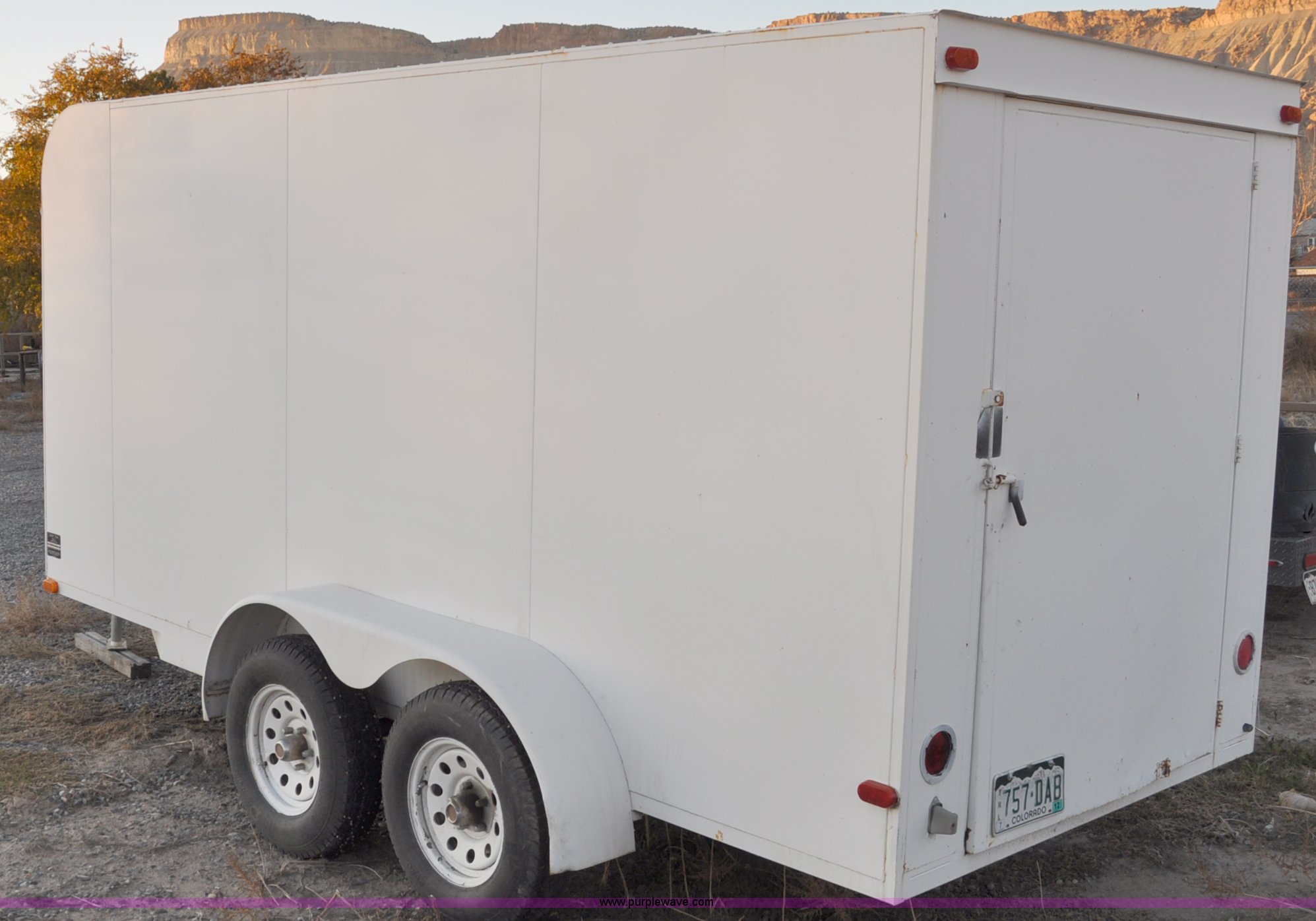 Purple Wave is selling a used Enclosed Cargo Trailer in Colorado. This item is a 2001 Justin C tandem axle trailer with the following: GVWR 7,000 lbs, 14' x 6' x 6'4"H, Wood deck, Side and rear entry, 2" ball, Electric brakes with break-away system, 78-15ST tires, 5-hole rims, Back door slight bow of bottom rail