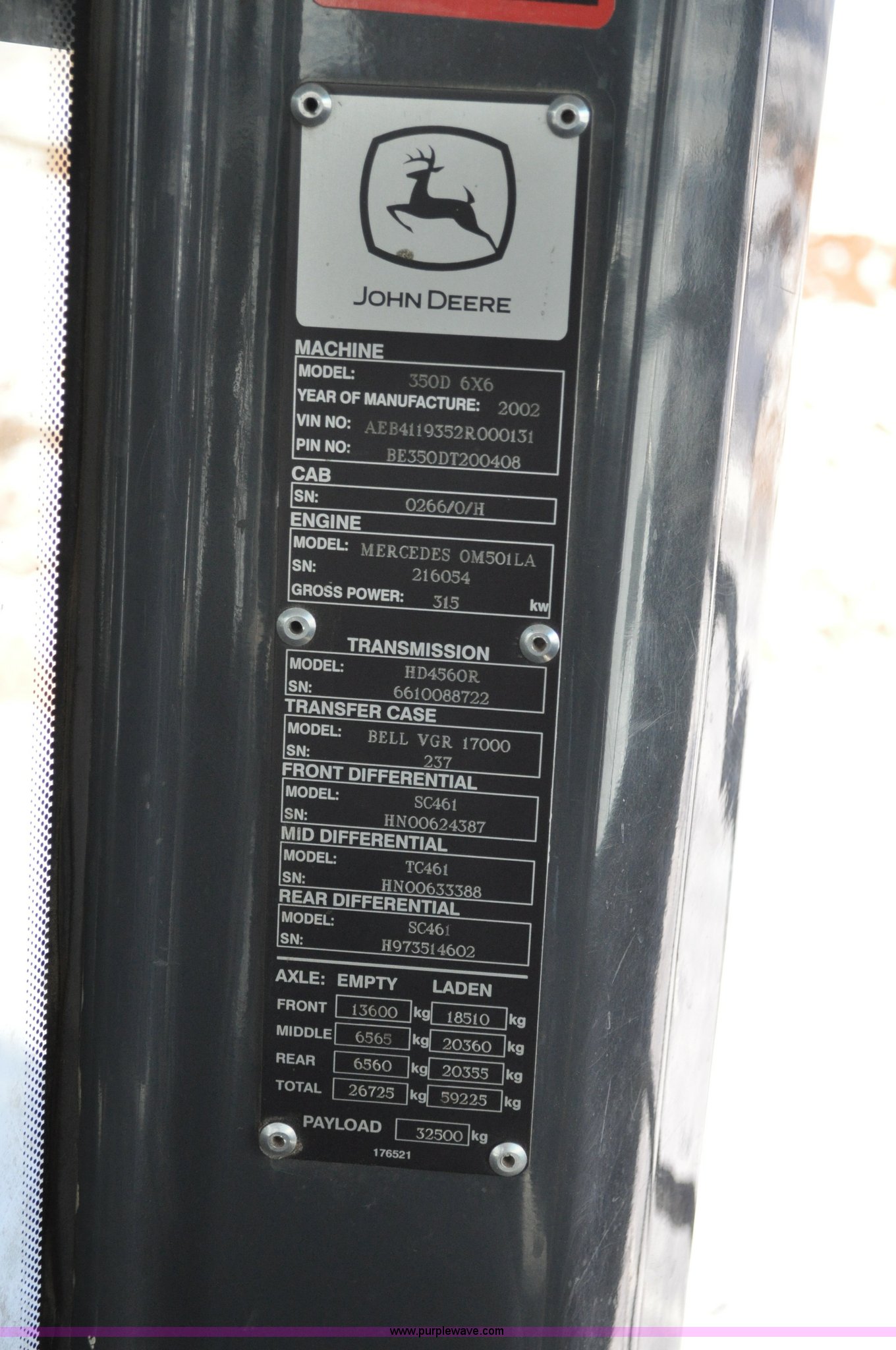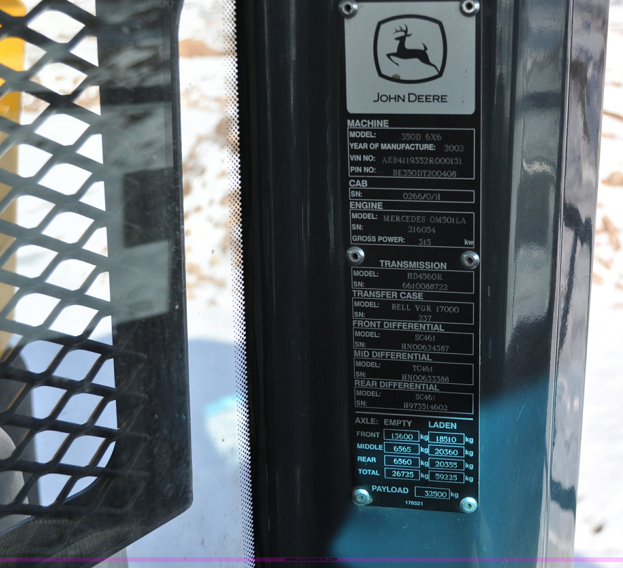 2002 John Deere 350D 6x6 articulating dump truck. 9,166 hours on meter, Mercedes OM501LA diesel engine 380 HP, Transmission HD4560R, 6x6, AC and heat, 26.5R25 tires, 71,500 lb payload, 61,730 lbs. base operating weight, Serial BE350DT200408. Shipping quotes available. Geary Construction. 1595 SW Hoytsville Rd. Coalville, UT 84017