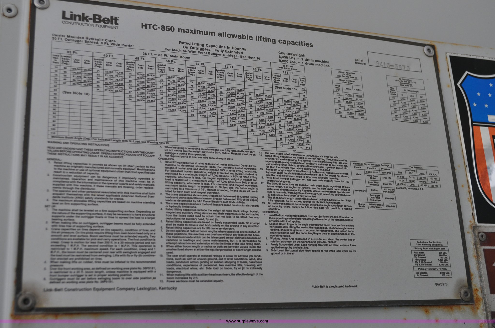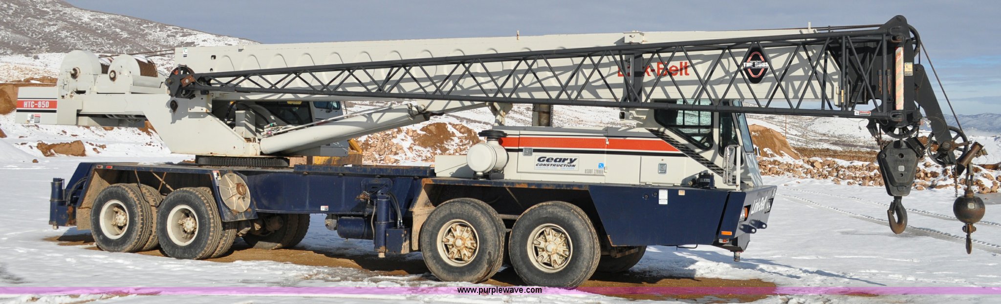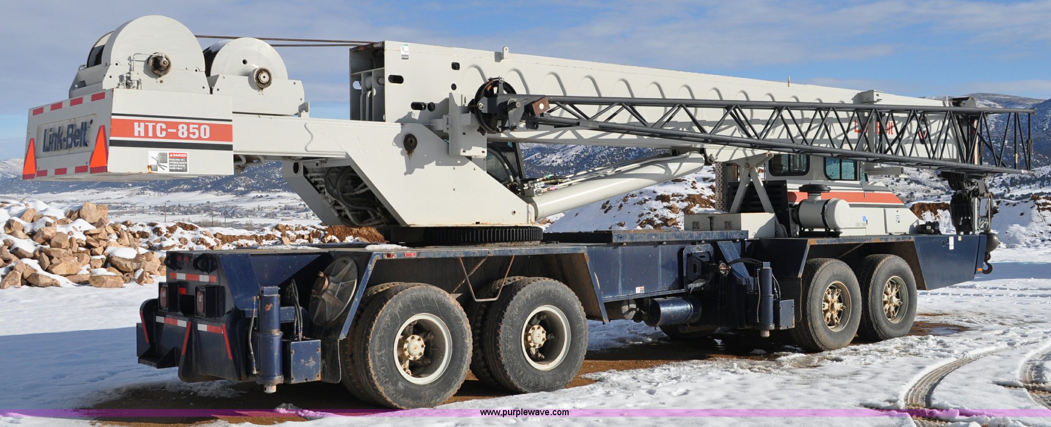 Purple Wave is selling a used Truck Crane in Utah. This item is a 1995 Link-Belt HTC-850 50 ton crane with the following: 23,029 miles on odometer, 5,139 hours on meter, Cummins 8.3L diesel engine, 234 HP, Fuller Roadranger 10 speed manual transmission, Four wheel front steering, 8' carrier, 20' outrigger spread, 35' to 80' main boom, 33' fly boom, 40 ton hook block, LMI system, 8.5 ton hook ball, 425/65R22.5 tires, Slight damage to one corner of cab, Serial 64153875
