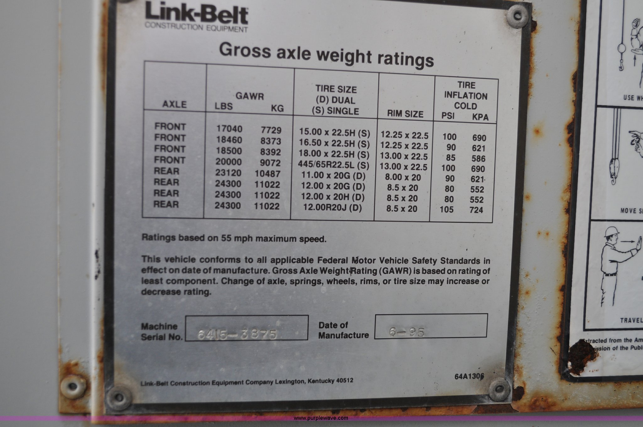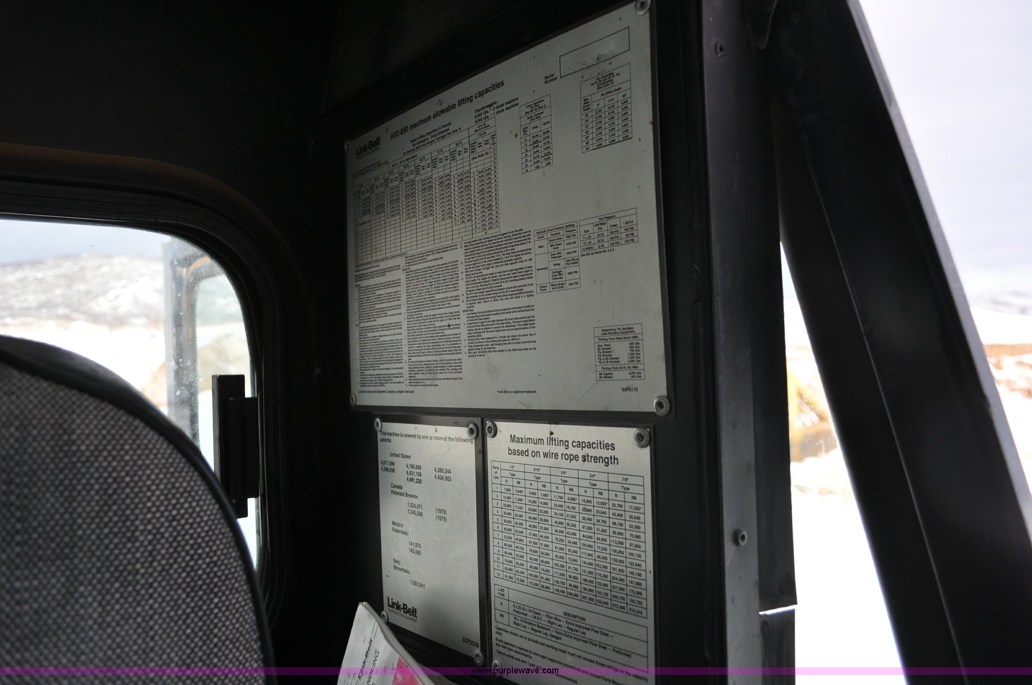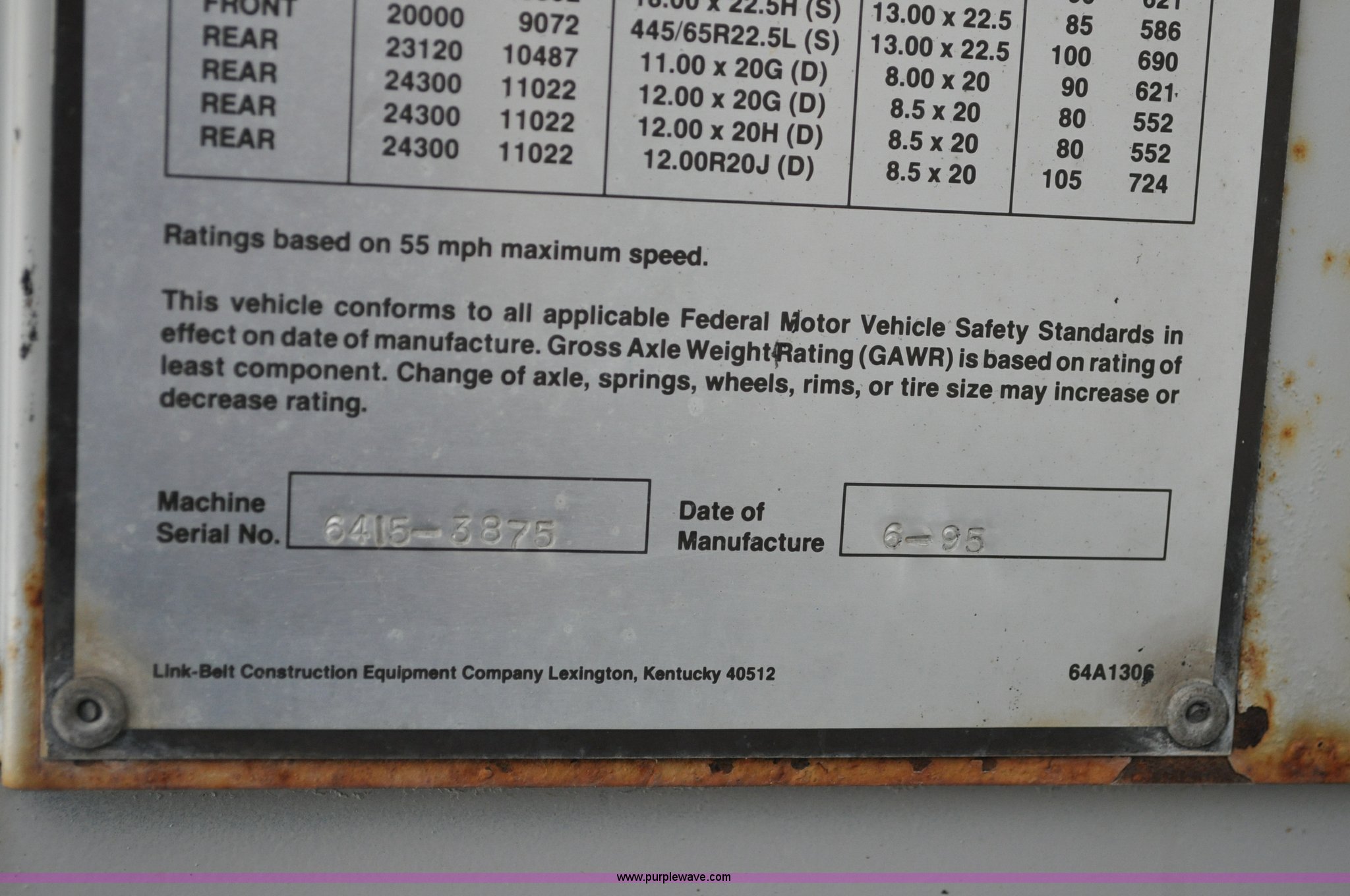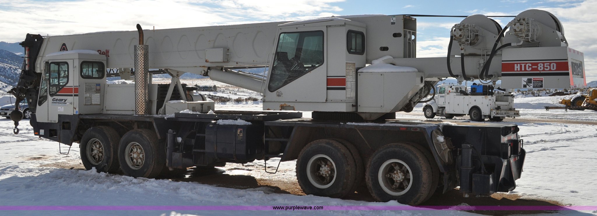 Purple Wave is selling a used Truck Crane in Utah. This item is a 1995 Link-Belt HTC-850 50 ton crane with the following: 23,029 miles on odometer, 5,139 hours on meter, Cummins 8.3L diesel engine, 234 HP, Fuller Roadranger 10 speed manual transmission, Four wheel front steering, 8' carrier, 20' outrigger spread, 35' to 80' main boom, 33' fly boom, 40 ton hook block, LMI system, 8.5 ton hook ball, 425/65R22.5 tires, Slight damage to one corner of cab, Serial 64153875