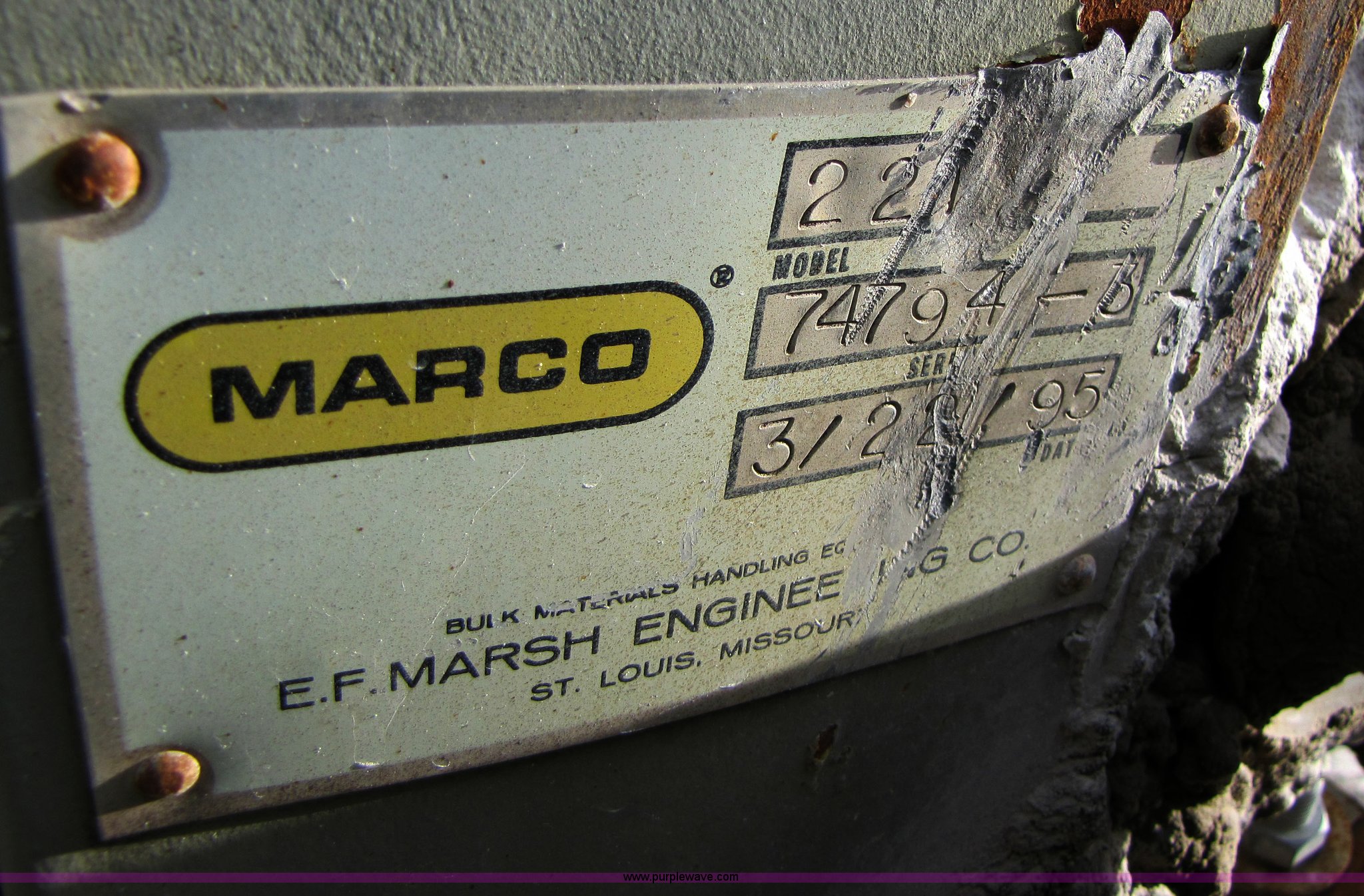 Purple Wave is selling a used Conveyor in Missouri. This item is a 1995 Marco 42" x 60' stationary conveyor with the following: Lattice frame, 20 HP electric motor, Serial 74794-3, Equip# 94-027