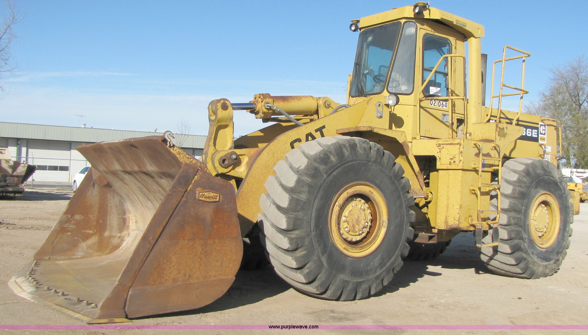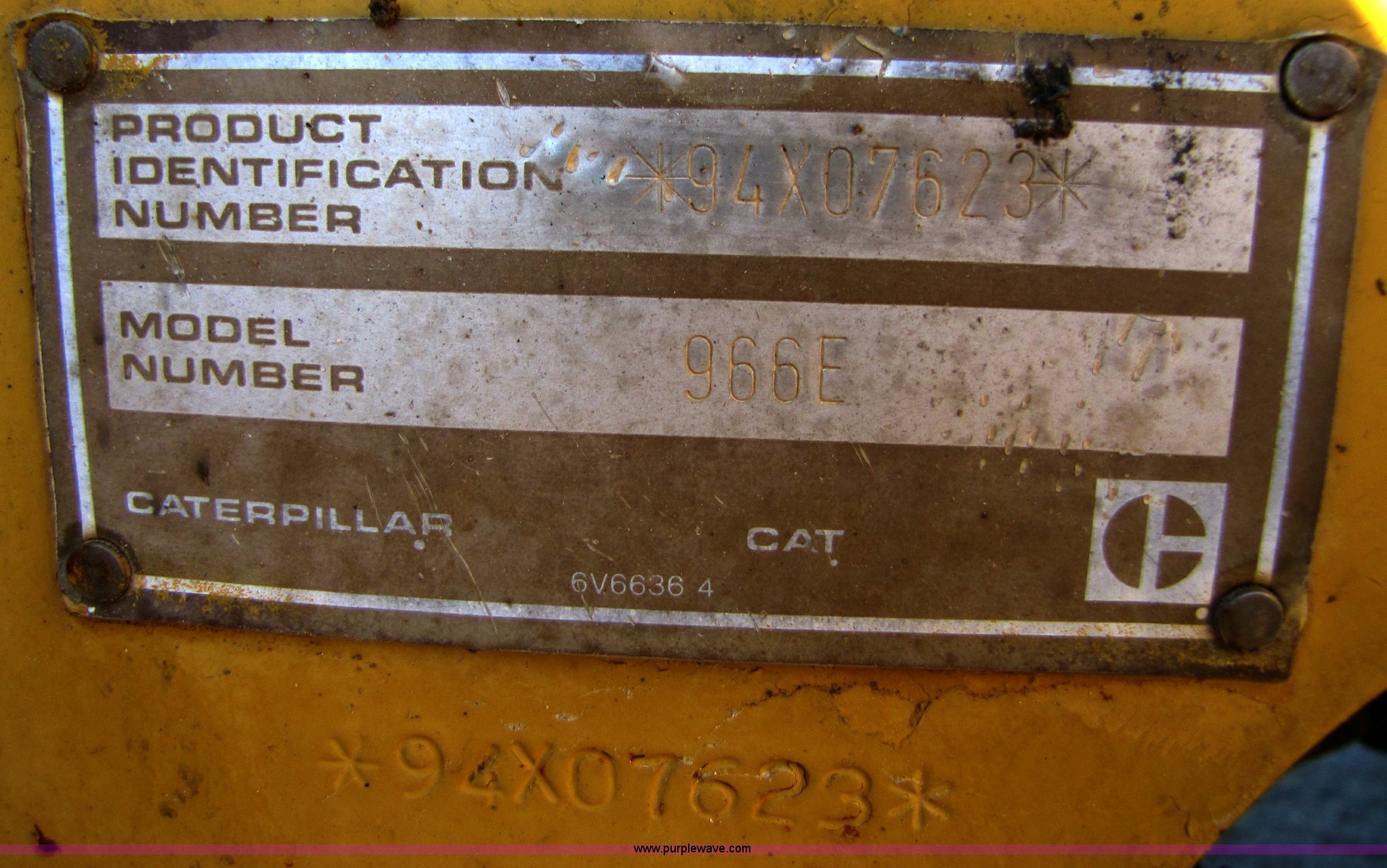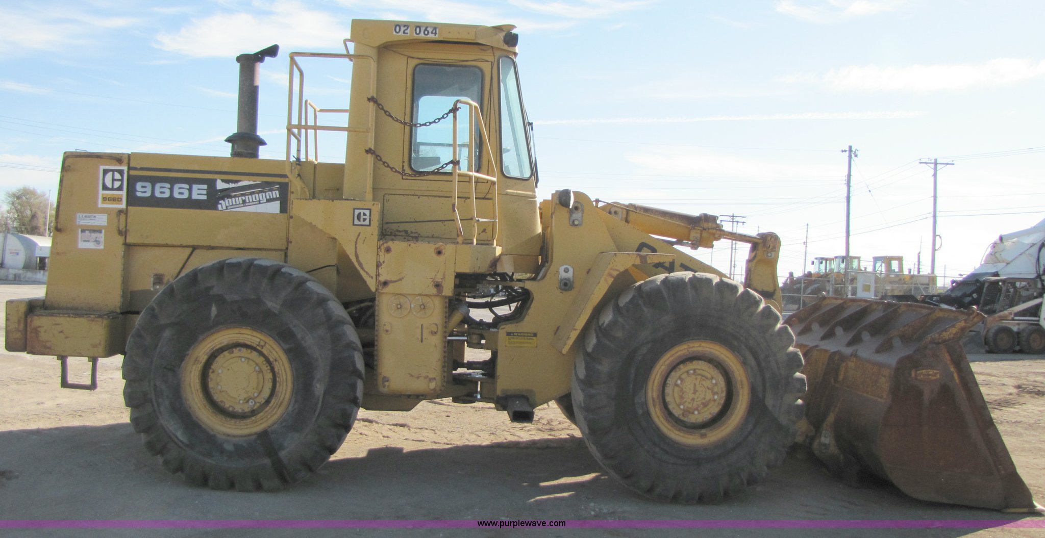 Purple Wave is selling a used Wheel Loader in Missouri. This item is a 1988 Caterpillar 966E wheel loader with the following: 16,340 hours on meter, Caterpillar six cylinder turbo diesel engine, Cab with AC and heat, 4.24 cu.yd. bucket, 123" spade nose bucket, New reversible cutting edge, 26.5-25 tires, Serial 94X07623, Equip# 02-064