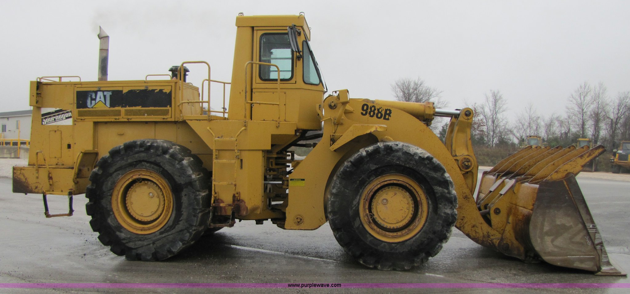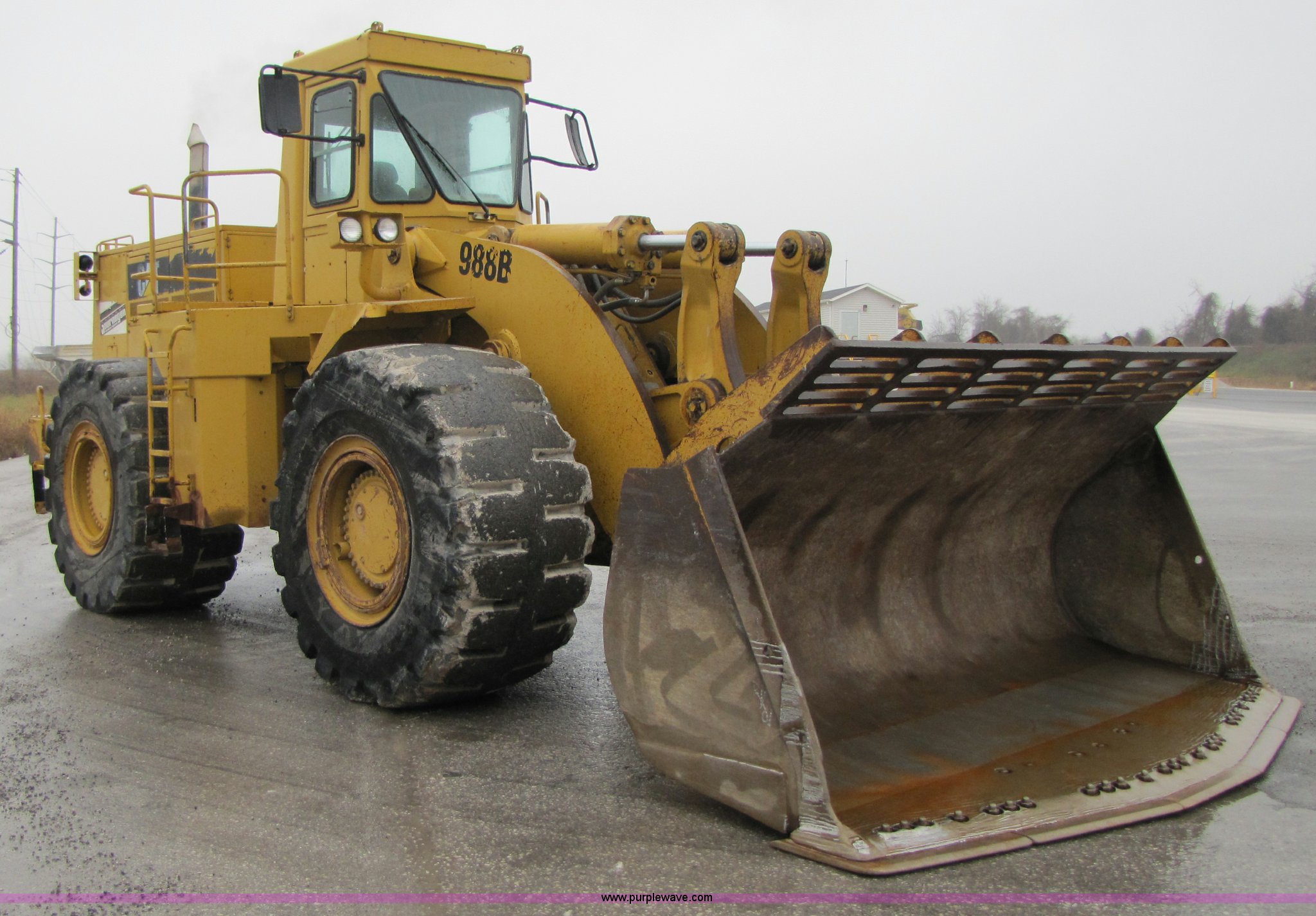Purple Wave is selling a used Wheel Loader in Missouri. This item is a 1992 Caterpillar 988B wheel loader with the following: 33,001 hours on meter, Caterpillar 3408B diesel engine, Four speed transmission, EROPS, AC and heat, Reverse alarm, See-through spill guard, 140"W spade nose bucket, 7 cu. yd., Bolt-on cutting edge, 35/65-33 L-5 tires, Serial 50W11319, Equip# 02-088