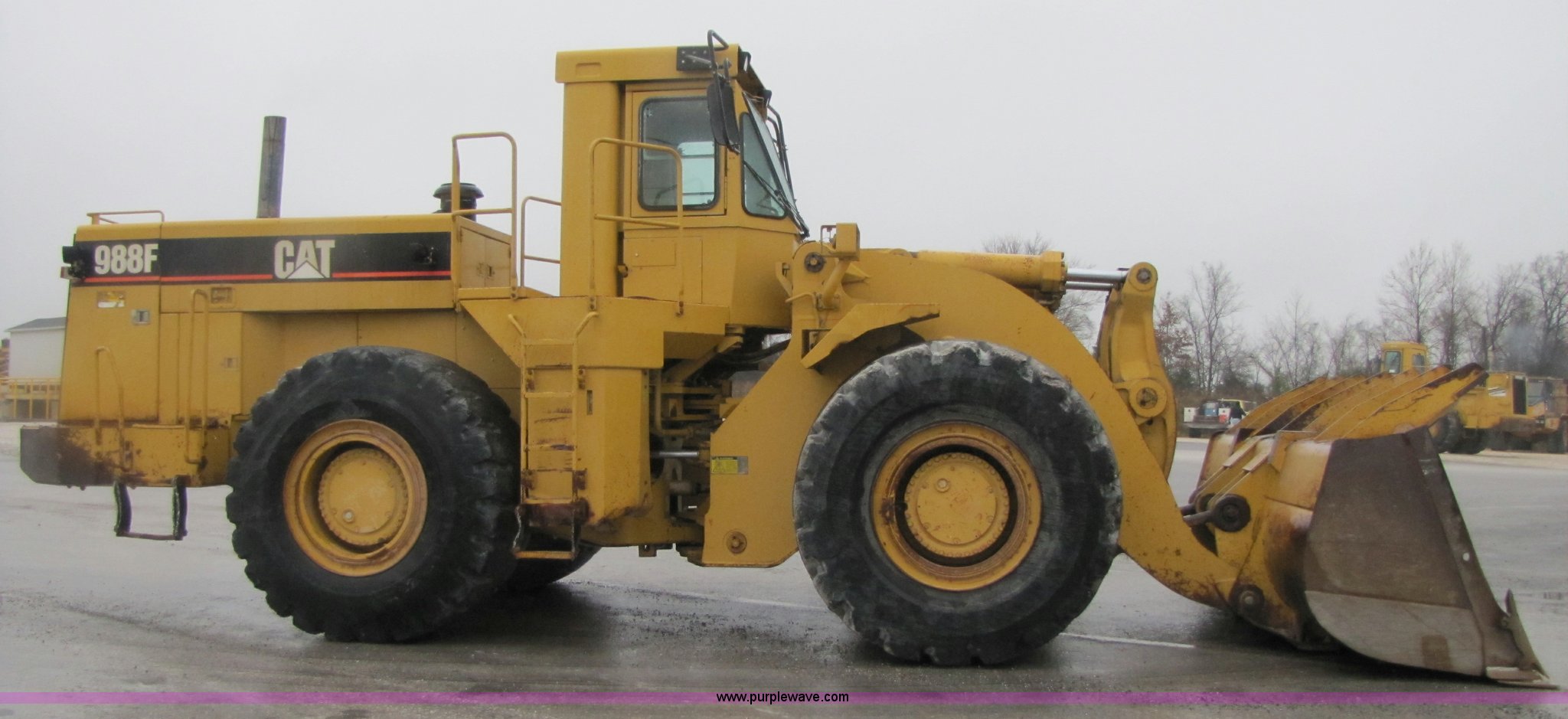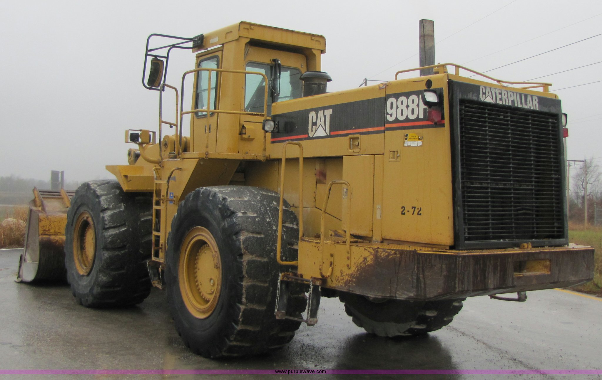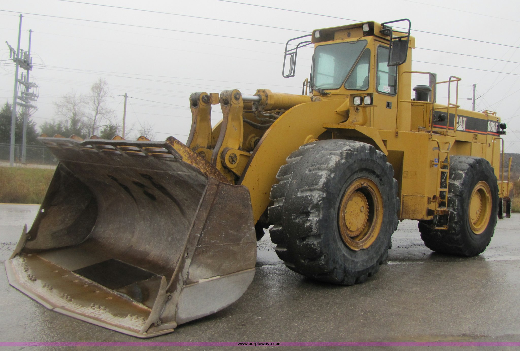 Purple Wave is selling a used Wheel Loader in Missouri. This item is a 1994 Caterpillar 988F wheel loader with the following: 24,085 hours on meter, Caterpillar 3408 diesel engine, Four speed transmission, AC and heat, Joystick control, Reverse alarm, See-through spill guard, Side bar protectors, 146"W spade nose bucket, 7 cu. yd., Serial 4EC470, 35/65-33 L5 tires, Serial 8YG00298, Equip# 02-072