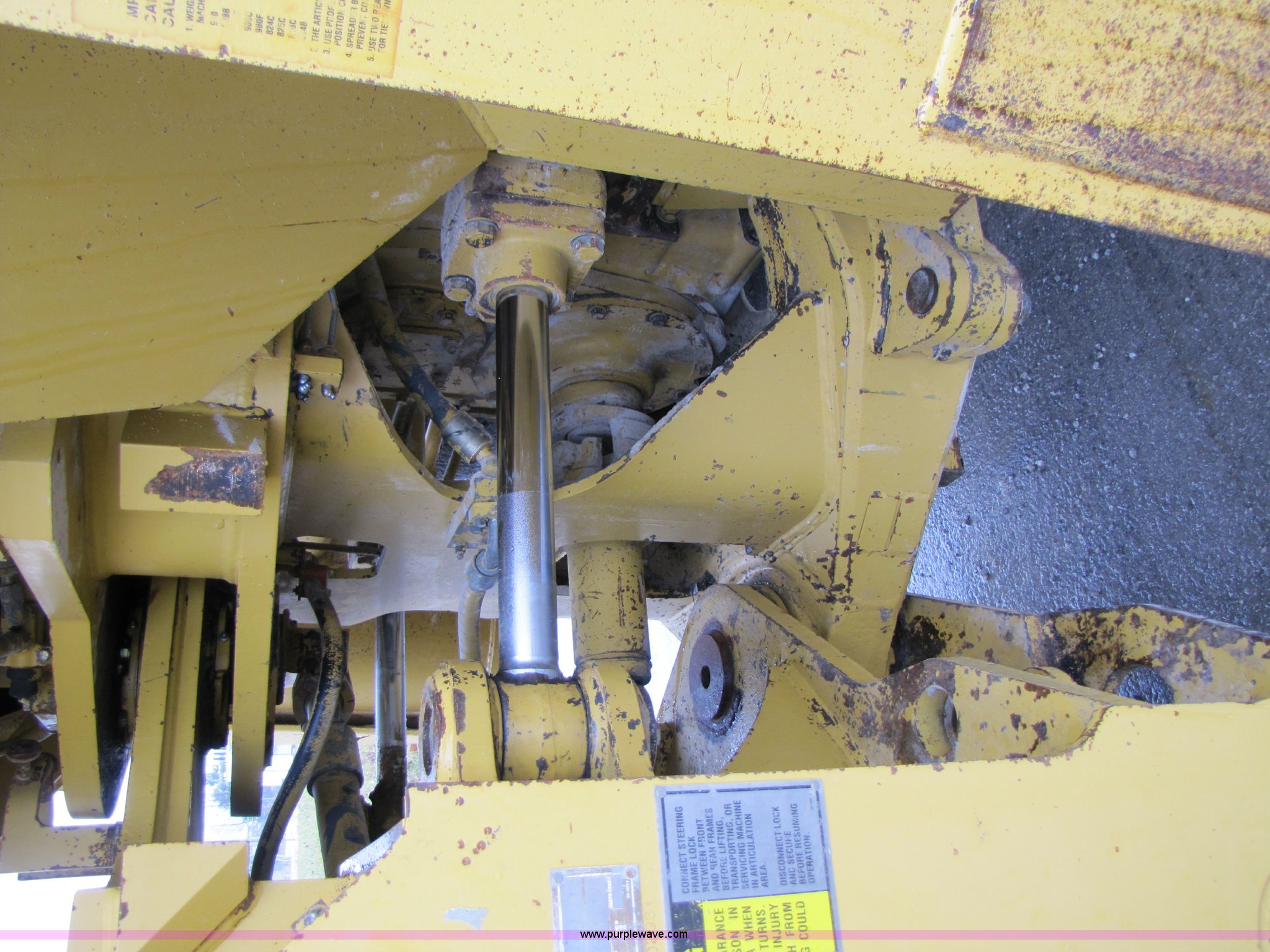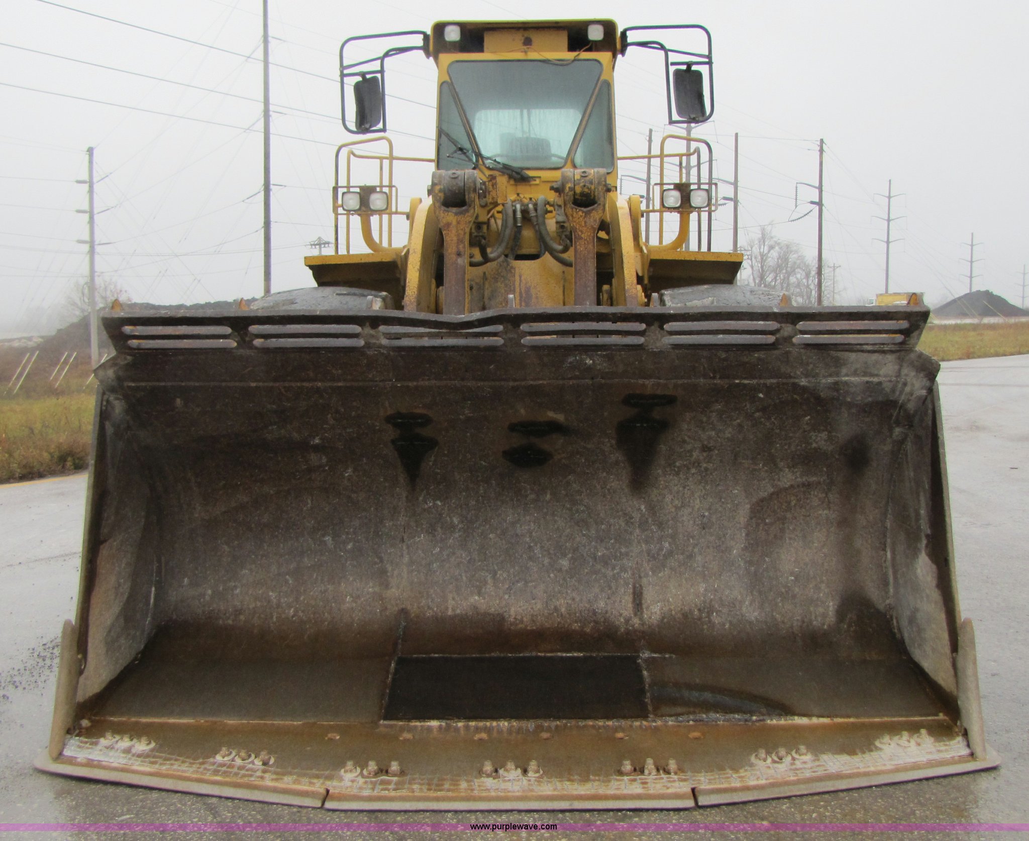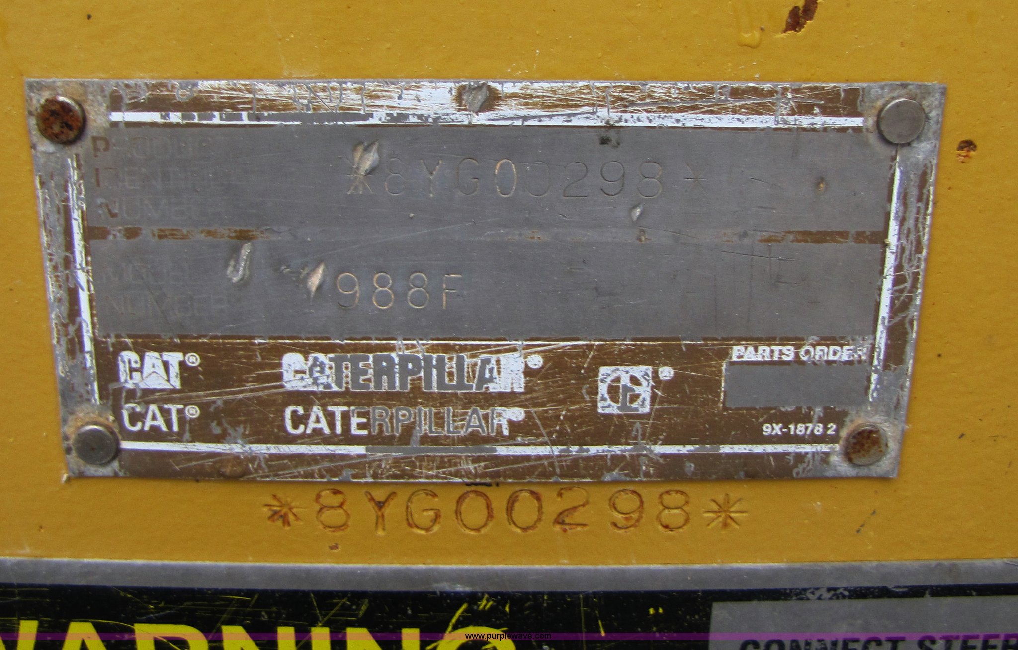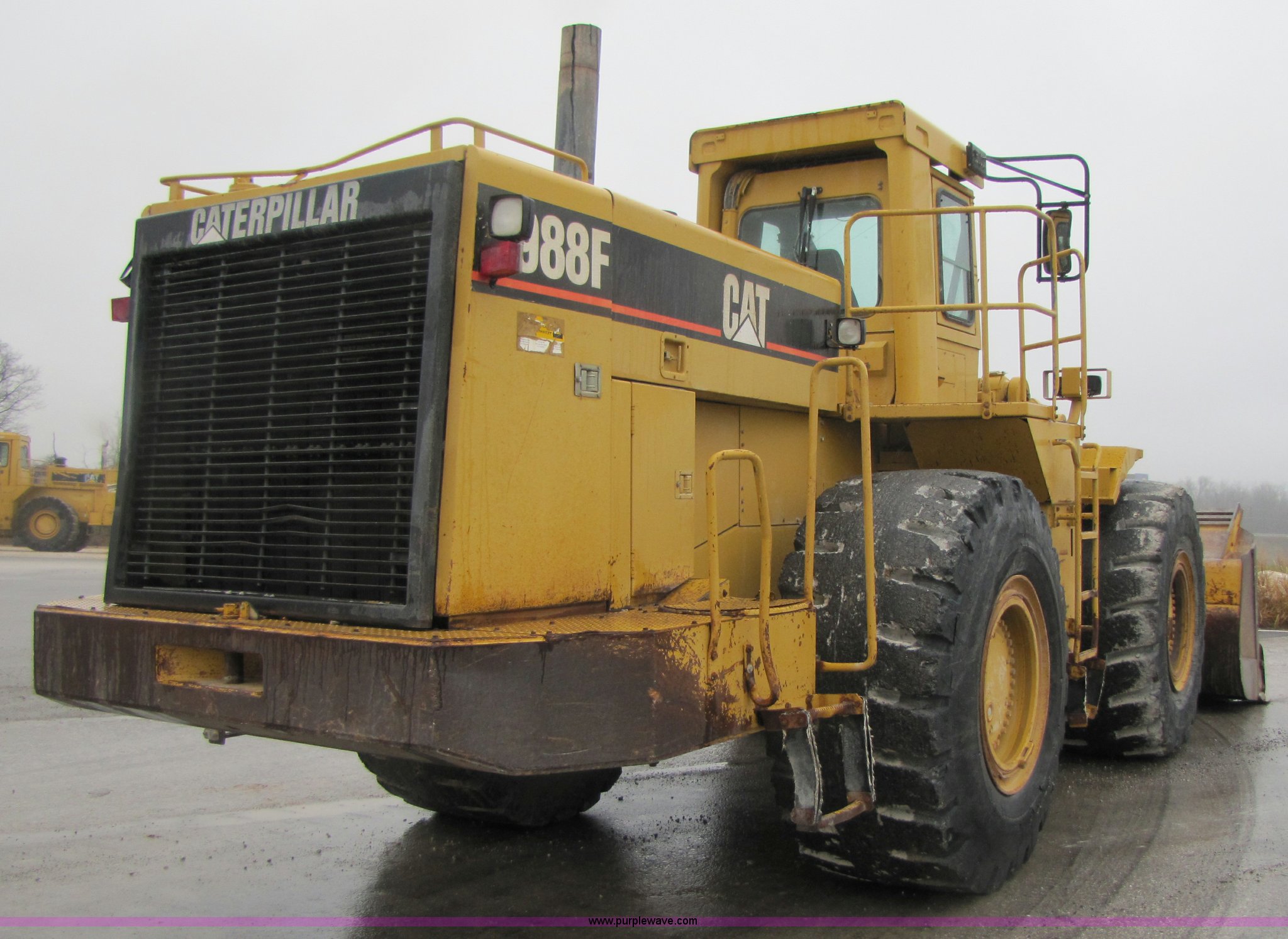Purple Wave is selling a used Wheel Loader in Missouri. This item is a 1994 Caterpillar 988F wheel loader with the following: 24,085 hours on meter, Caterpillar 3408 diesel engine, Four speed transmission, AC and heat, Joystick control, Reverse alarm, See-through spill guard, Side bar protectors, 146"W spade nose bucket, 7 cu. yd., Serial 4EC470, 35/65-33 L5 tires, Serial 8YG00298, Equip# 02-072