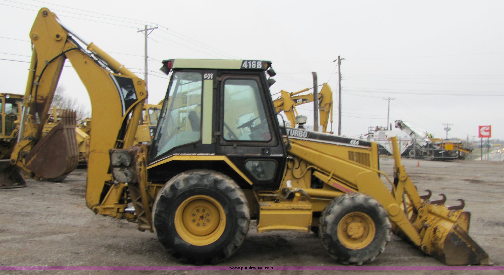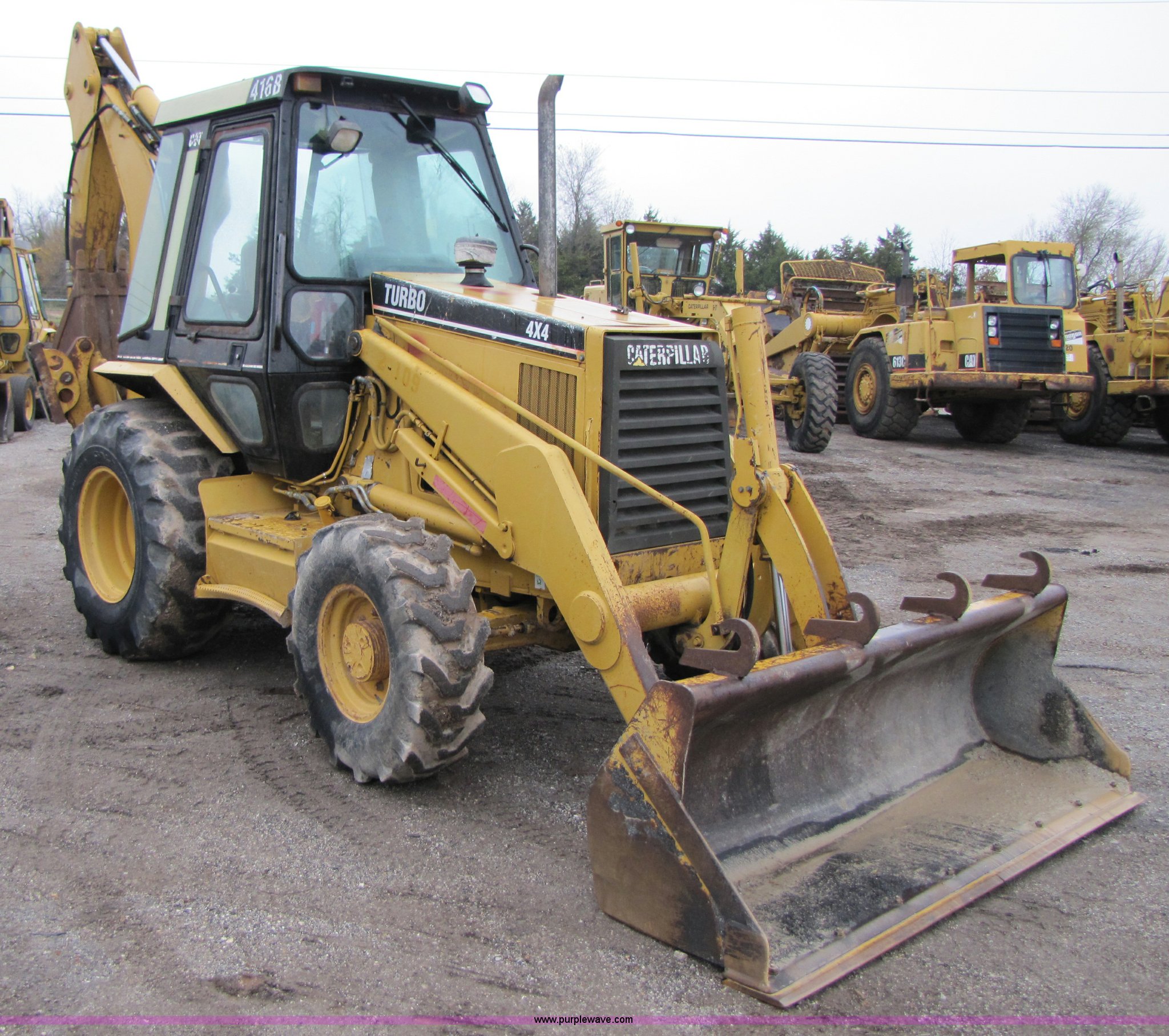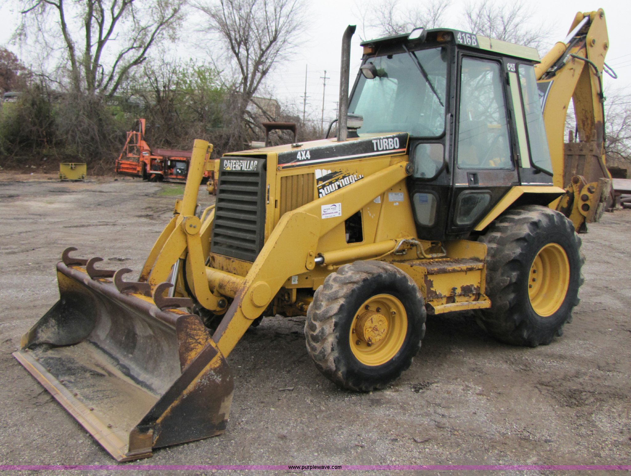 Purple Wave is selling a used Tractor Loader Backhoe in Missouri. This item is a 1993 Caterpillar 416B 4x4 loader backhoe with the following: 9,572 hours on meter, Caterpillar 3054 turbo diesel engine, 85 HP, Four wheel drive, 64" GP bucket, Bolt-on cutting edge, 24" backhoe bucket, Hydraulic stabilizers, Auxiliary hydraulics, 12.5/80-18 front tires, 19.5L-24 rear tires, Serial 82K01164, Equip# 02-109