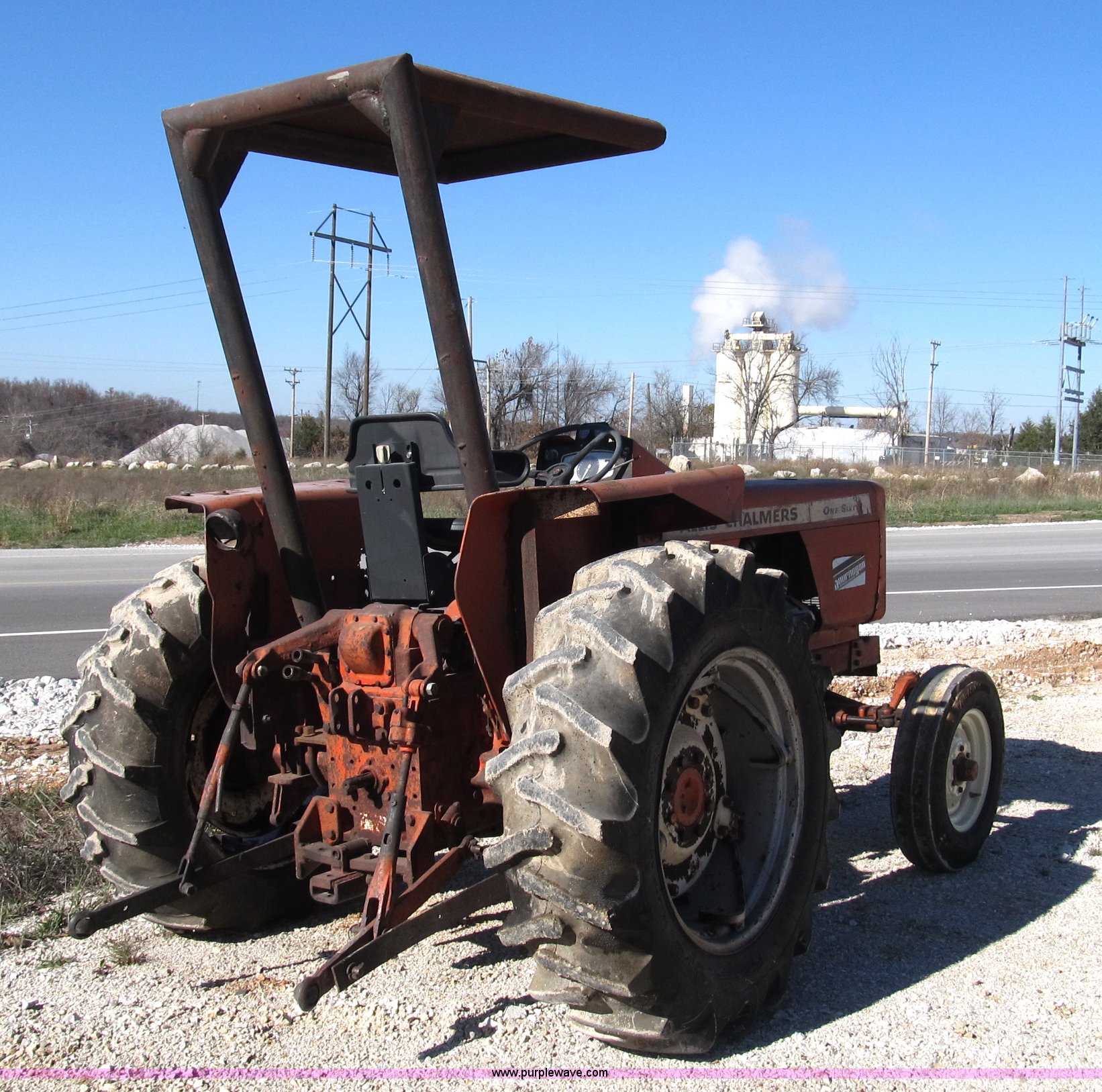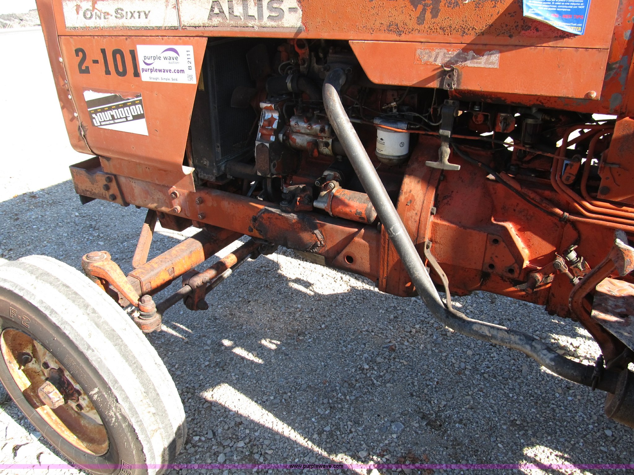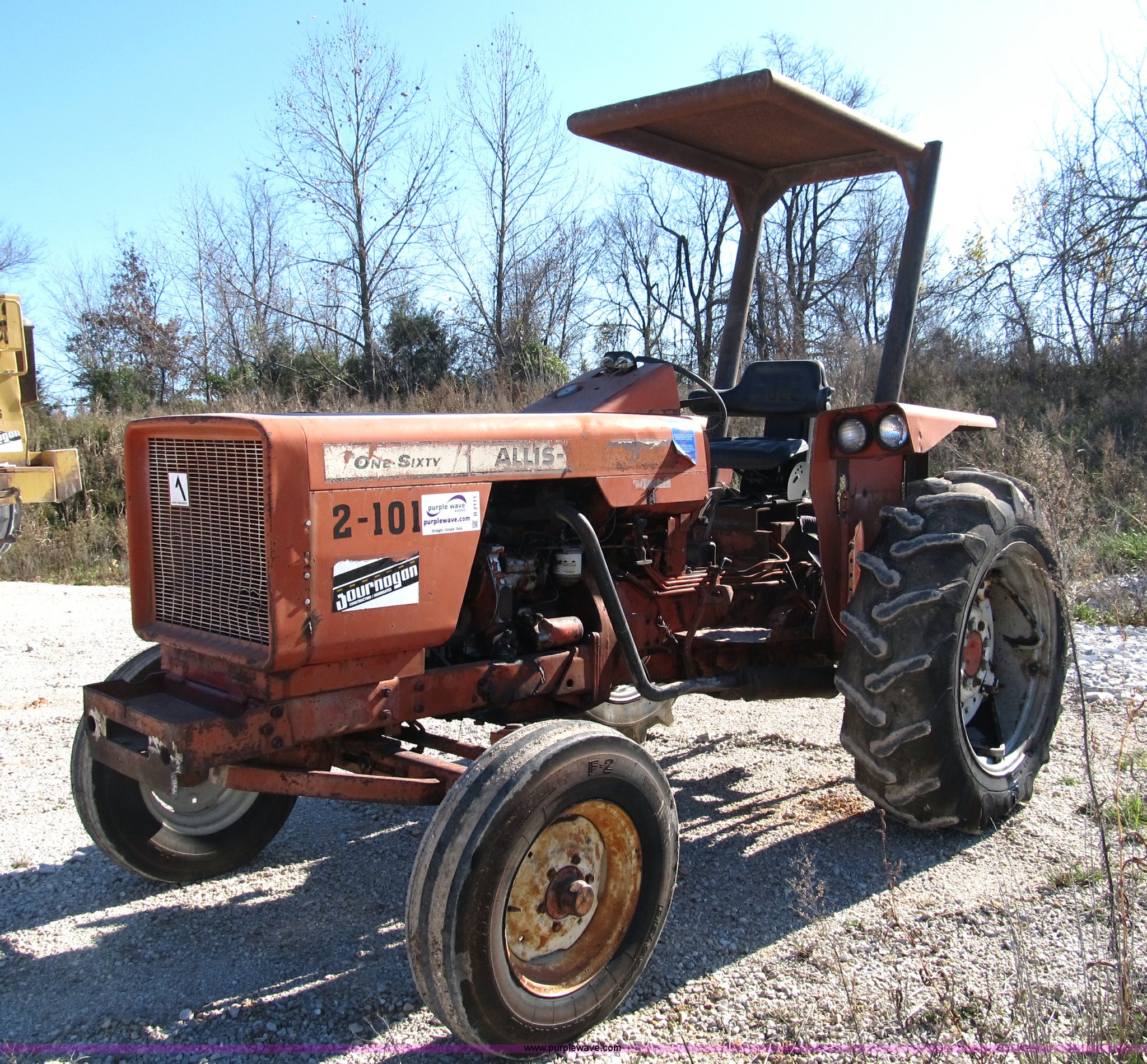 Purple Wave is selling a used Tractor in Missouri. This item is a Allis Chalmers 160 tractor with the following: Three cylinder diesel engine, Six speed shuttle transmission, Canopy, Three point, non-operational, No top link, 540 PTO, Hydraulic remote set, 6.50-16 front tires, 13.6-28 rear tires, Frame under engine has been welded, Equip# 02-101