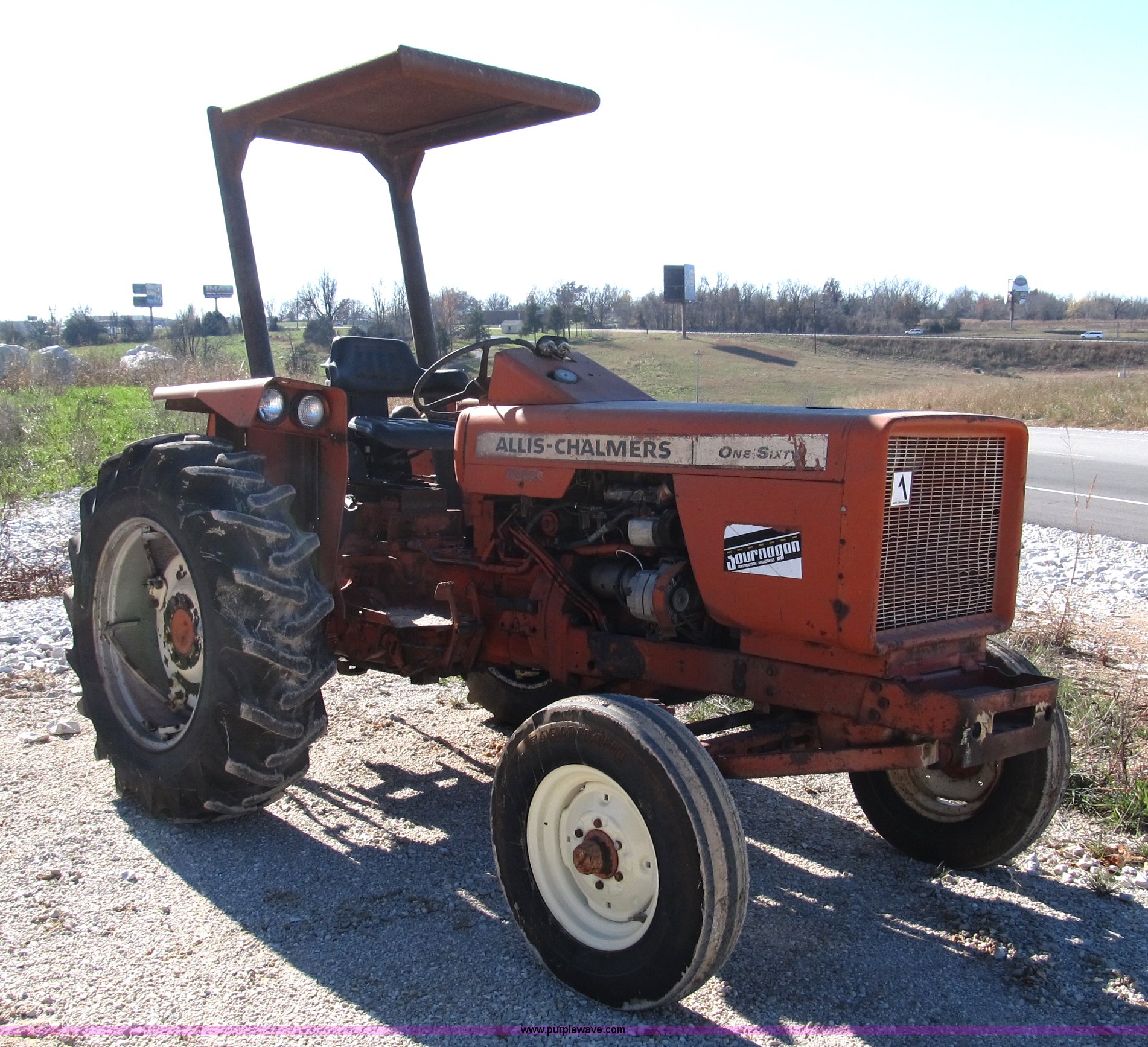 Allis Chalmers 160 tractor. Three cylinder diesel engine, Six speed shuttle transmission, Canopy, Three point, non-operational No top link, 540 PTO, Hydraulic remote set, 6.50-16 front tires, 13.6-28 rear tires, Frame under engine has been welded, Equip# 02-101. View labor history for this asset. View parts history for this asset. View equipment video. Shipping quotes available. Journagan Construction Company Inc.. 3659 E Kearney. Springfield, MO 65803