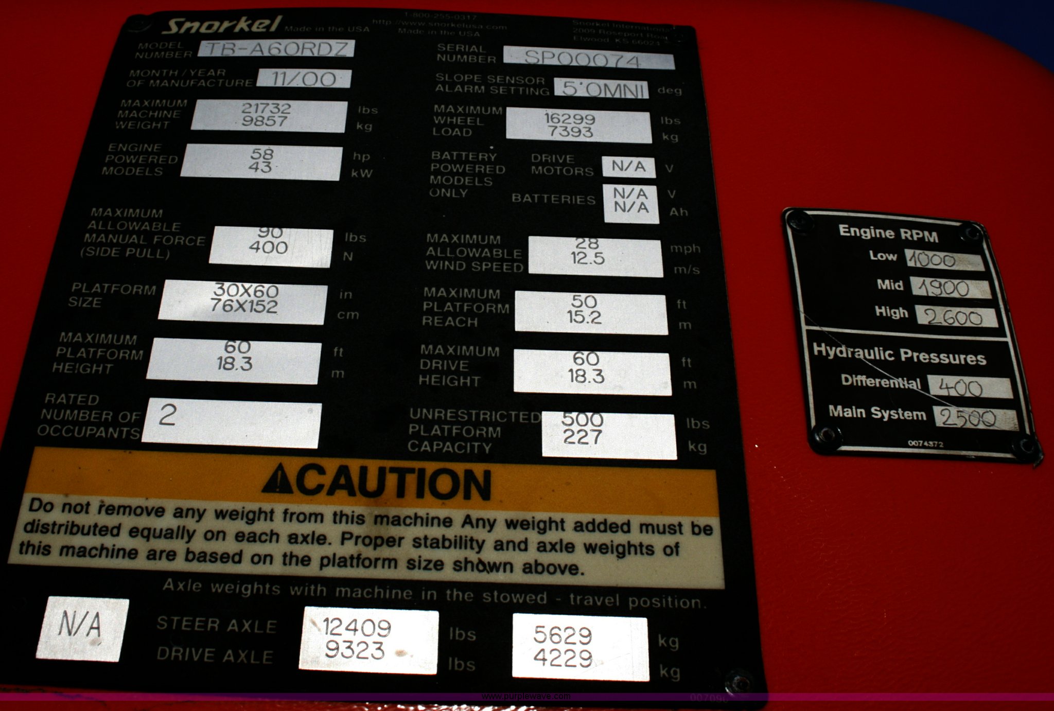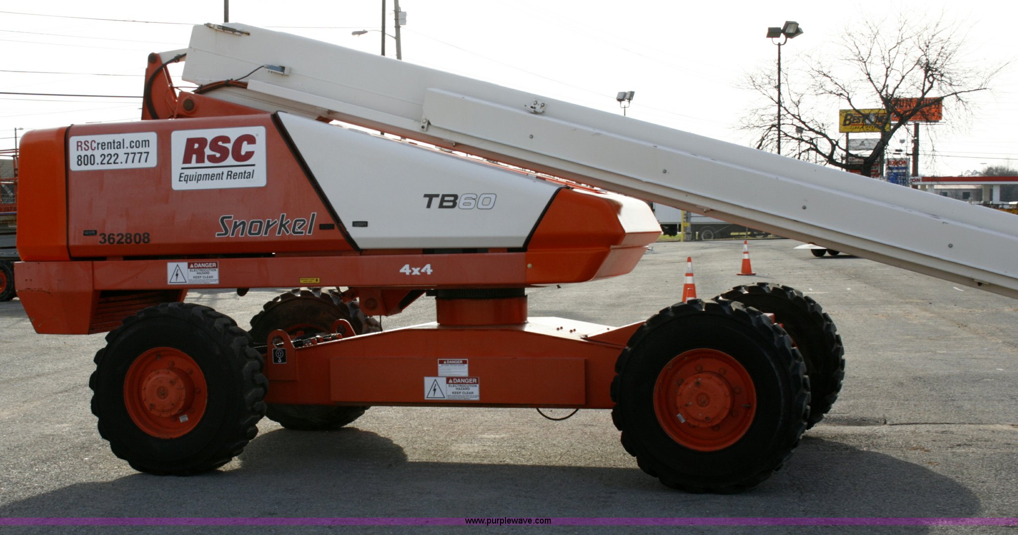 2000 Snorkel TB-A60RDZ boom lift has sold in Knoxville, Tennessee for $8800. Item 6063 sold on December 27th, 2011.