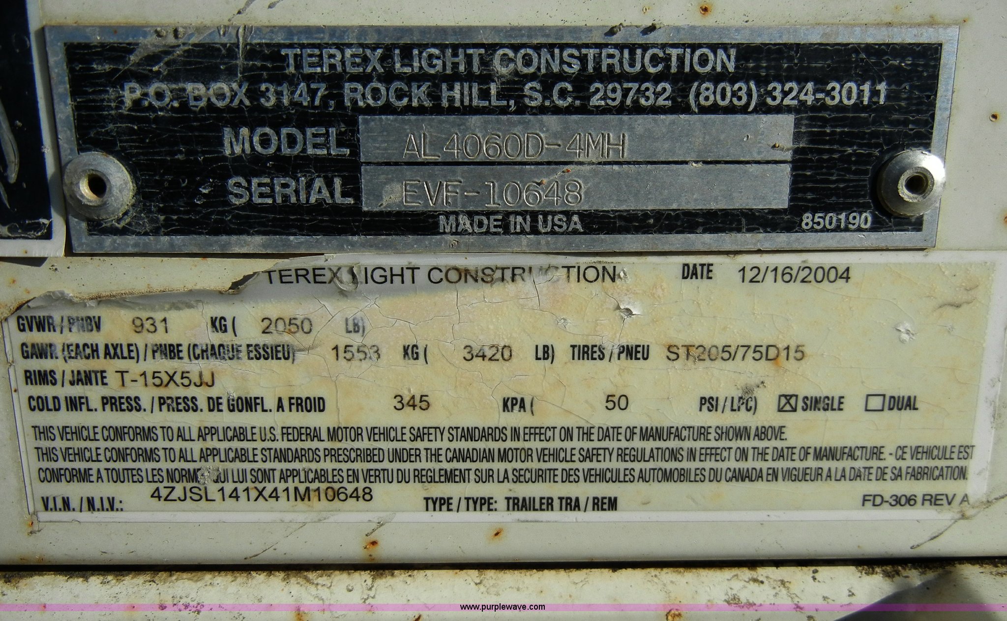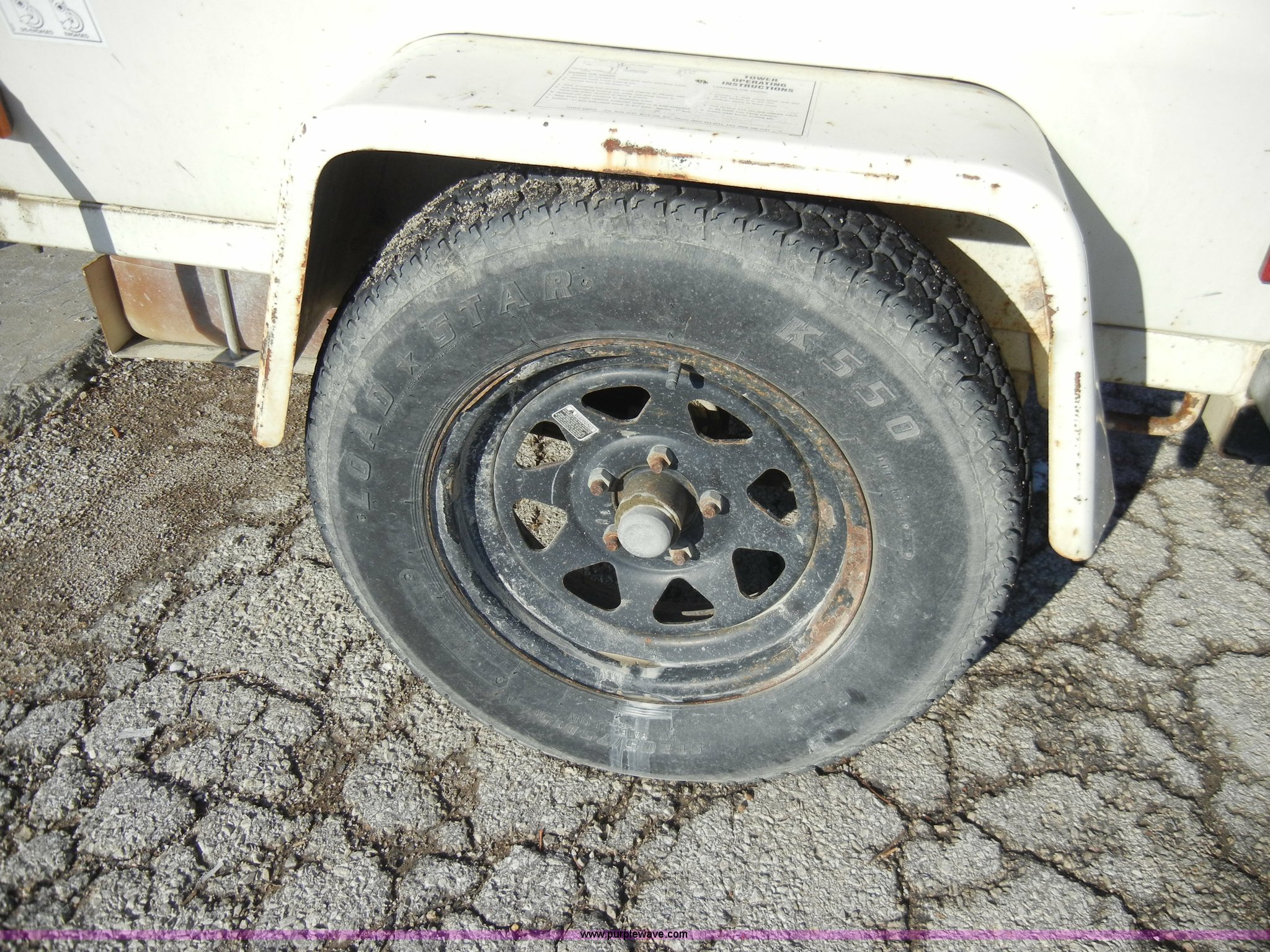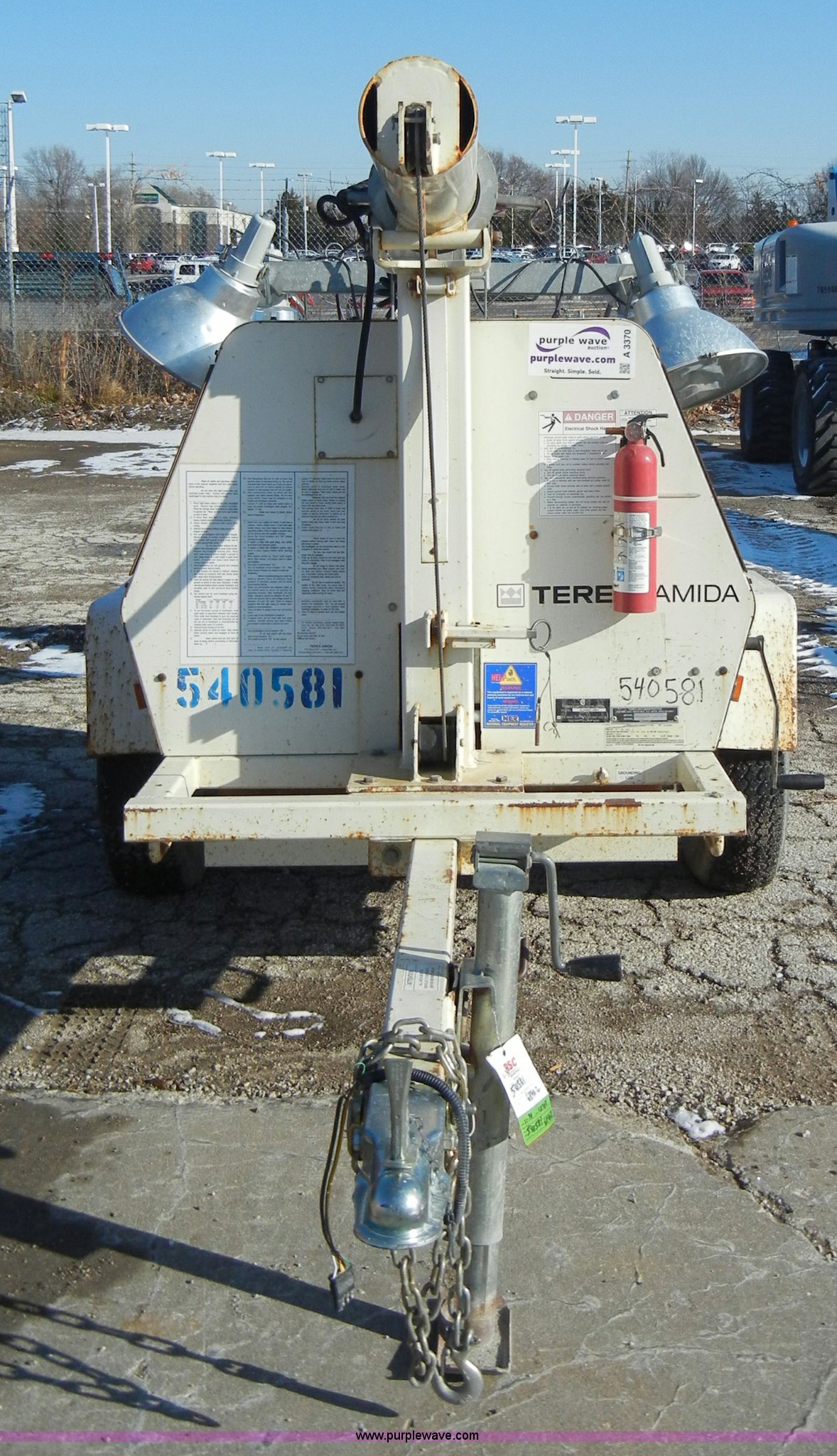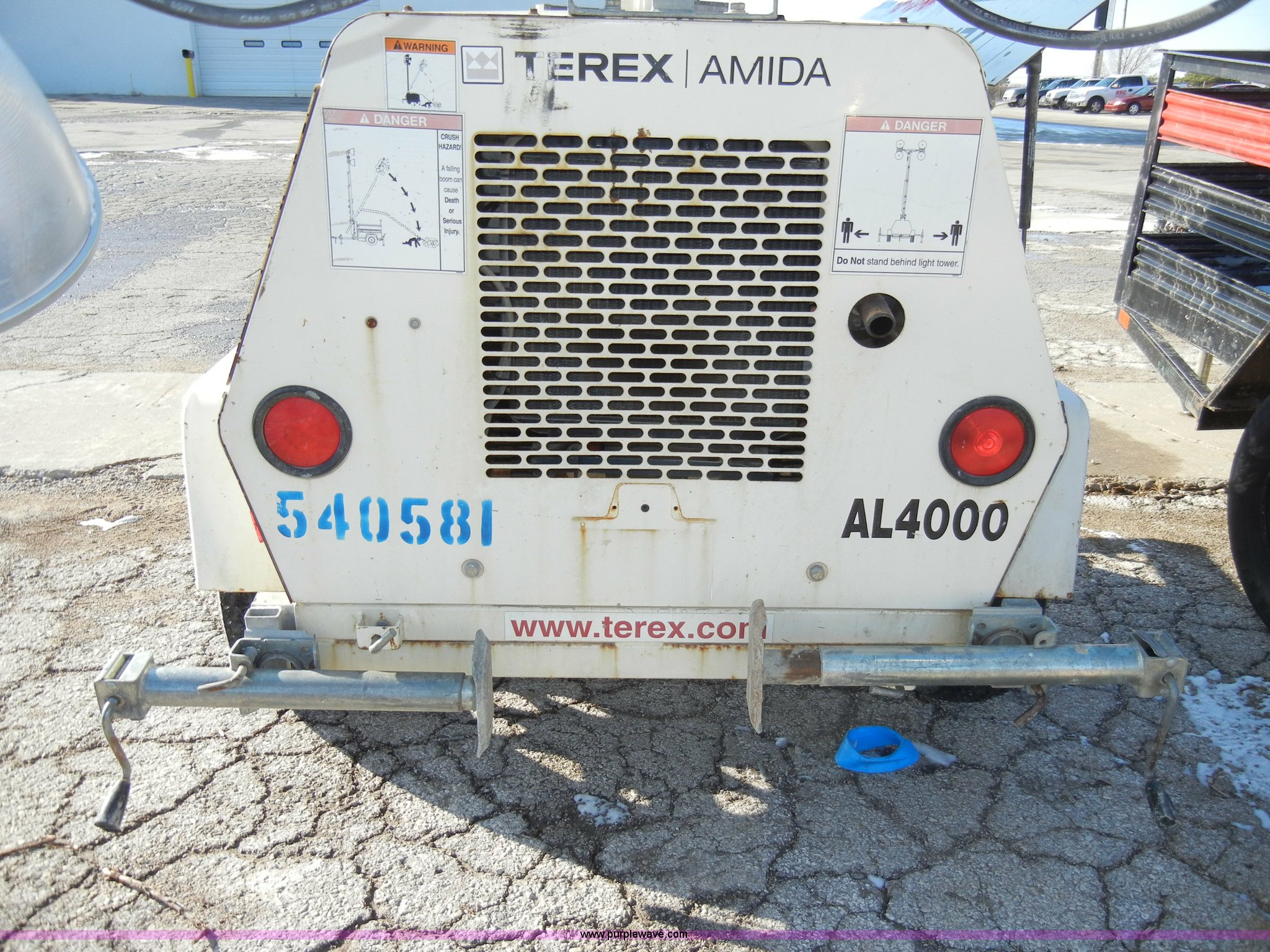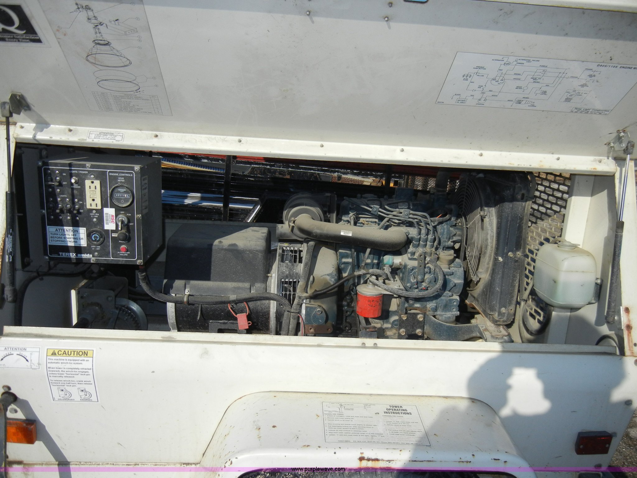 Purple Wave is selling a used Generator Set in Kansas. This item is a 2005 Terex Amida AL4000 towable light tower with the following: 6,840 hours on meter, (4) 1,000 watt lamps, Rear stabilizers, Kubota diesel engine, Model D905-BG-E, Family 4KBXL01.3BCC, 2" ball, Jack, lights, chains, 205/75D15 tires, GVWR 2,050 lbs, Serial EVF-10648, EIN 540581