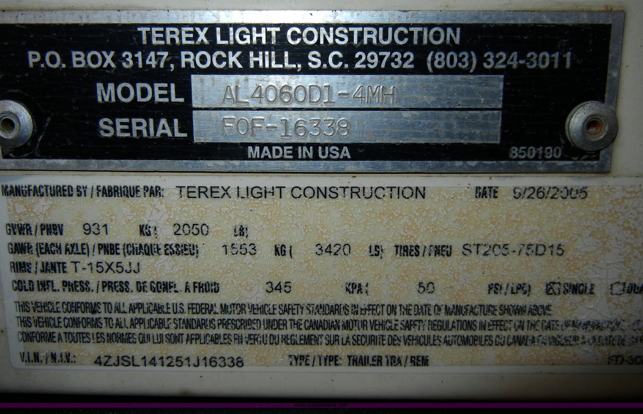 Purple Wave is selling a used Generator Set in Kansas. This item is a 2005 Terex Amida AL4000 towable light tower with the following: 6,683 hours on meter, (4) 1,000 watt lights, Kubota diesel engine, Model D905-BG-ES, Family 5KBXL013BCC, Rear stabilizers, Pintle hitch, Jack, chains, lights, 205/75D15 tires, GVWR 2,050 lbs, Model AL4060D1-4MH, Serial F0F-16338, EIN 599116