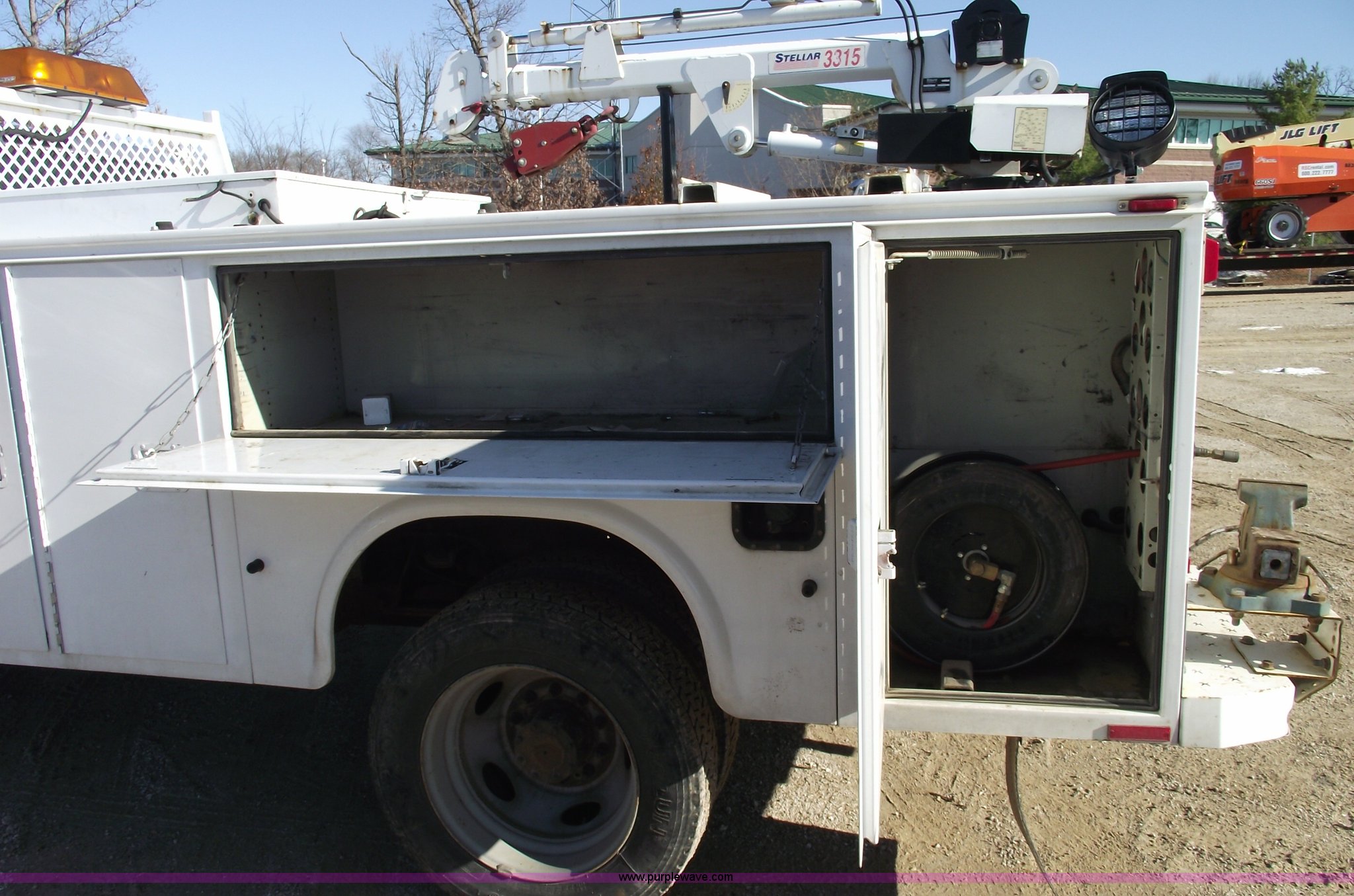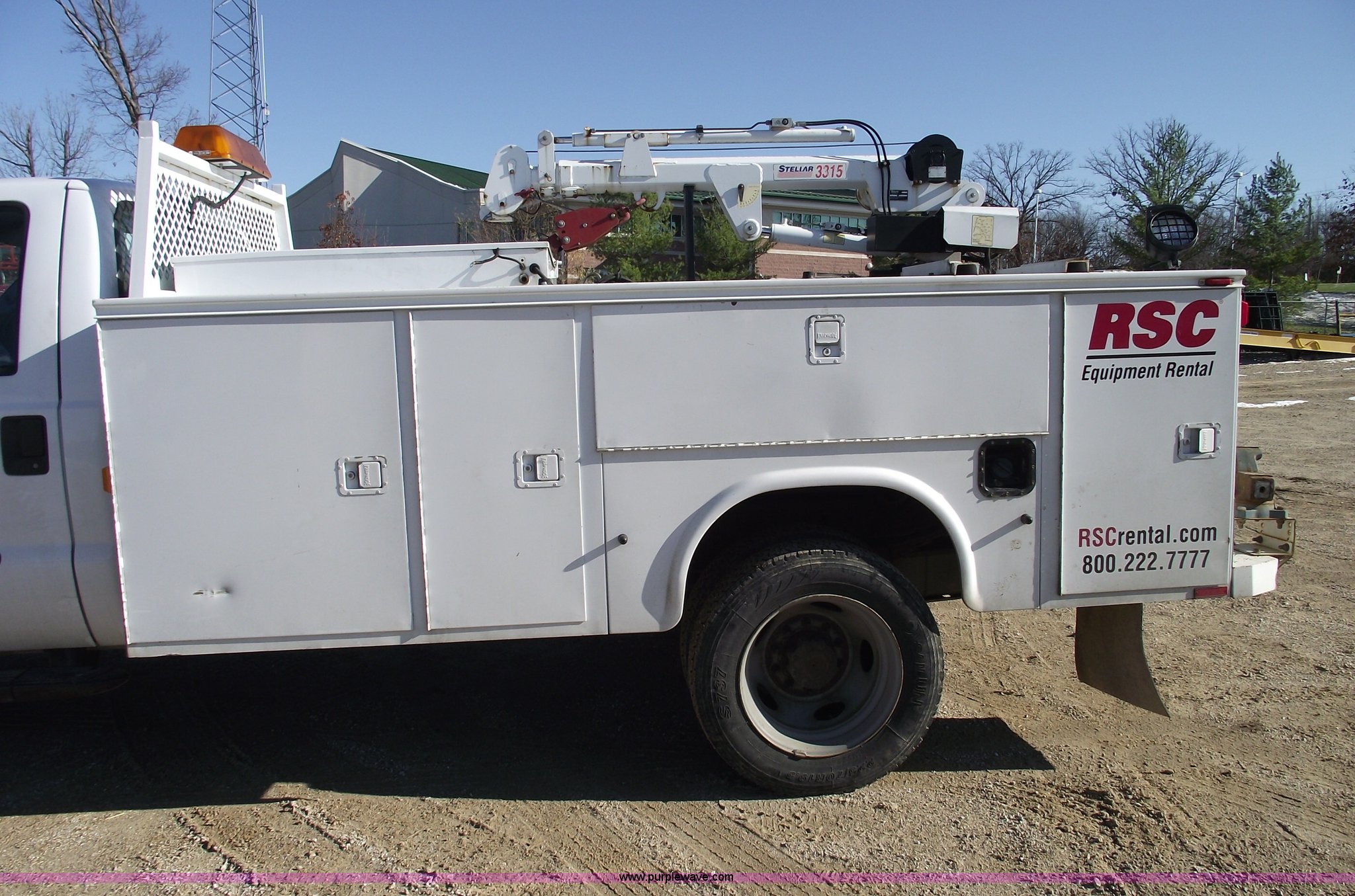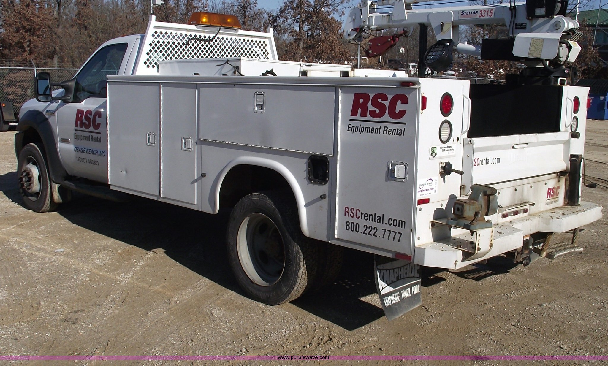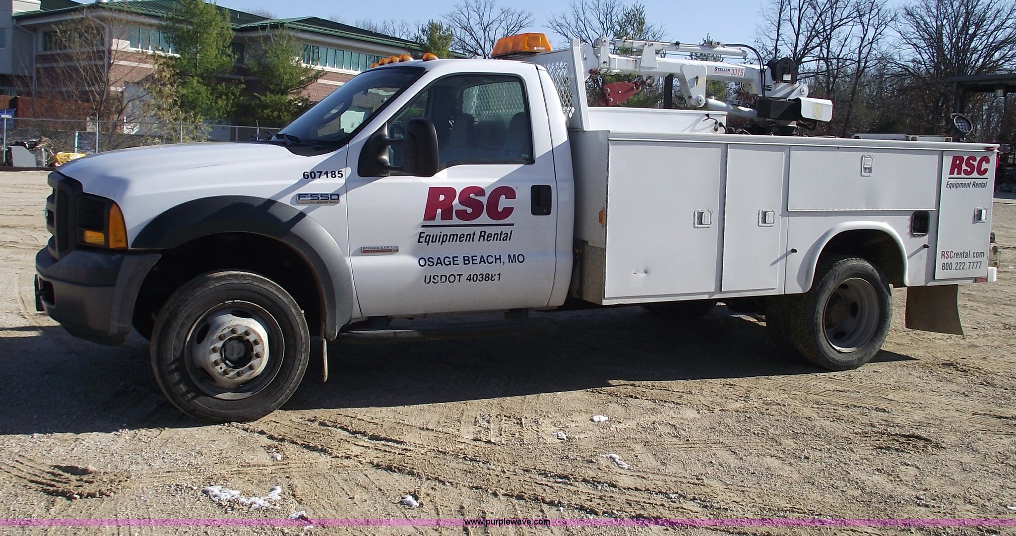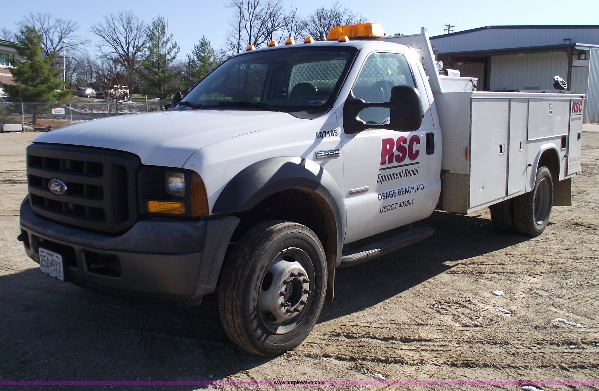 Purple Wave is selling a used Service Truck in Missouri. This item is a 2006 Ford F550 XL Super Duty pickup truck with the following: 139,704 miles on odometer, Mileage will vary, Powerstroke 6.0L V8 diesel engine, Automatic transmission, Four wheel drive, AC and heat, Tilt, Cruise, AM/FM, Manual windows and locks, Vinyl seats, Electric brake controller, Knapheide service bed, Model 6132D54J, Serial 20051110-0000058, (8) compartments, Headache rack, Yellow beacon, Work lights, 5" vise on rear bumper, On board auto lube system, Oil and hydraulic, 30 gallon tank and 30 gallon recovery tank for each, Each have air operated hose reels,, Stellar 3315 AutoCrane, 6,000 lb capacity, 15' reach, Remote control, 50' air hose reel, Nerf bars, Receiver hitch, Trailer wiring, 225/70R19.5 tires, 12 ply, Welder and compressor have been removed, Cracked injector rings, EIN 607185