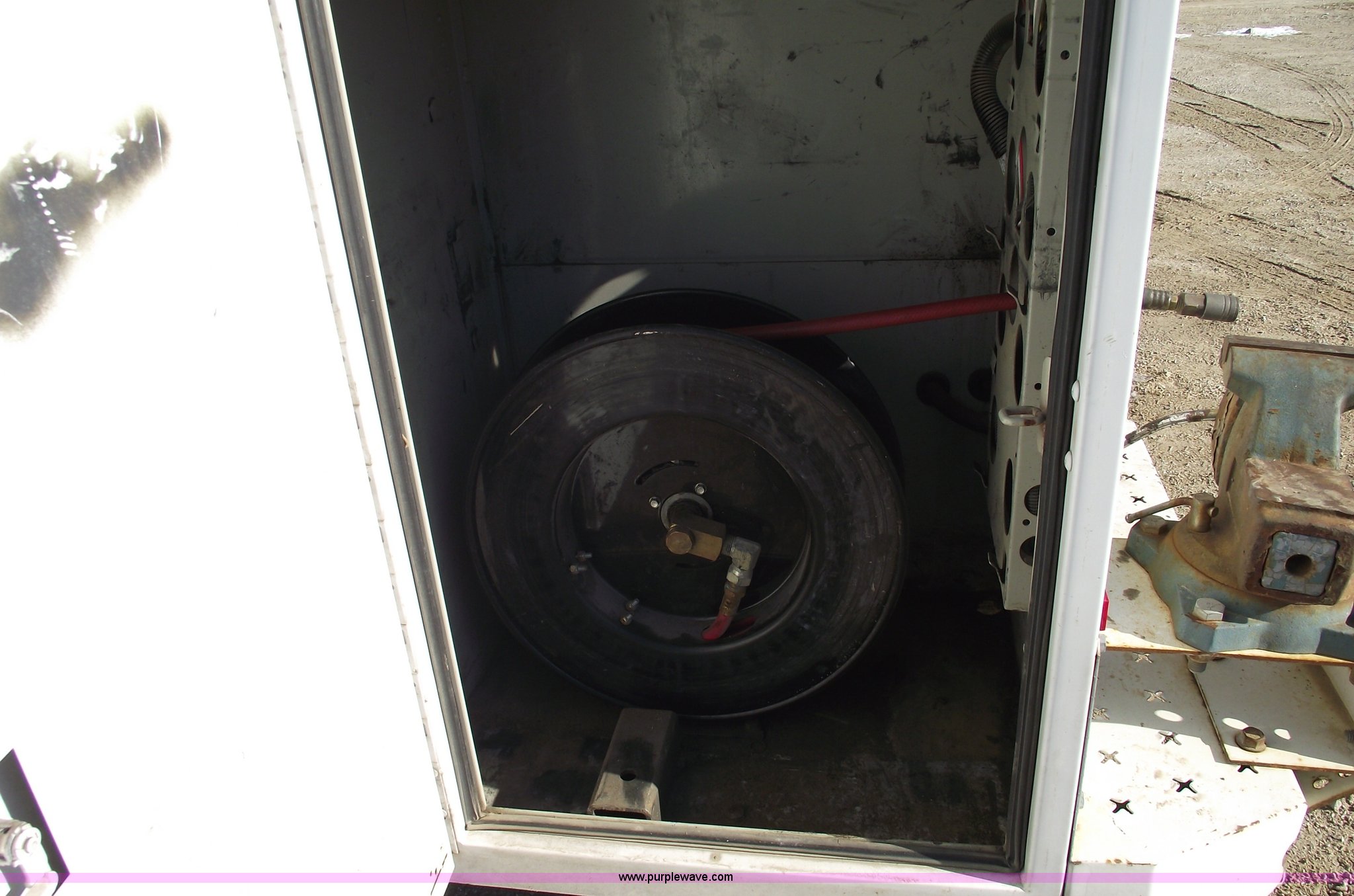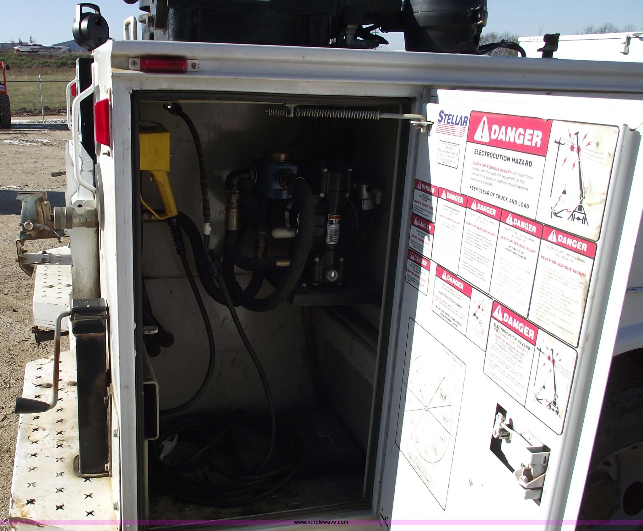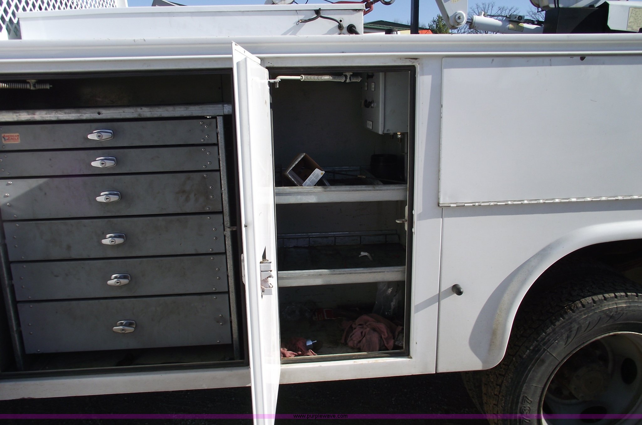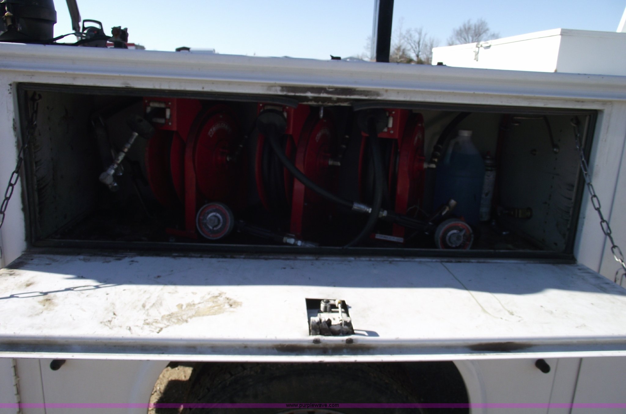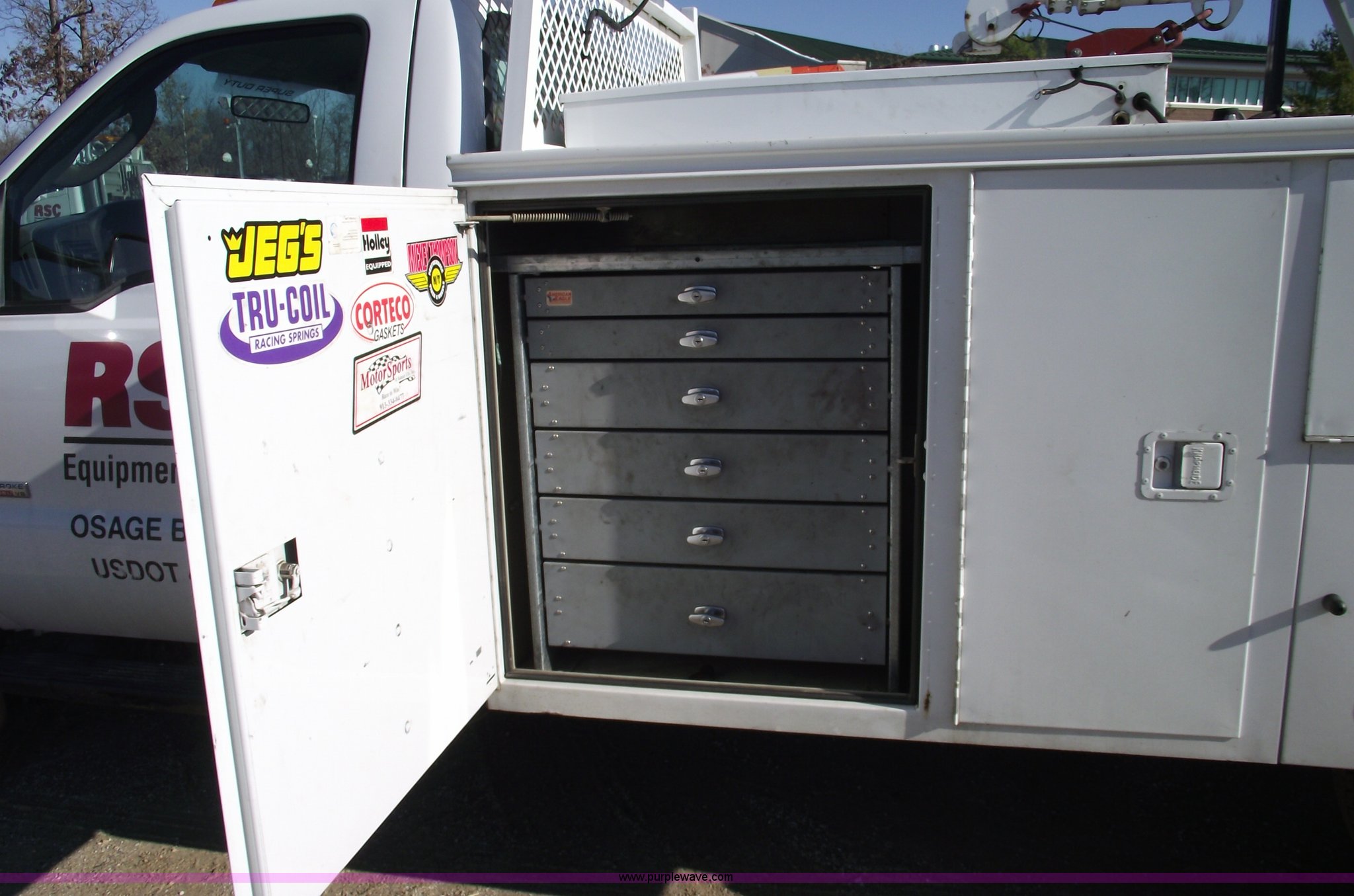 Purple Wave is selling a used Service Truck in Missouri. This item is a 2006 Ford F550 XL Super Duty pickup truck with the following: 139,704 miles on odometer, Mileage will vary, Powerstroke 6.0L V8 diesel engine, Automatic transmission, Four wheel drive, AC and heat, Tilt, Cruise, AM/FM, Manual windows and locks, Vinyl seats, Electric brake controller, Knapheide service bed, Model 6132D54J, Serial 20051110-0000058, (8) compartments, Headache rack, Yellow beacon, Work lights, 5" vise on rear bumper, On board auto lube system, Oil and hydraulic, 30 gallon tank and 30 gallon recovery tank for each, Each have air operated hose reels,, Stellar 3315 AutoCrane, 6,000 lb capacity, 15' reach, Remote control, 50' air hose reel, Nerf bars, Receiver hitch, Trailer wiring, 225/70R19.5 tires, 12 ply, Welder and compressor have been removed, Cracked injector rings, EIN 607185