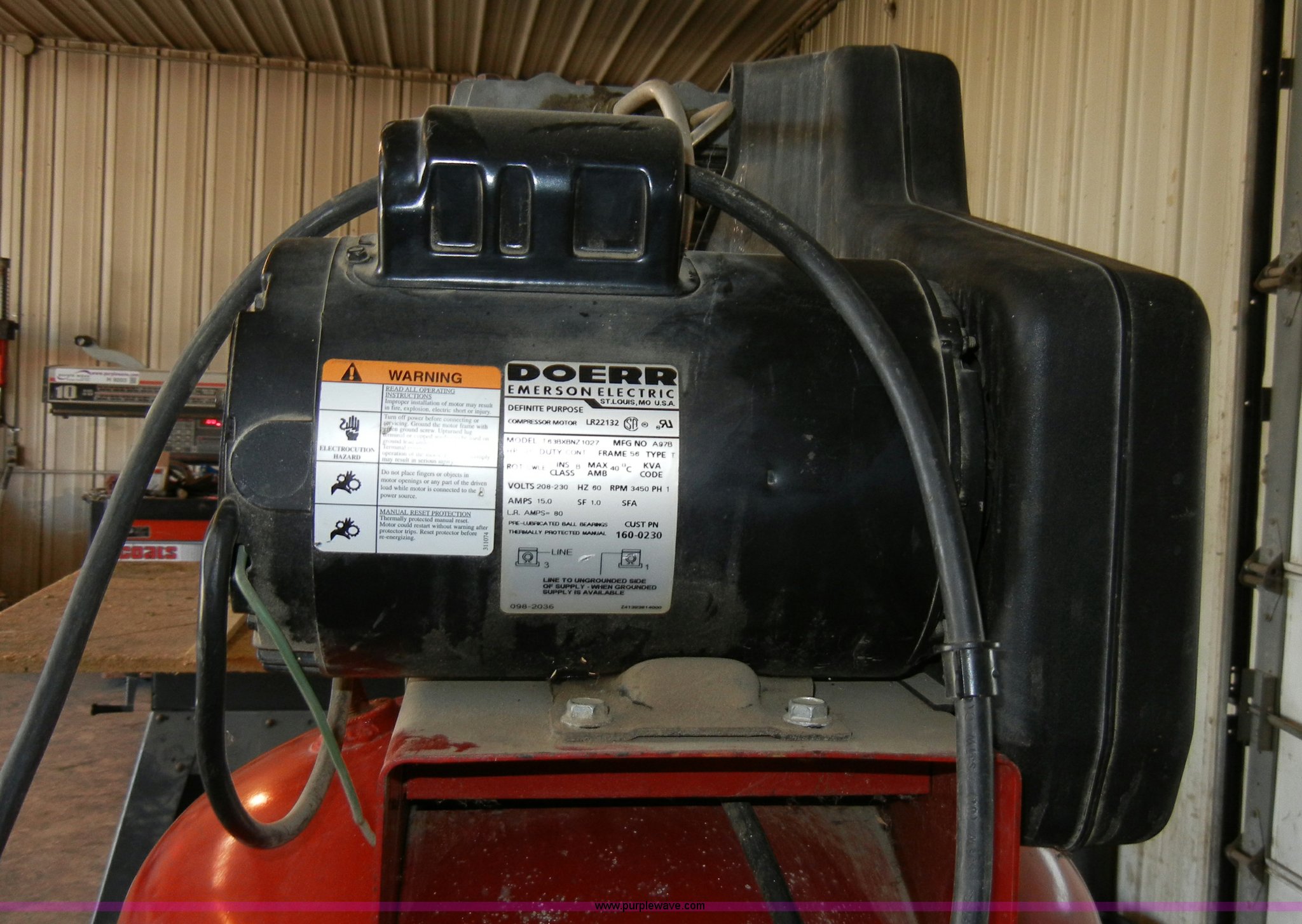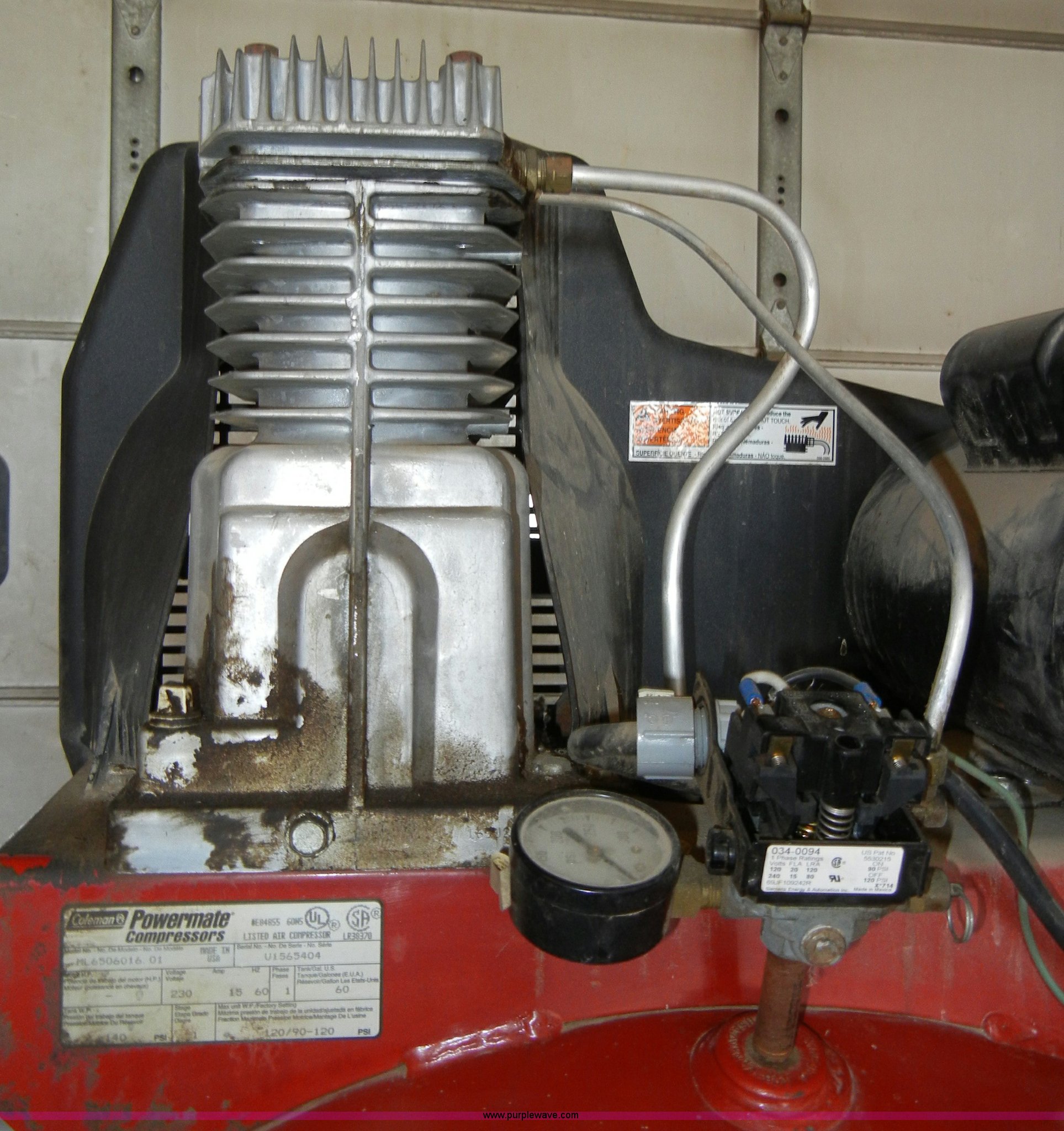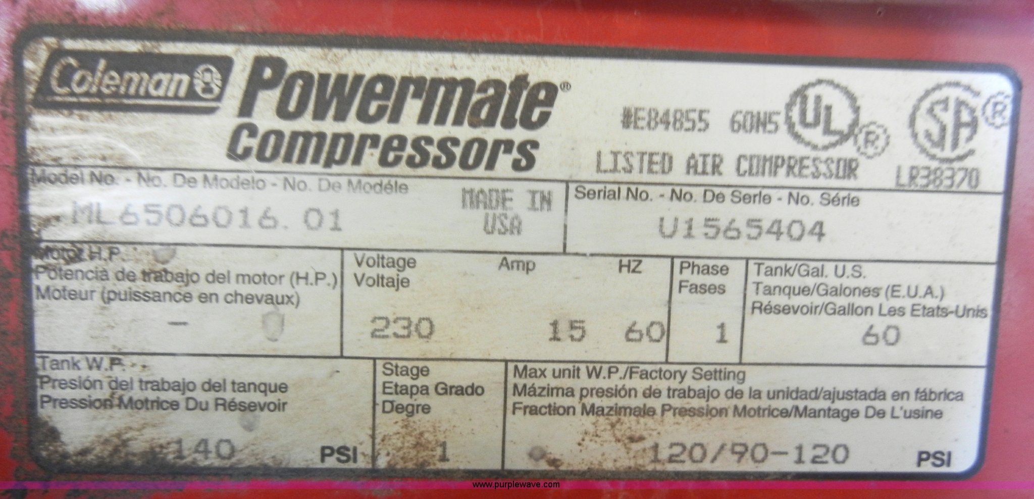 Purple Wave is selling a used Air Compressor in Kansas. This item is a Coleman Magna Force 60 gallon air compressor with the following: Single phase, 140 psi, Model ML6506016.01, Serial V1565404