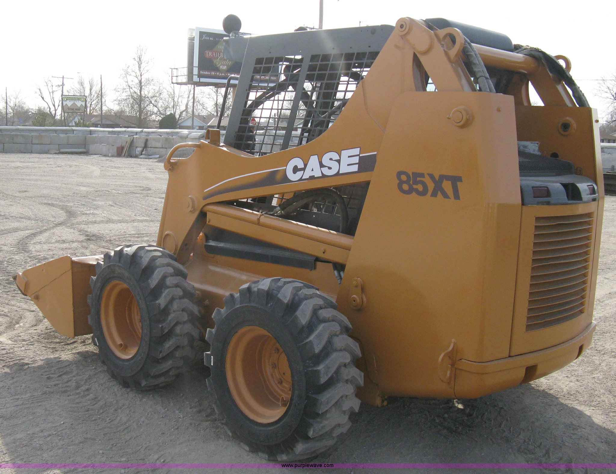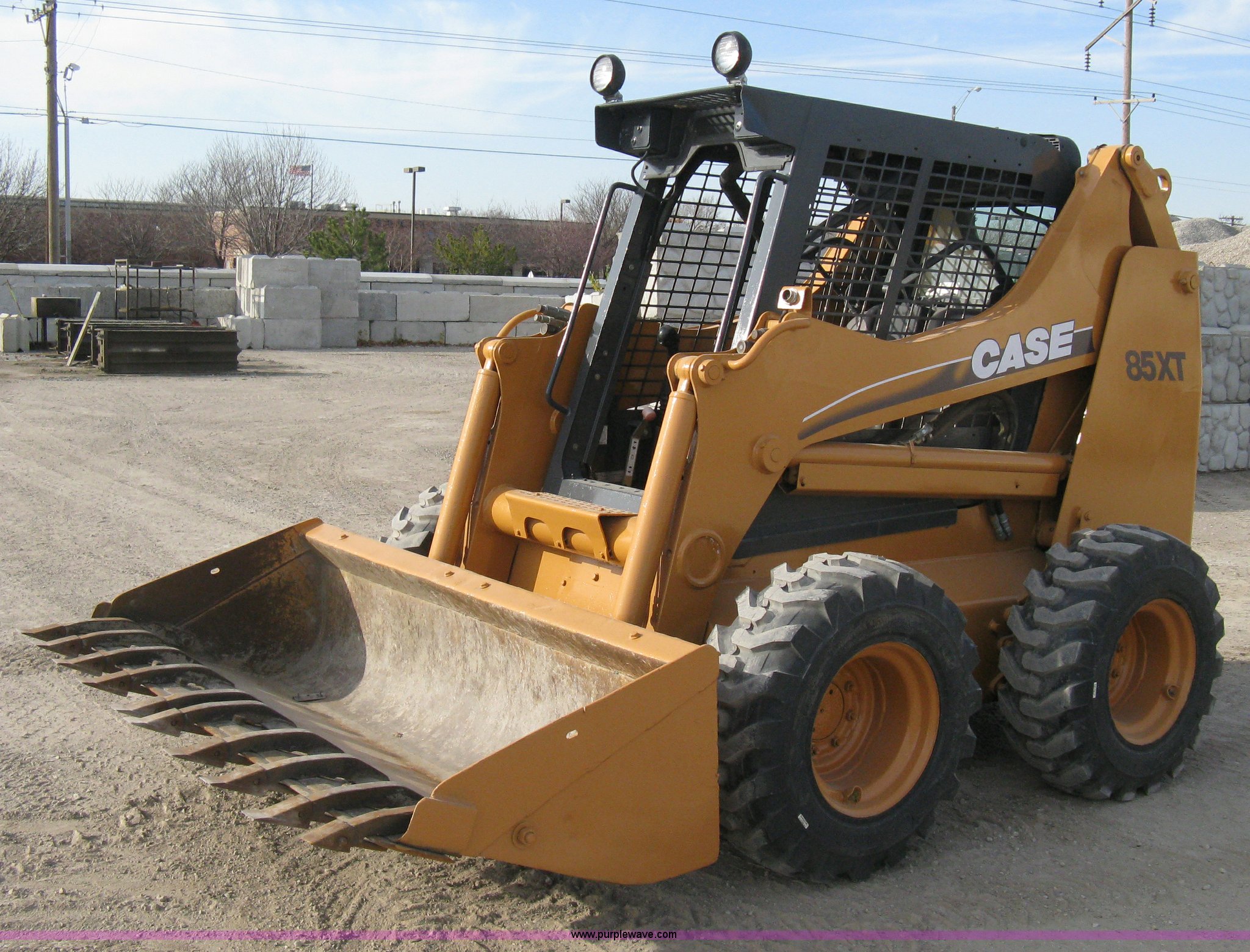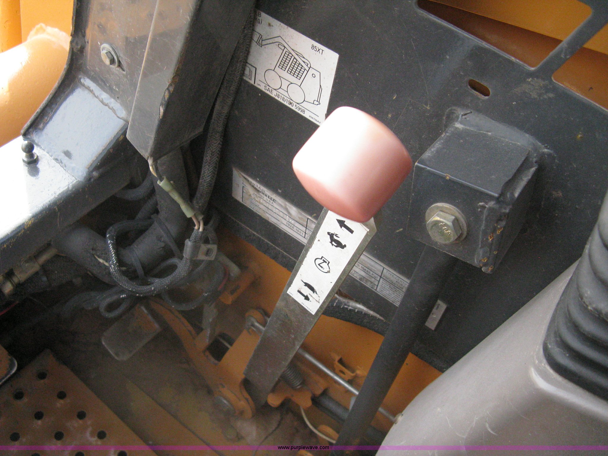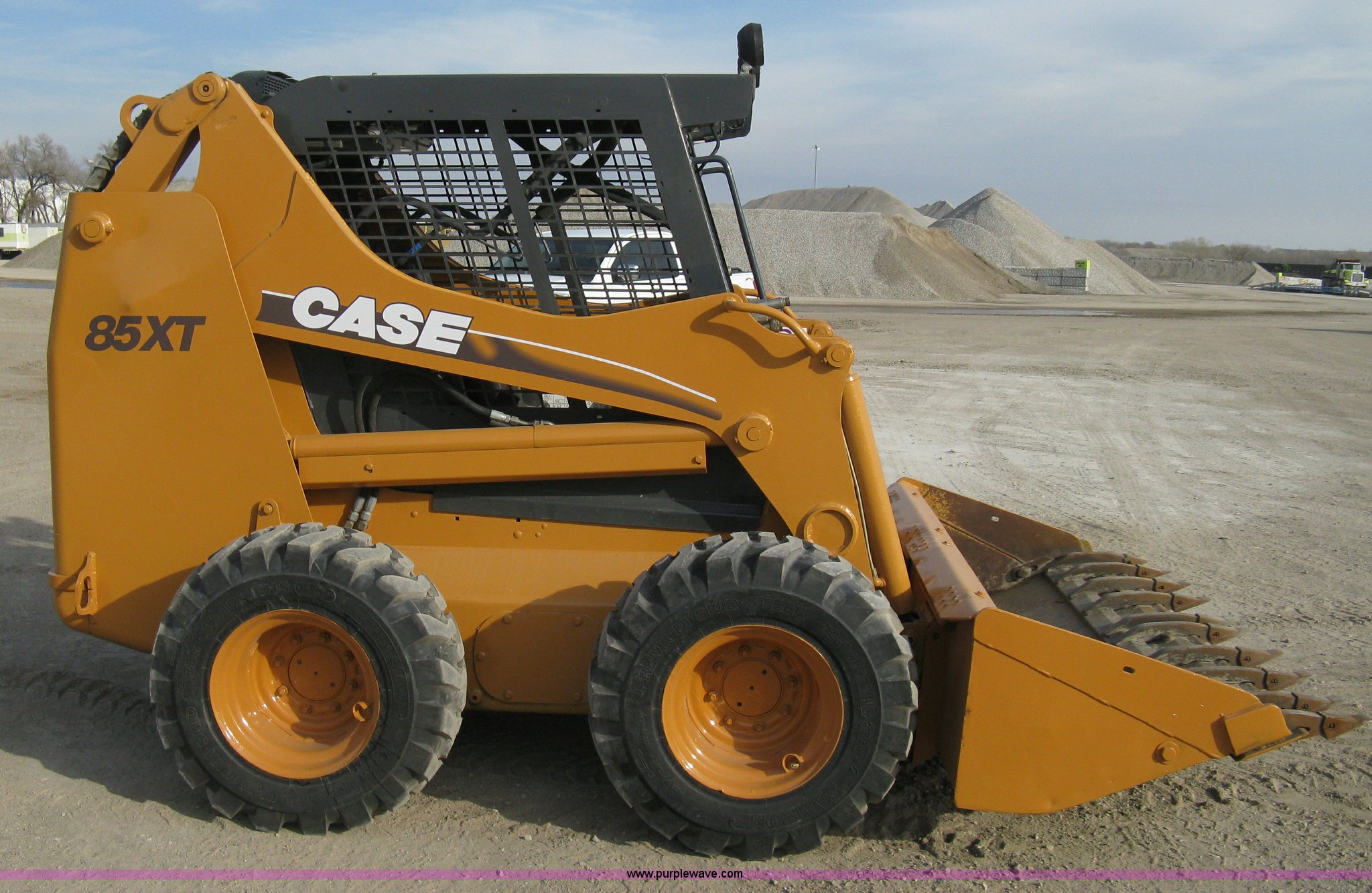 Purple Wave is selling a used Skid Steer Loader in Kansas. This item is a 2004 Case 85XT-HG skid steer with the following: 4,116 hours on meter, Four cylinder diesel engine, OROPS, 82" bucket, Bolt-on toothed bar, Bolt-on edge, Loader joystick hand control, (5) auxiliary hydraulic remotes, Electric remote, Key start converted to switch in security box, Work lights, New 12-16.5NHS tires, Serial JAF411745