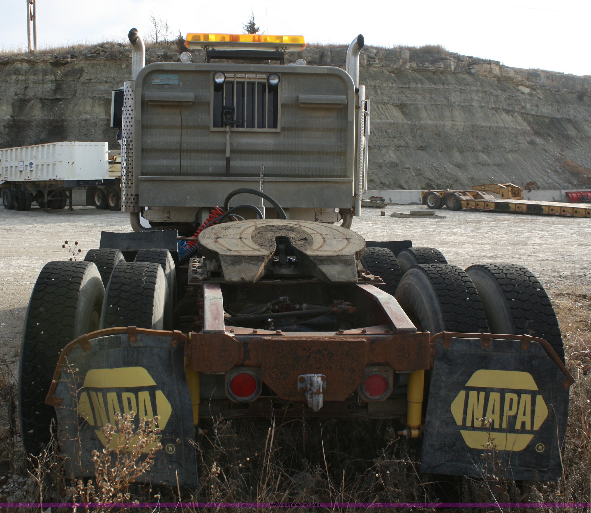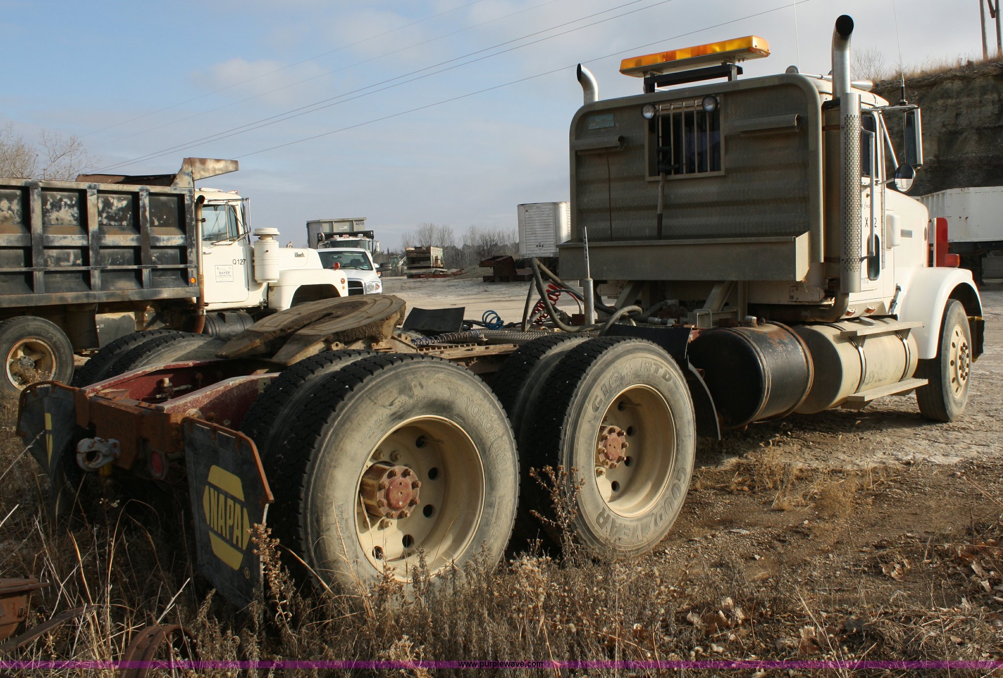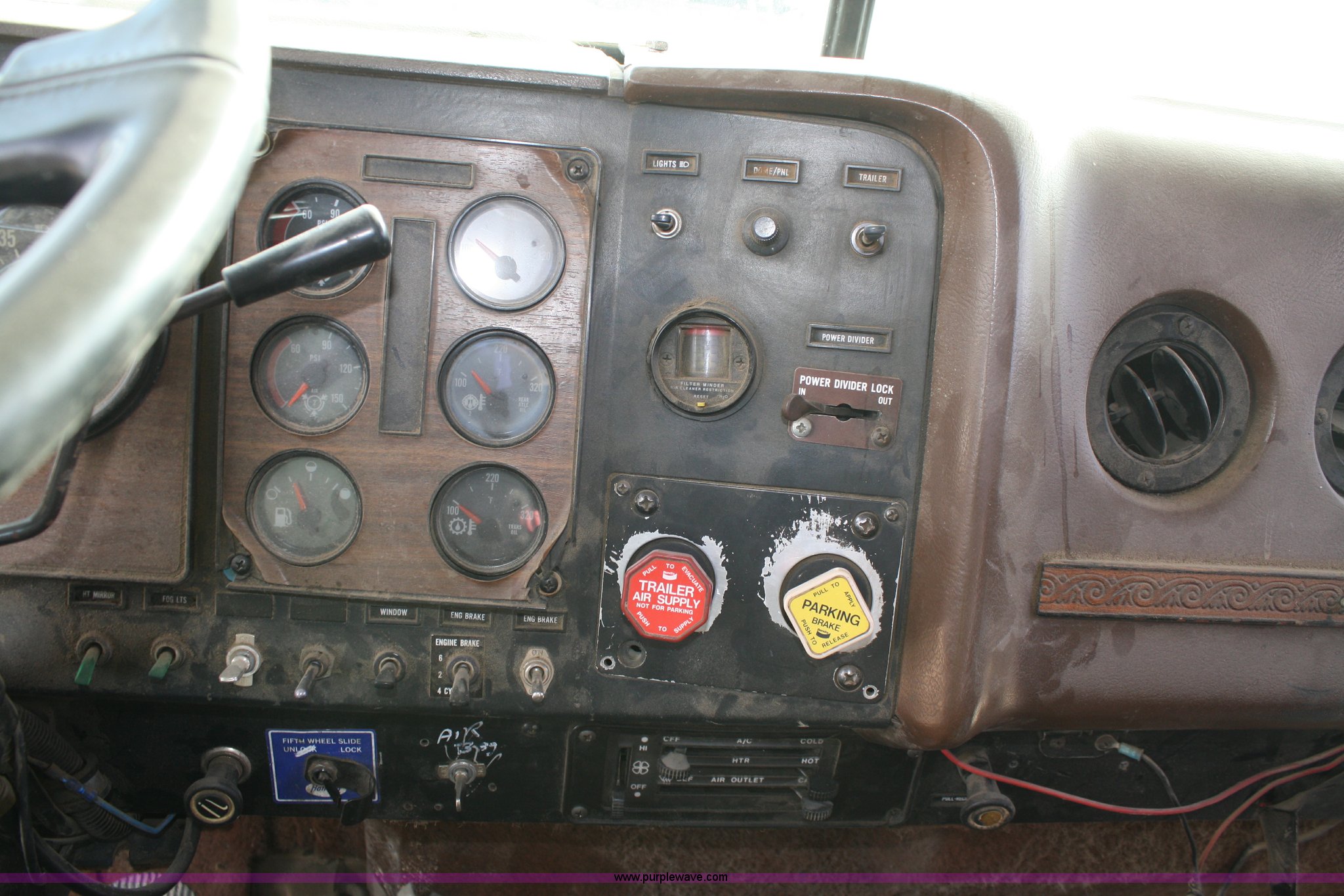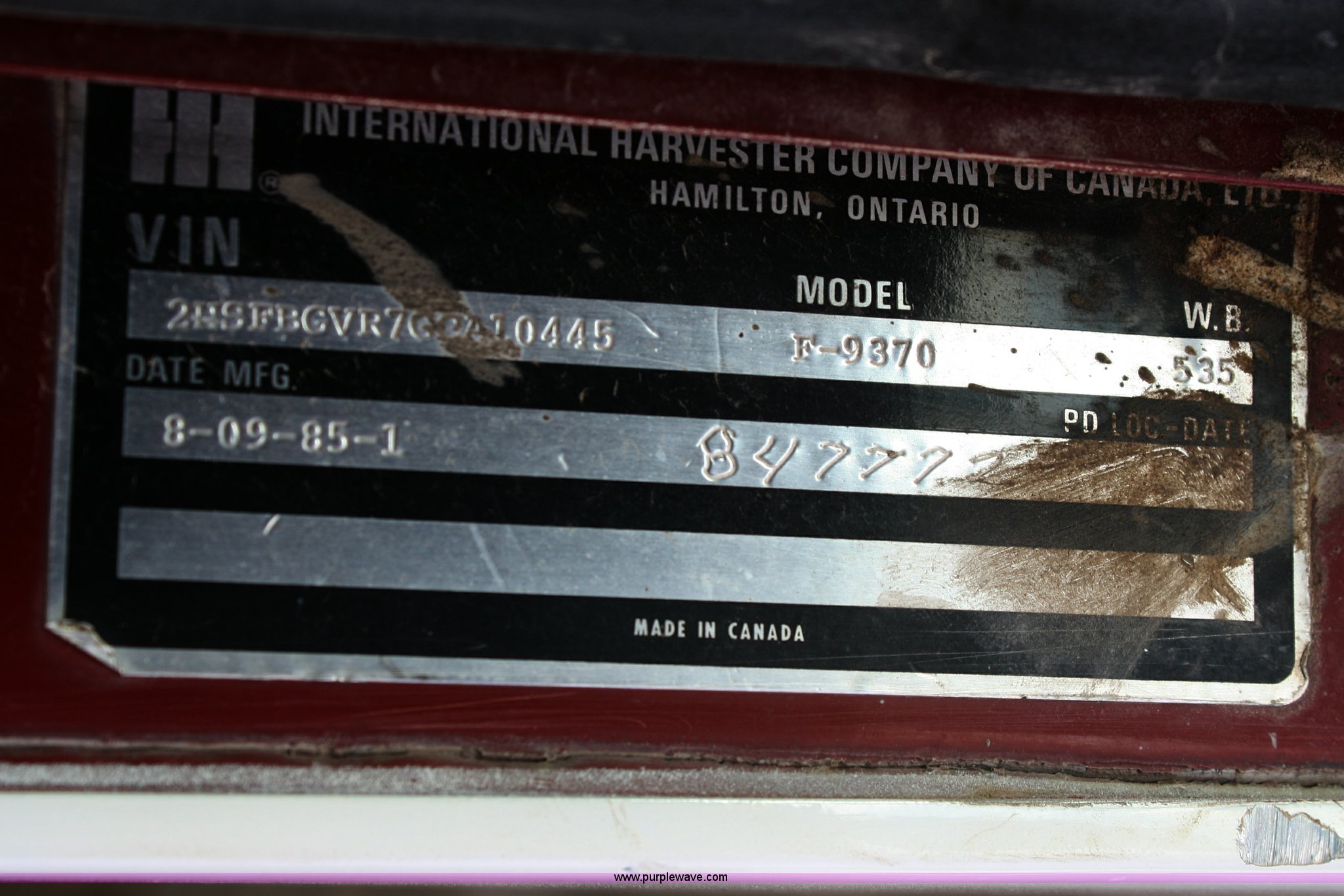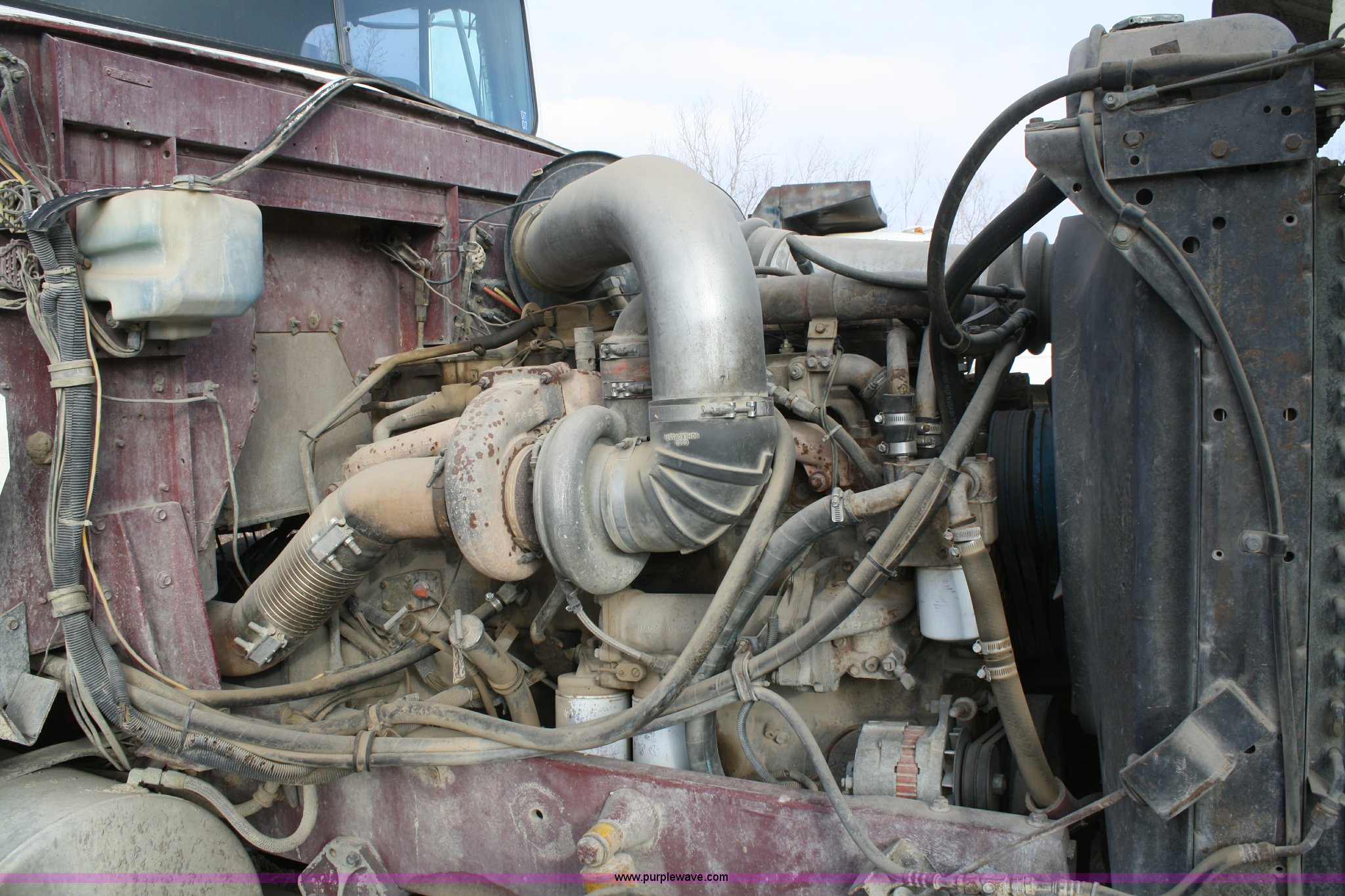 Purple Wave is selling a used Construction Dump Truck in Kansas. This item is a 1986 International F9370 semi truck with the following: 77,350 miles on odometer, Cummins N14 14.0L diesel engine, 400 HP, Eaton Fuller 13 speed manual transmission, Twin screw, AC and heat, Air ride seat, Dual 100 gallon fuel tanks, Dual rear exhaust stacks, Aluminum deck plate, Headache rack, Plastic quarter fenders, PTO, Wet kit, Air suspension, Air brakes, Jake brake, Brake controller, 11R24.5 tires, Engine has overheating issues, ID# X82