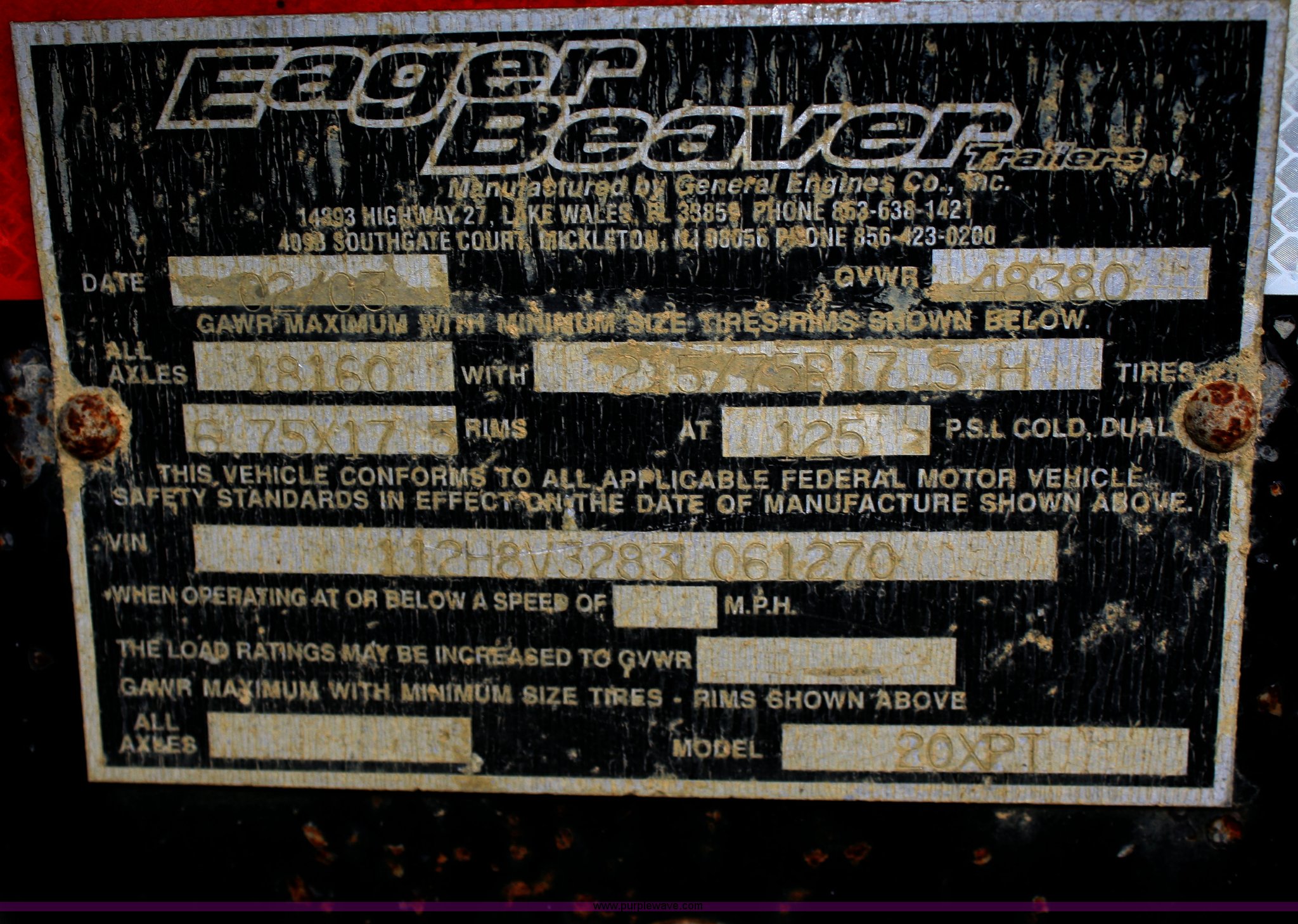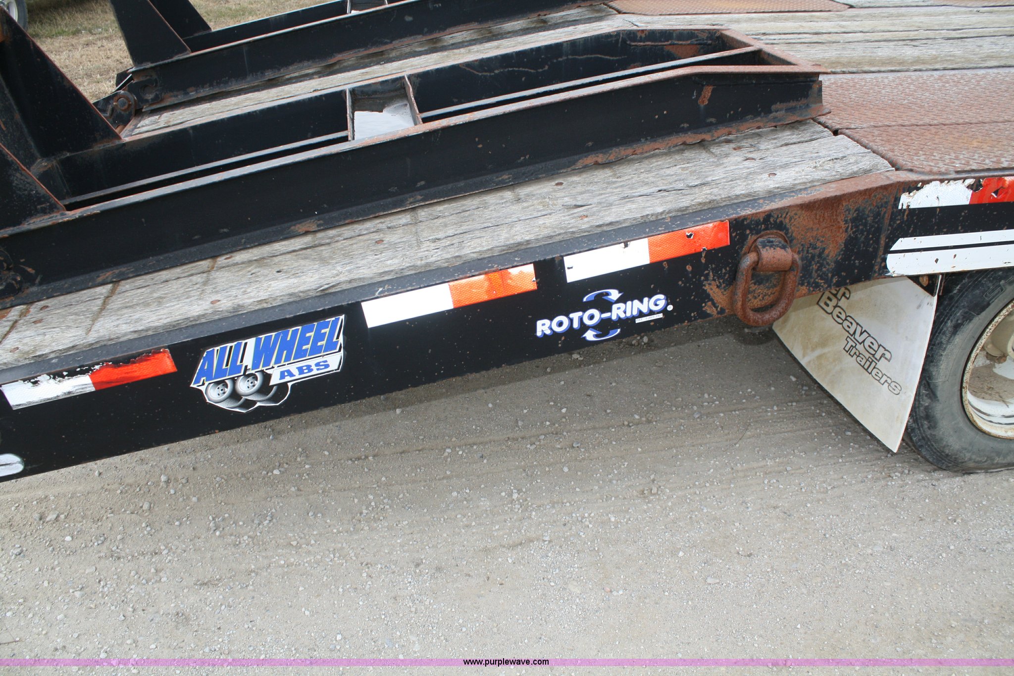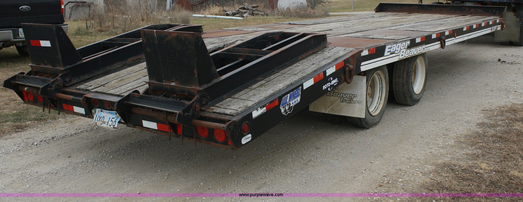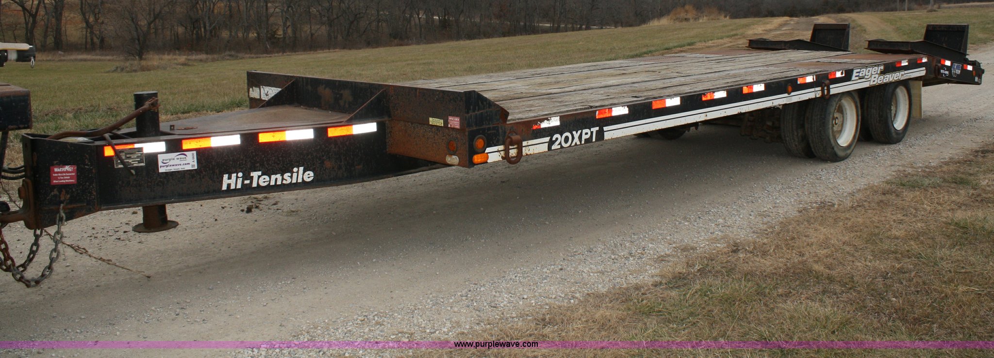Purple Wave is selling a used Equip. Trailer in Kansas. This item is a 2003 Eager Beaver 20XPT tandem axle trailer with the following: GVWR 48,380 lbs, 21'L x 102"W deck, 6' tail, 6' steel flip over spring assist ramps, (6) D-rings, ABS brakes, Air brakes, Pintle hitch, Tongue storage compartment, 215/75R17.5 tires, Approx. 600 miles on tires