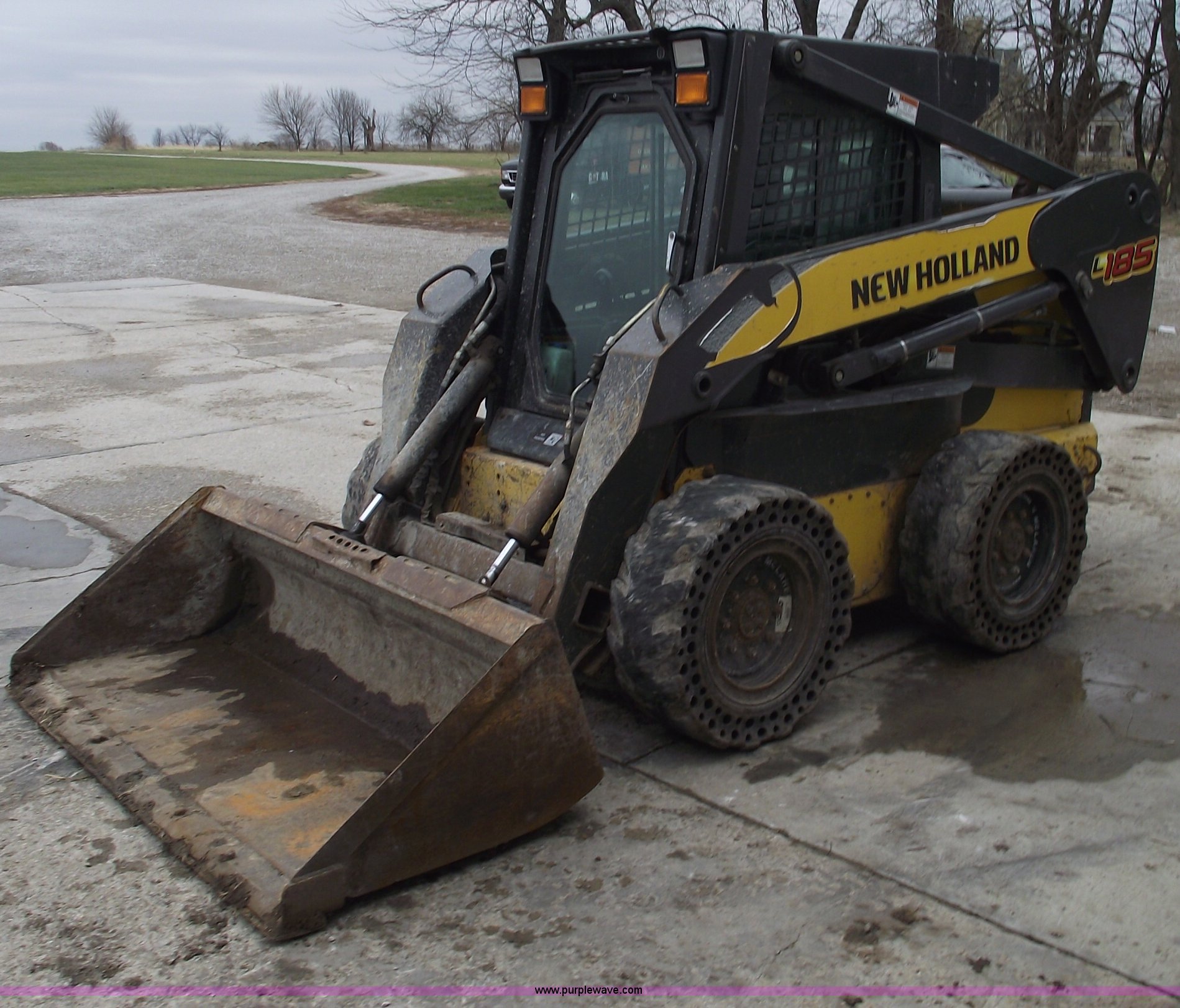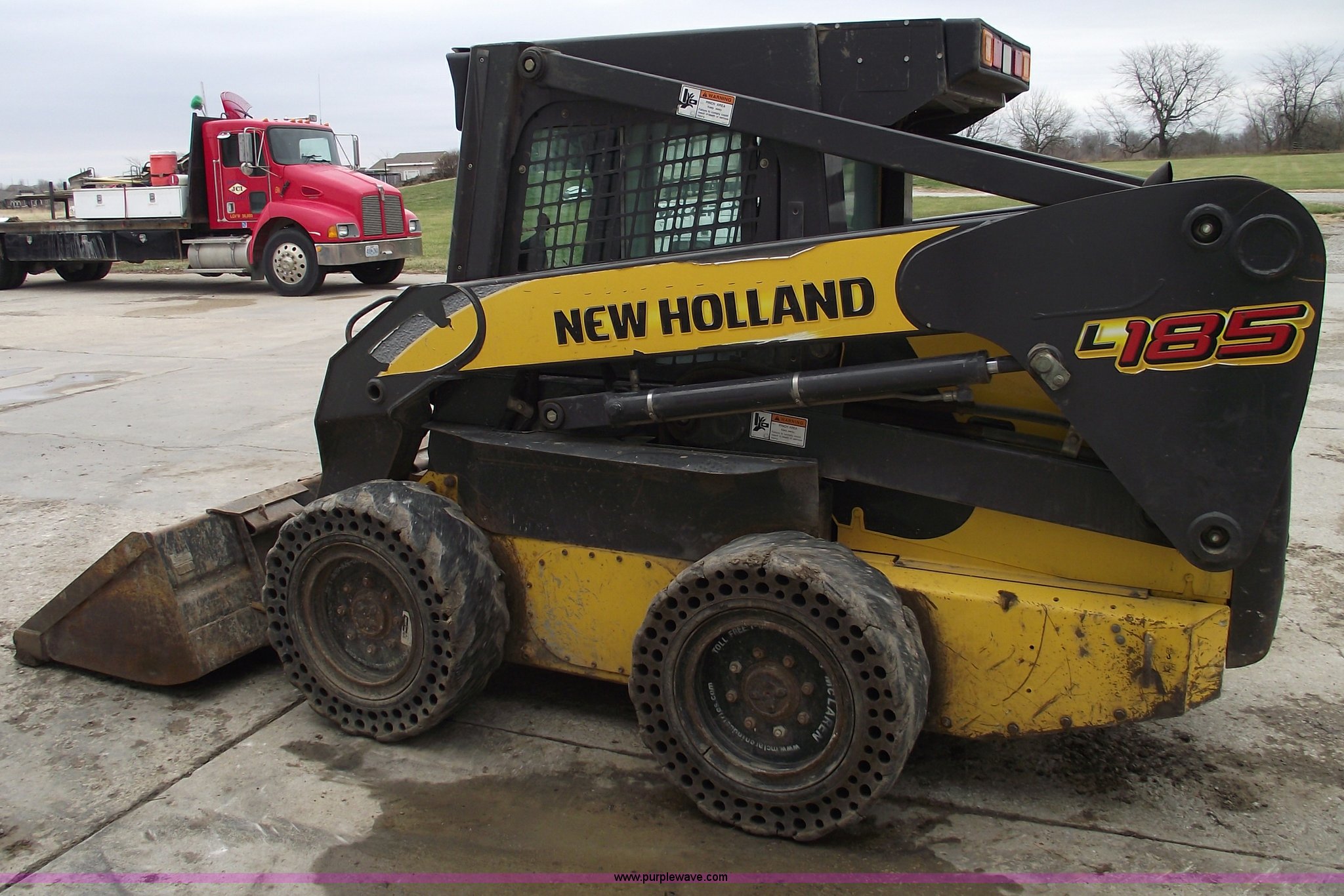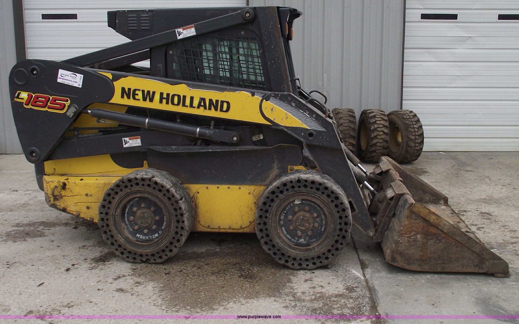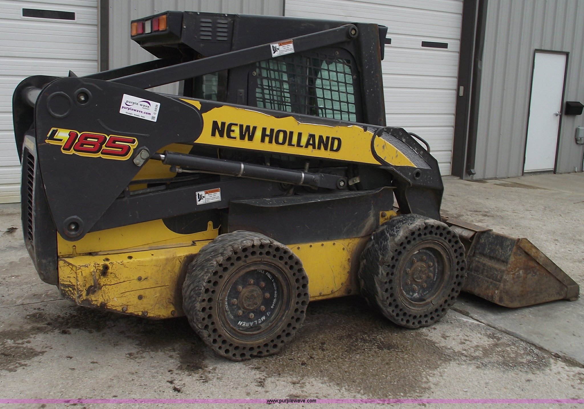 Purple Wave is selling a used Skid Steer Loader in Missouri. This item is a 2005 New Holland L185 skid steer with the following: 1,714 hours on meter, New Holland four cylinder turbo diesel engine, 83 HP, Cab with AC and heat, Bucket foot controls, 72" smooth bucket with bolt-on cutting edge, Auxiliary hydraulics, 2,500 lb rated operating capacity, 7,100 lbs. base operating weight, Owners manual, Nu-Air 12" 33x12-16 RC604DL tires, (4) extra wheels and tires included, 12x16.5, (3) foam filled, Serial N6M435300