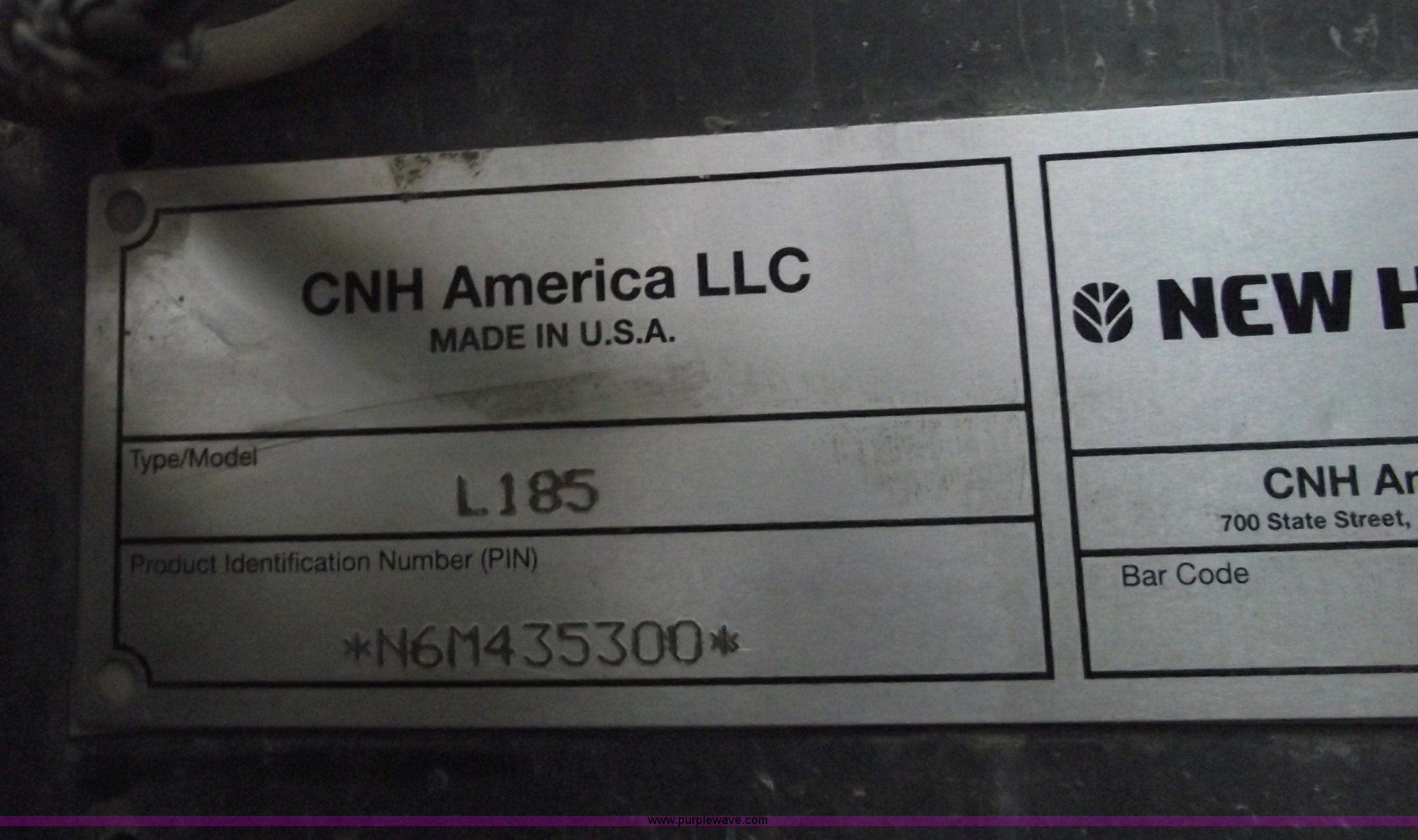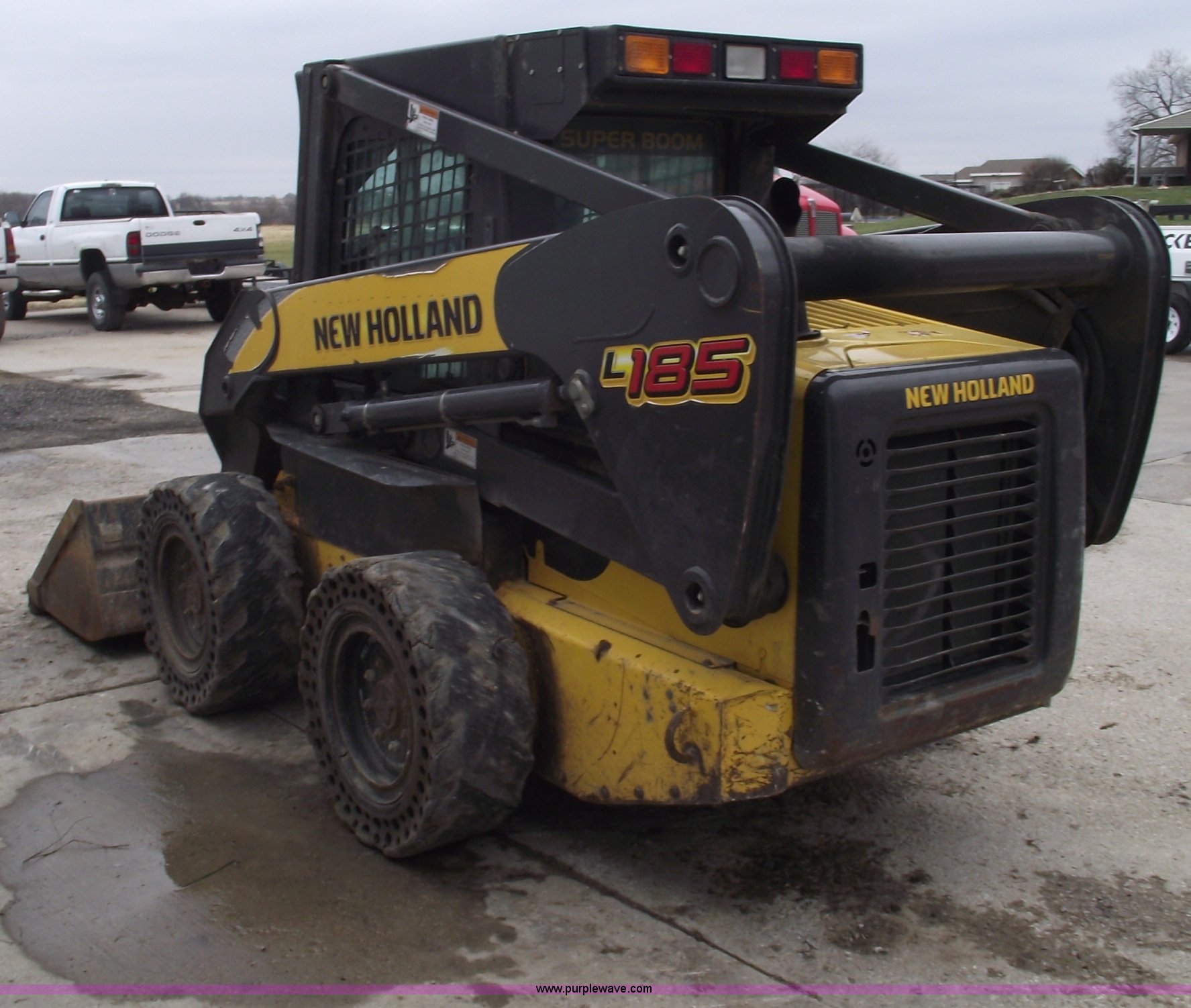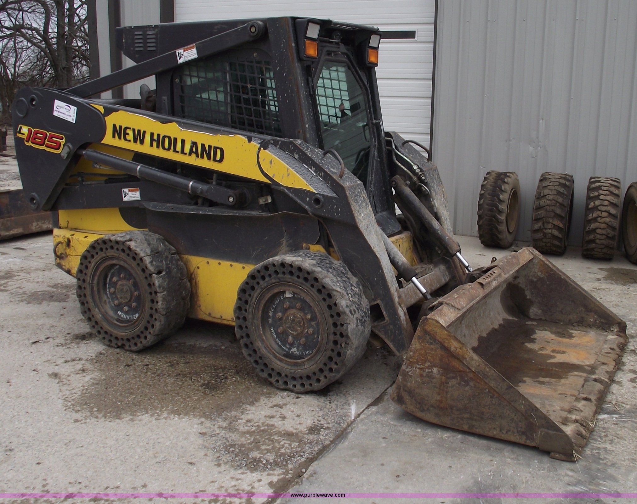 Purple Wave is selling a used Skid Steer Loader in Missouri. This item is a 2005 New Holland L185 skid steer with the following: 1,714 hours on meter, New Holland four cylinder turbo diesel engine, 83 HP, Cab with AC and heat, Bucket foot controls, 72" smooth bucket with bolt-on cutting edge, Auxiliary hydraulics, 2,500 lb rated operating capacity, 7,100 lbs. base operating weight, Owners manual, Nu-Air 12" 33x12-16 RC604DL tires, (4) extra wheels and tires included, 12x16.5, (3) foam filled, Serial N6M435300