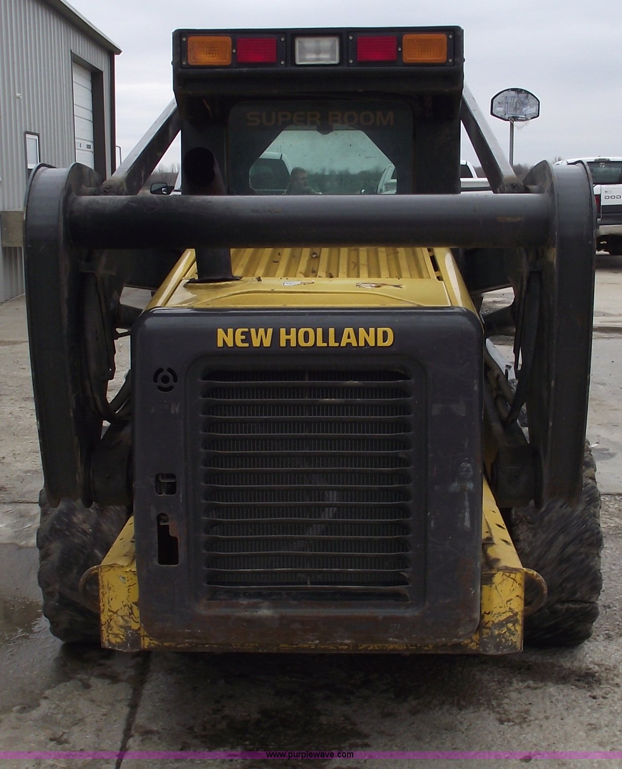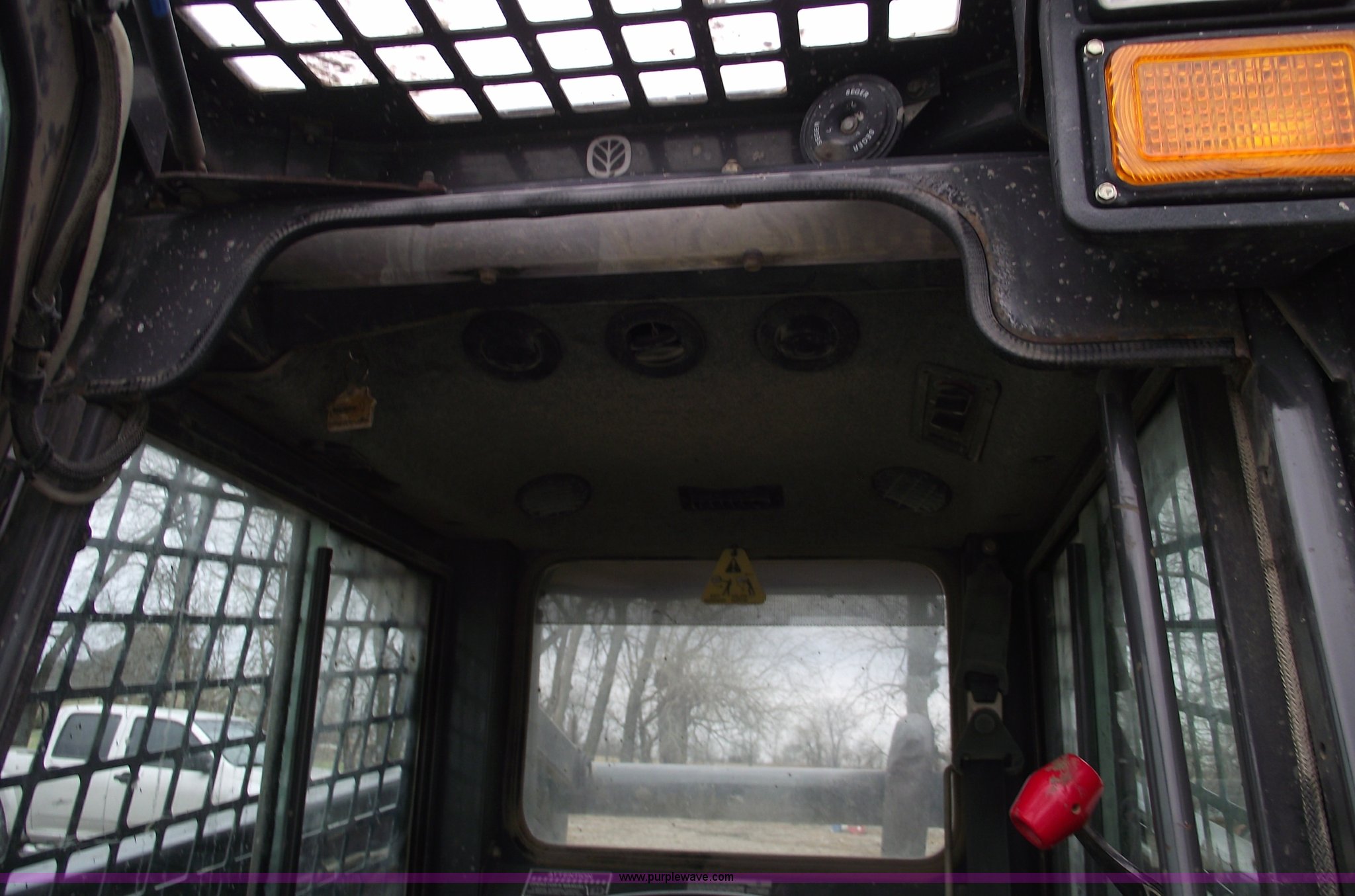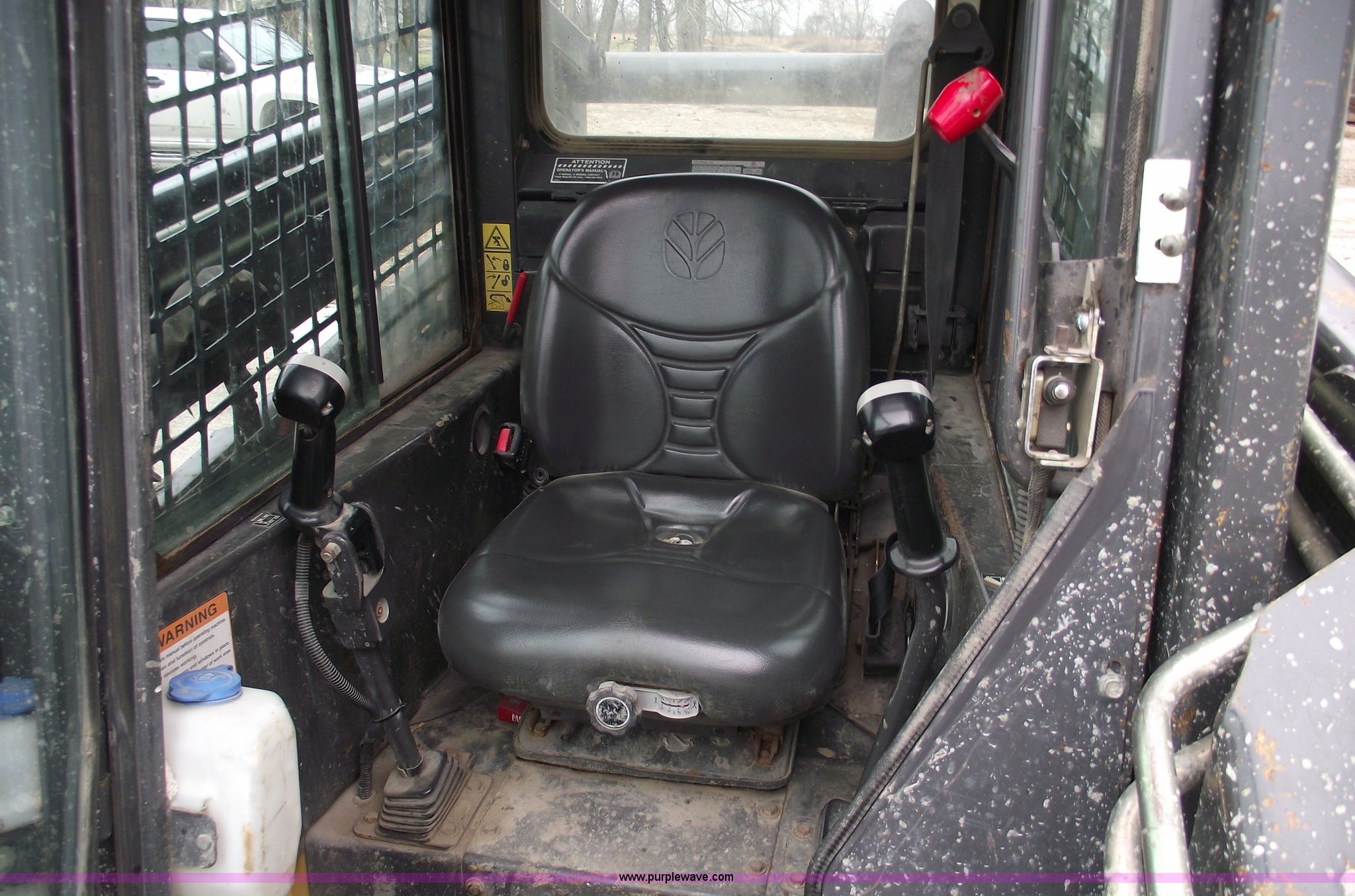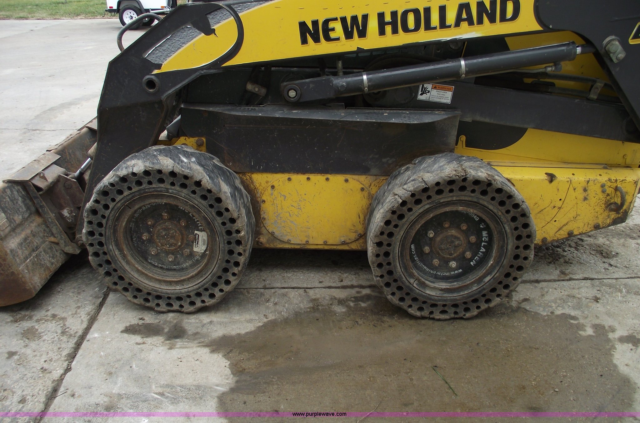 Purple Wave is selling a used Skid Steer Loader in Missouri. This item is a 2005 New Holland L185 skid steer with the following: 1,714 hours on meter, New Holland four cylinder turbo diesel engine, 83 HP, Cab with AC and heat, Bucket foot controls, 72" smooth bucket with bolt-on cutting edge, Auxiliary hydraulics, 2,500 lb rated operating capacity, 7,100 lbs. base operating weight, Owners manual, Nu-Air 12" 33x12-16 RC604DL tires, (4) extra wheels and tires included, 12x16.5, (3) foam filled, Serial N6M435300