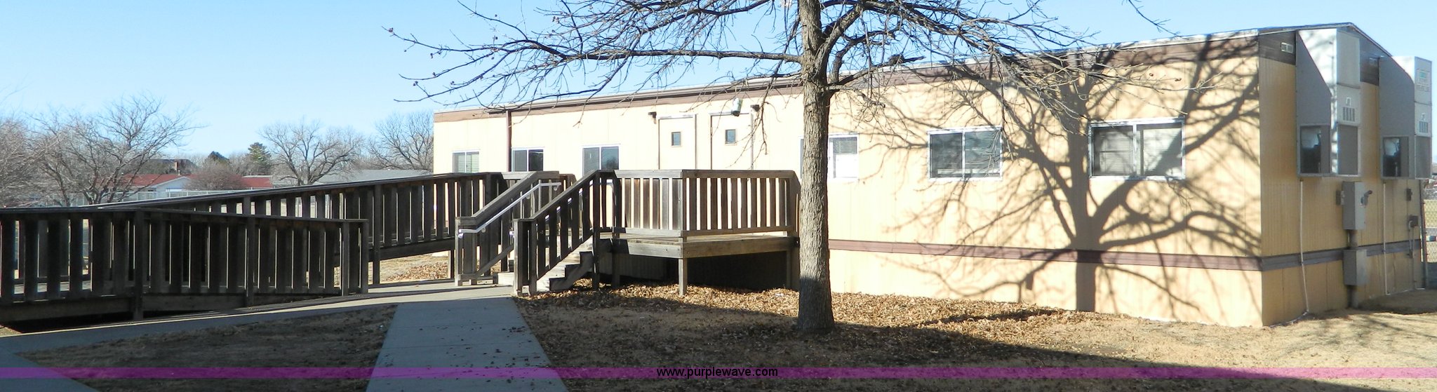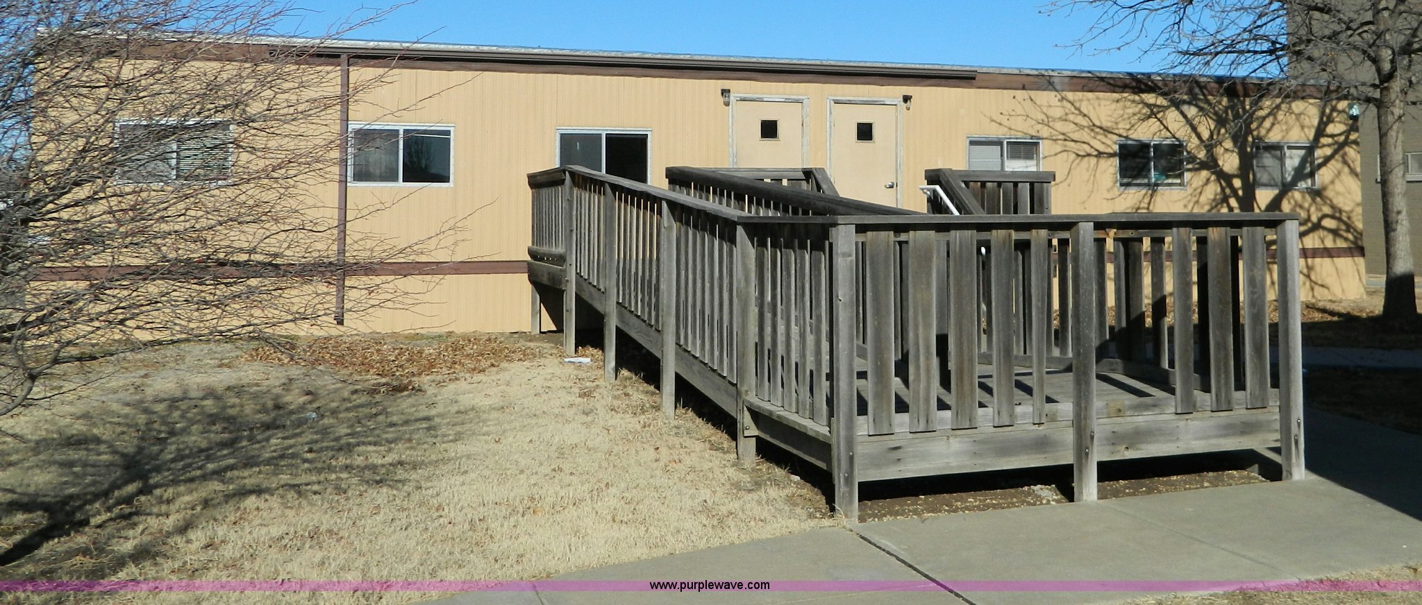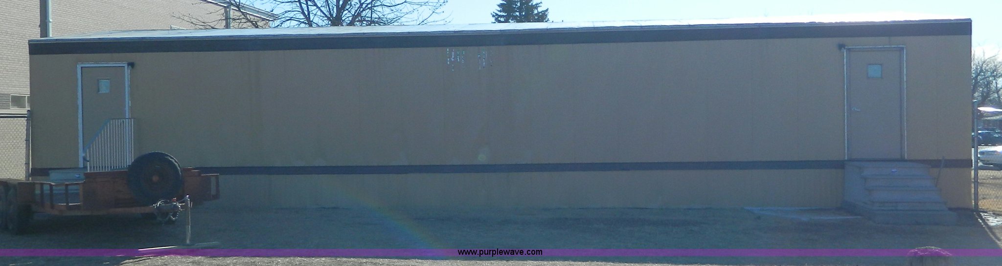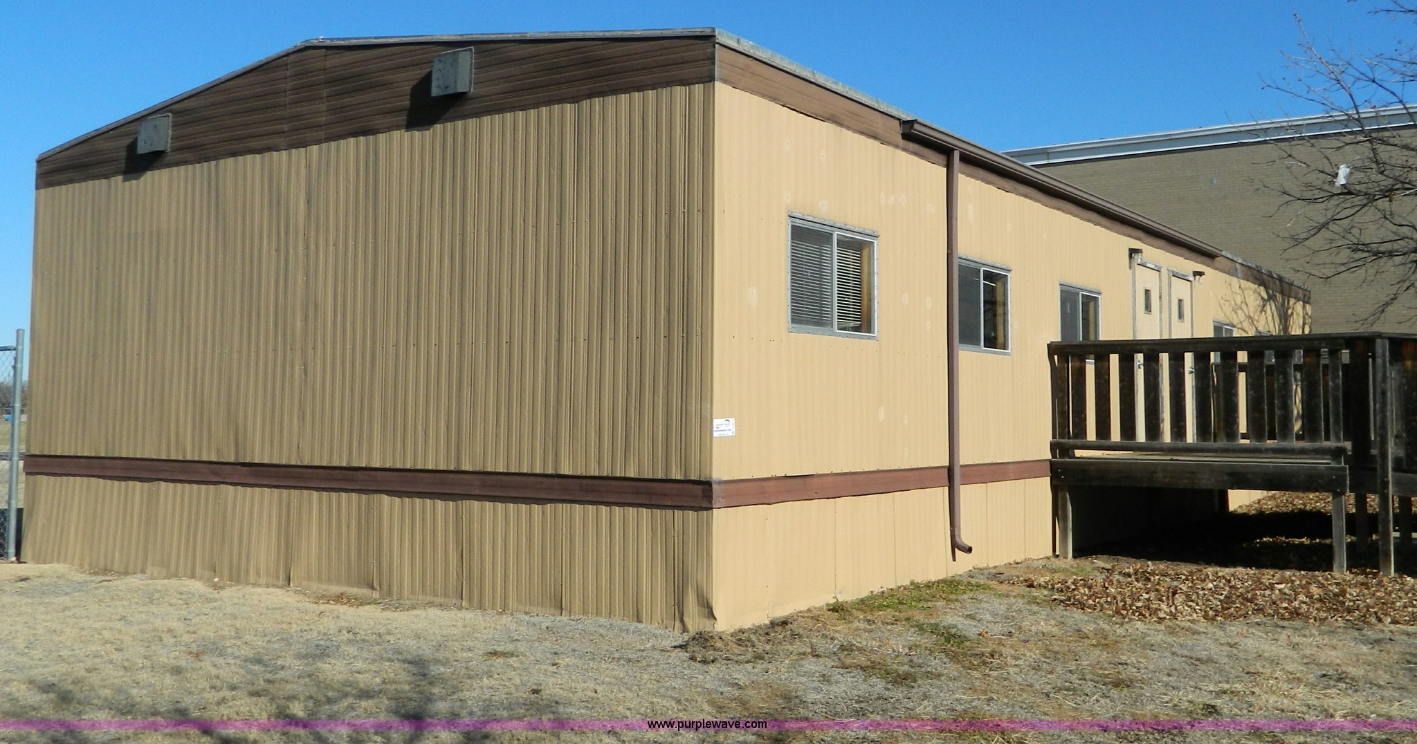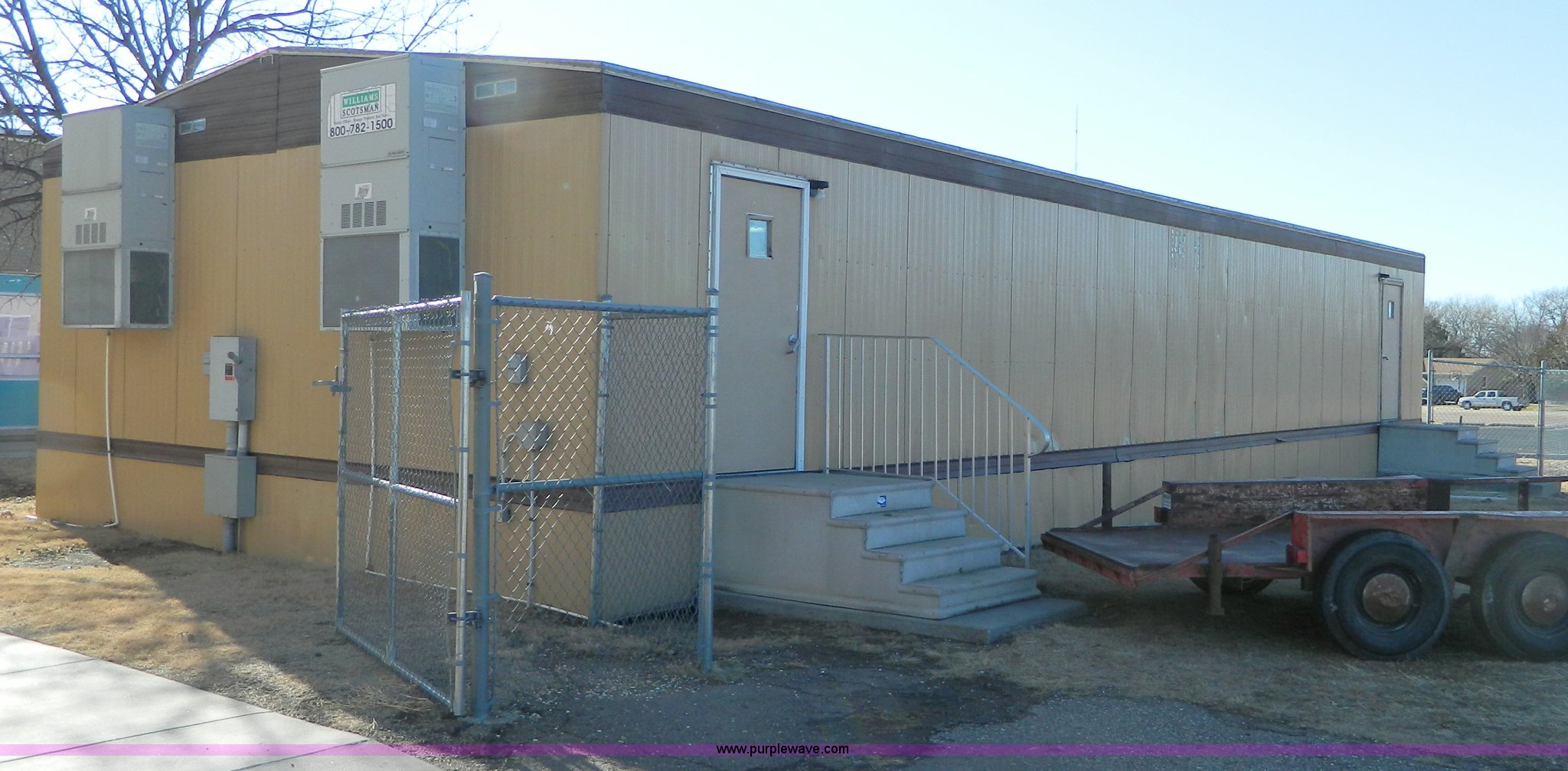 Purple Wave is selling a used Manufactured Home or Office in Kansas. This item is a Williams Scotsman mobile classroom unit with the following: 60' x 24', (4) 36" doors, Central HVAC units, R-11 insulation, Aluminum siding and skirting, Lighting and attached fixtures included, Decking stairs and porches included, Axles, tires, and hitches removed but included, No personal property pictured included, Unit accessible from asphalt for removal, Utilities will be disconnected by the seller at the panels or hookups, Buyer responsible for all aspects of loadout and removal, A $2,500 good faith deposit is required in addition to the final bid price, Buyer must furnish a minimum $300,000 general liability insurance policy prior to removal