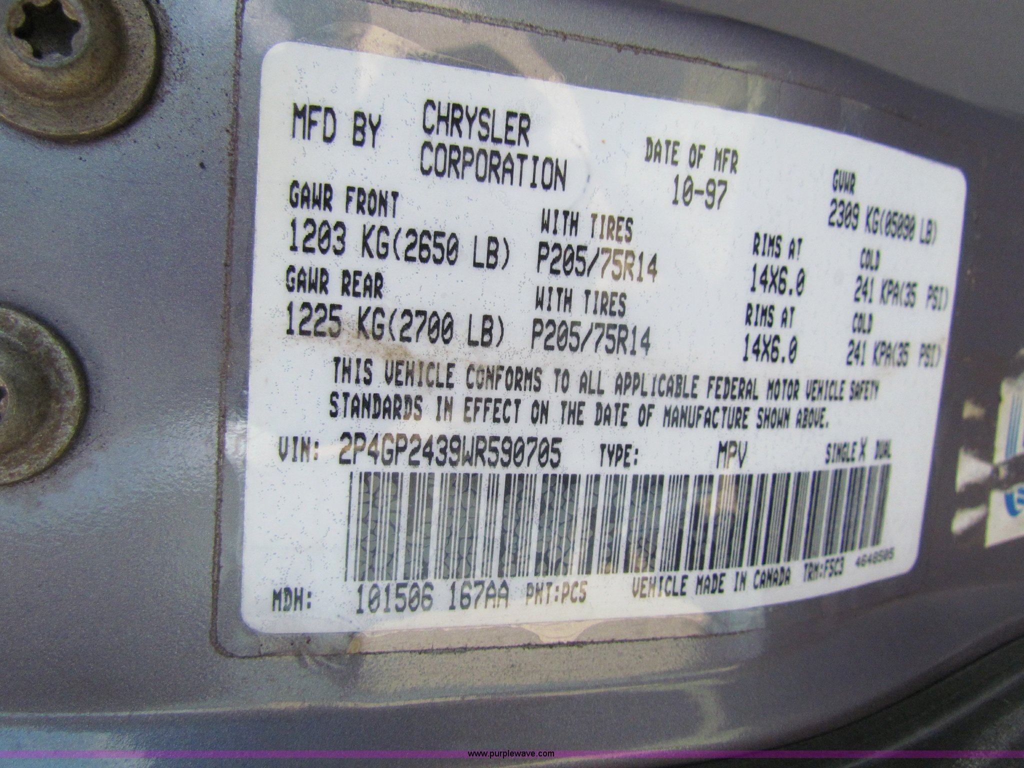 Purple Wave is selling a used Passenger Vehicle in Kansas. This item is a 1998 Plymouth Grand Voyager mini van with the following: 191,025 miles on odometer, 3.0L V6 SFI engine, Automatic transmission, Tilt, Cruise, Power locks and mirrors, 205/75R14 tires, Interior/exterior cosmetic damage, USD lettering will be removed