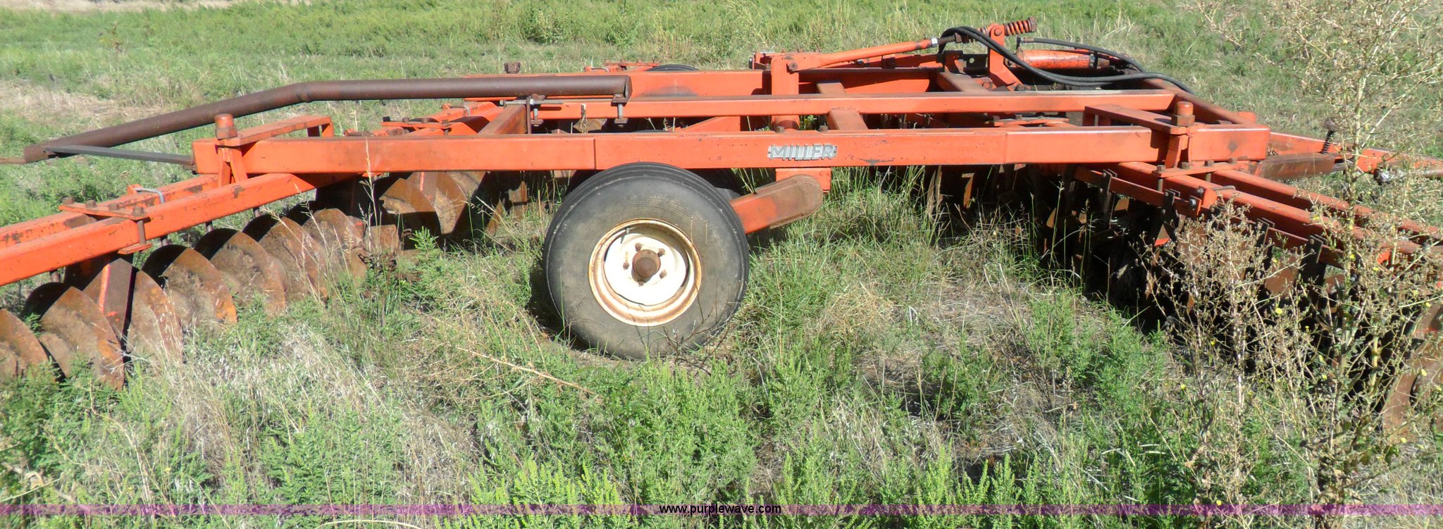 Purple Wave is selling a used Disk in Kansas. This item is a Miller offset disk with the following: Packer hitch, 8" spacing, Scrapers, Clevis hitch, 9.5L-14 tires, Missing one tire, Serial 2E2125