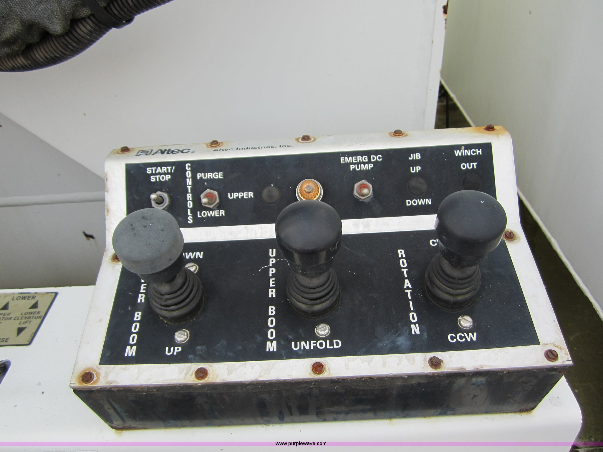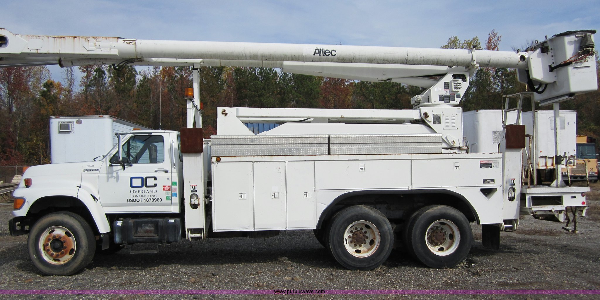 Purple Wave is selling a used Bucket Truck in Georgia. This item is a 1998 Ford FT900 utility bucket truck with the following: 58,488 miles on odometer, Cummins ISC 8.3L diesel engine, Six speed automatic transmission, Push button auto, Twin screw, AC and heat, AM/FM/Cassette, Altec service bed, Model AM900-E92, 92' boom reach, Upper and lower controls, (4) hydraulic outriggers, (9) bay doors, Block heater, 50 gallon fuel tank, PTO, Spring suspension, Air brakes, 11R22.5 tires, Cust# 200800
