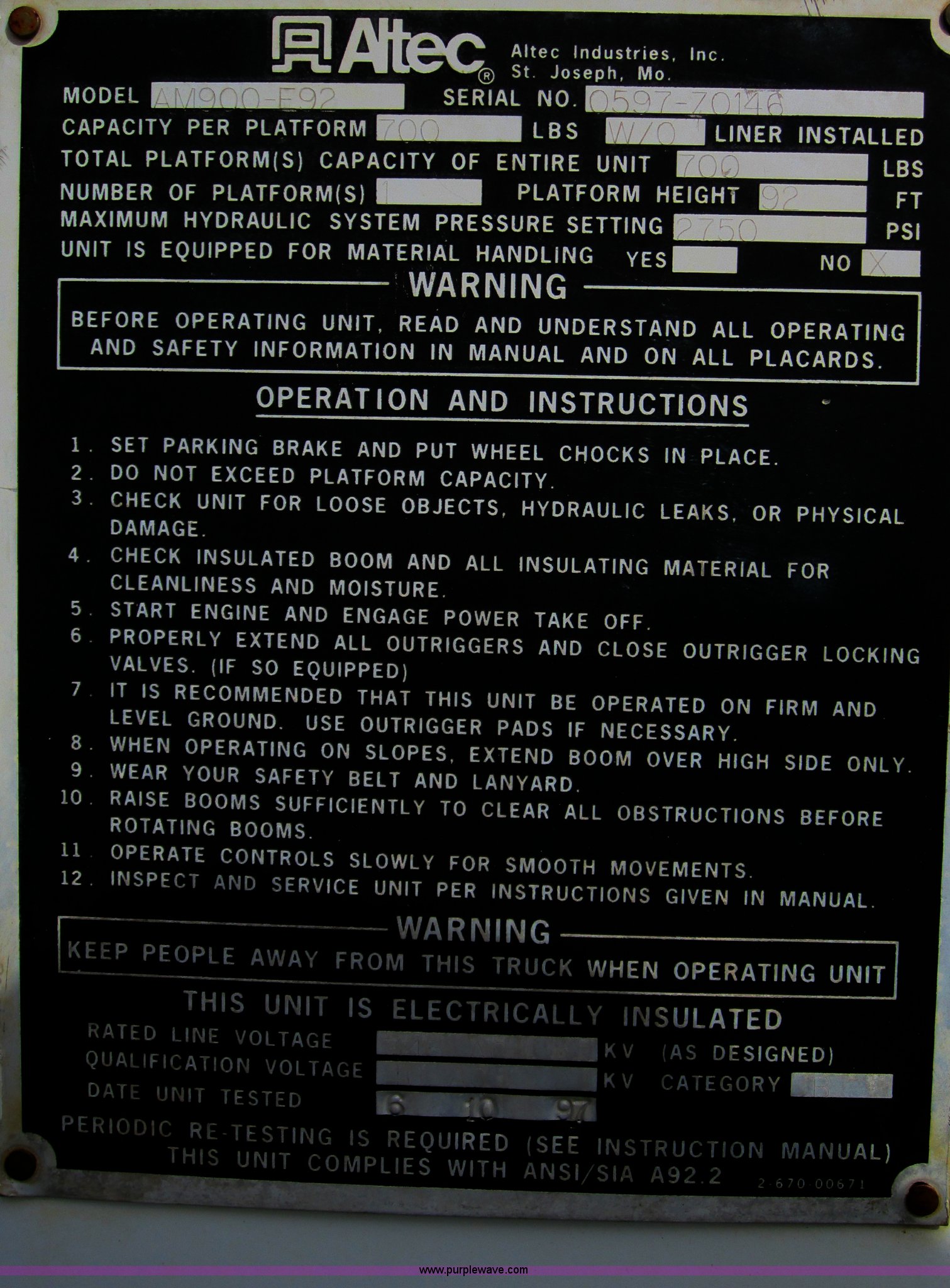 1998 Ford FT900 utility bucket truck. 58,488 miles on odometer, Cummins ISC 8.3L diesel engine, Six speed automatic transmission Push button auto, Twin screw, AC and heat, AM/FM/Cassette, Altec service bed Model AM900-E92, 92' boom reach, Upper and lower controls, (4) hydraulic outriggers, (9) bay doors, Block heater, 50 gallon fuel tank, PTO, Spring suspension, Air brakes, 11R22.5 tires, Cust# 200800. 1FDYL90E4WVA05090. Shipping quotes available. Black And Veatch. 587 Sigman Rd. Conyers, GA 30013