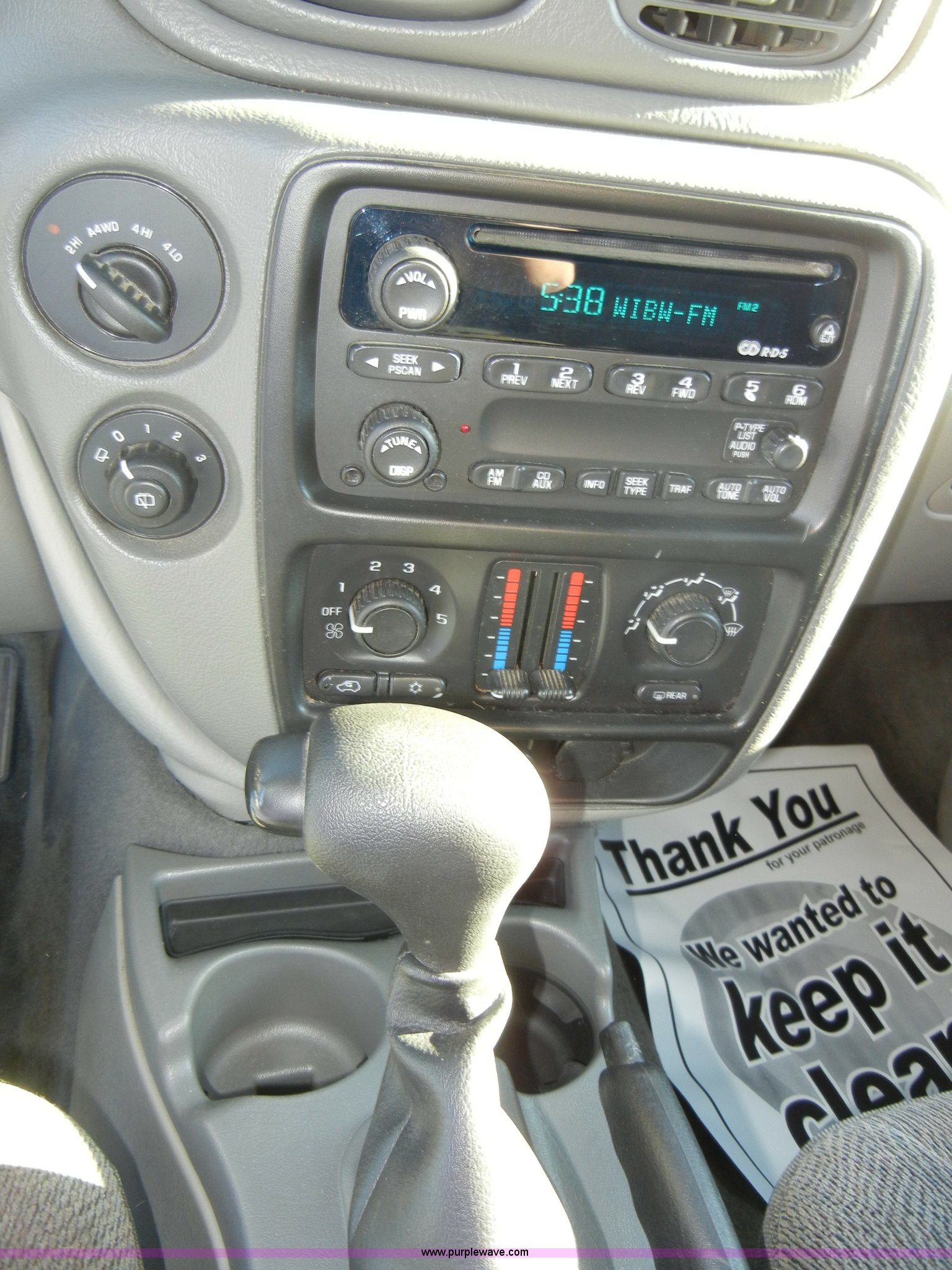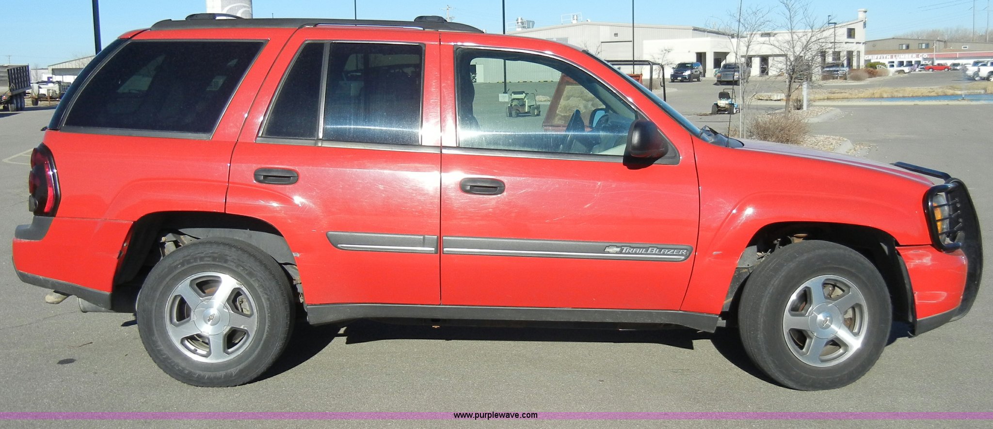 Purple Wave is selling a used Passenger Vehicle in Kansas. This item is a 2002 Chevrolet Trailblazer LT SUV with the following: 96,154 miles on odometer, 4.2L I6 MPI engine, Automatic transmission, Four wheel drive, AC and heat, Tilt, Cruise, AM/FM/CD, Sony DVD player, Power windows, locks, mirrors, and seats, Cloth seats, Compass and temp. display in rear view mirror, Front tow hooks, Grill guard, Receiver hitch, Trailer wiring, 245/70R16 tires, Plastic steering column damaged, Cosmetic damage to front bumper, Repossessed vehicle