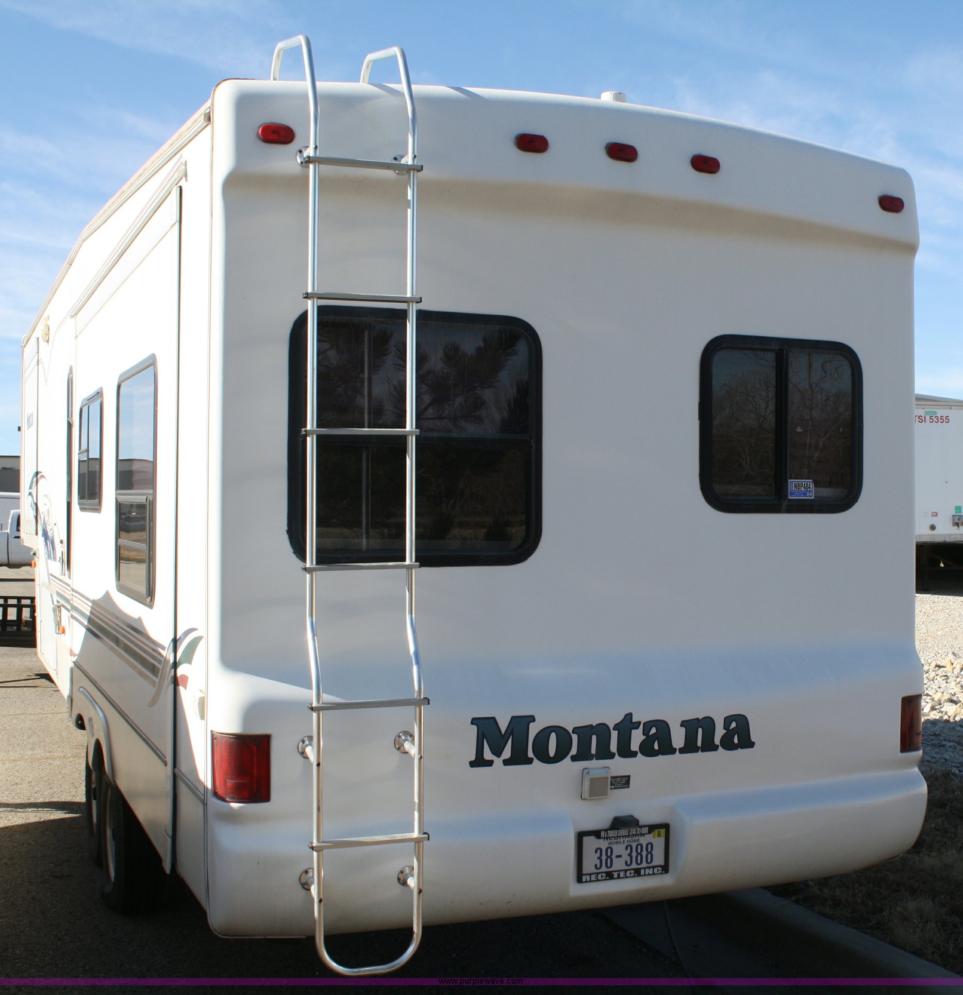 Purple Wave is selling a used RV in Kansas. This item is a 2002 Montana High Country fifth wheel camper with the following: 30'L x 8'W, (3) slide-outs, AC and heat, Television, Overhead cabinets, Fireplace, Propane range, Microwave, Sink, Stereo, (2) recliners and futon, Bed and closet, Sower, toilet, and sink, Fridge/freezer, Rear stabilizers, Front landing jacks, Exterior storage compartment, 235/85R16 tires, No keys to door, Model 3295RK