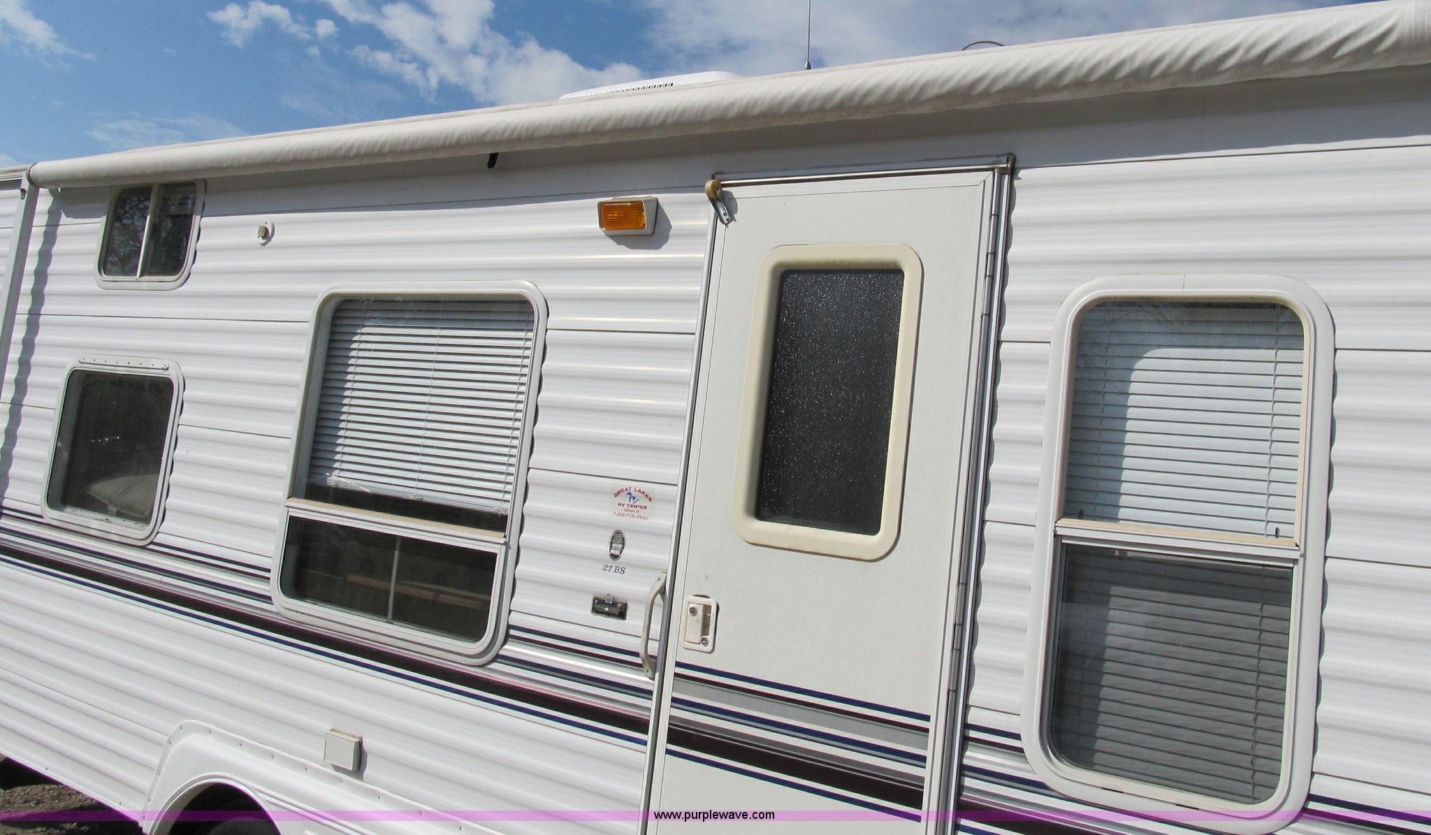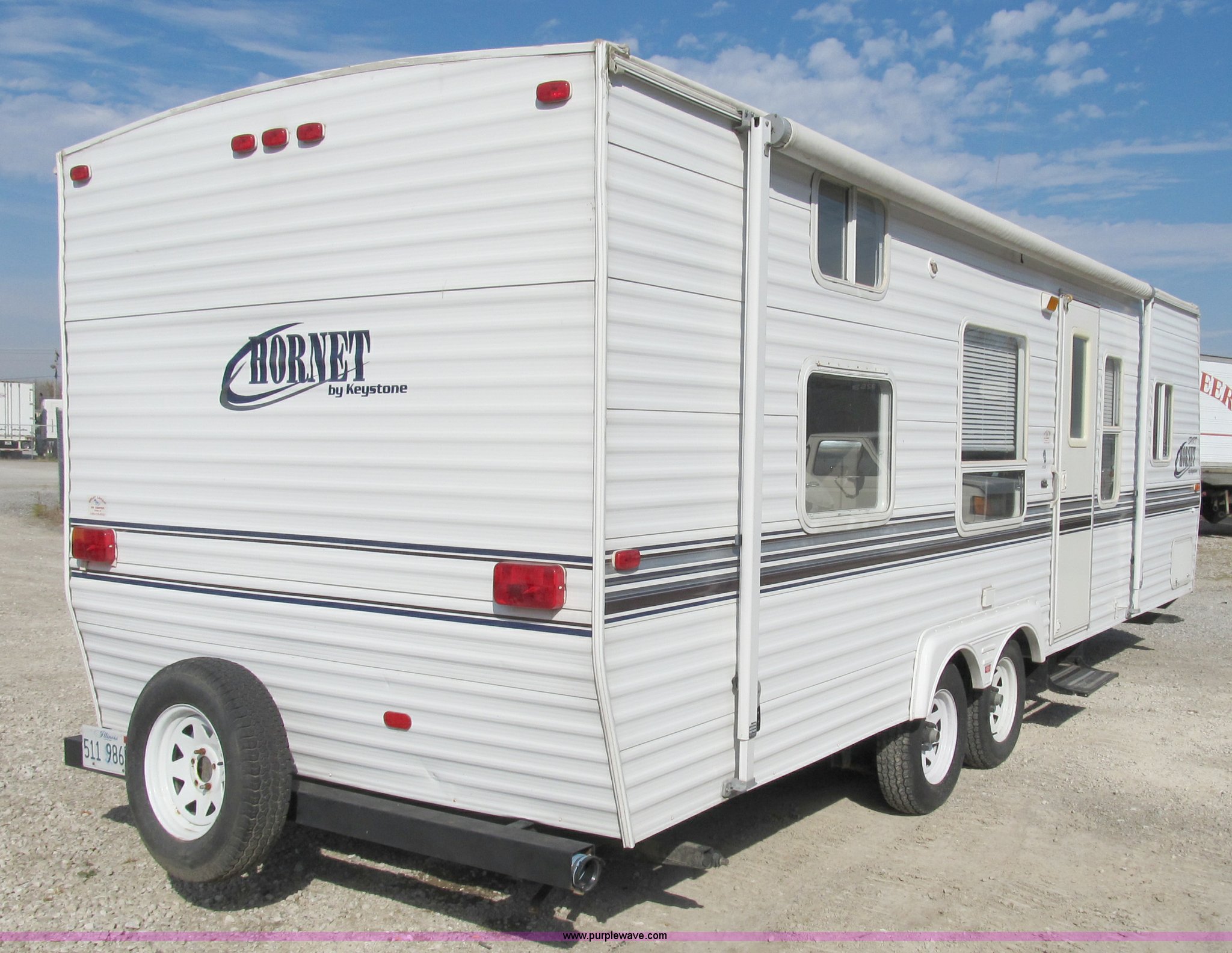 Purple Wave is selling a used RV in Illinois. This item is a 2002 Keystone Sport Hornet camper with the following: 28'9" overall length, 8' width, 9'9" height, Master bed area, Sliding privacy doors, Bunk beds, Bathroom, Sink, shower, toilet, Kitchen, Microwave, Stove with oven, Refrigerator/freezer, Double basin sink, Dining table and couch, Television with rooftop antennae, AC and heat, Electric and propane utilities, Roll out canopy, 40 gallon fresh water tank, 32 gallon waste water tank, 32 gallon gray water tank, Paperwork, manuals, and keys included, Jack assembly will be replaced, ST205/75D15 tires, 6 ply