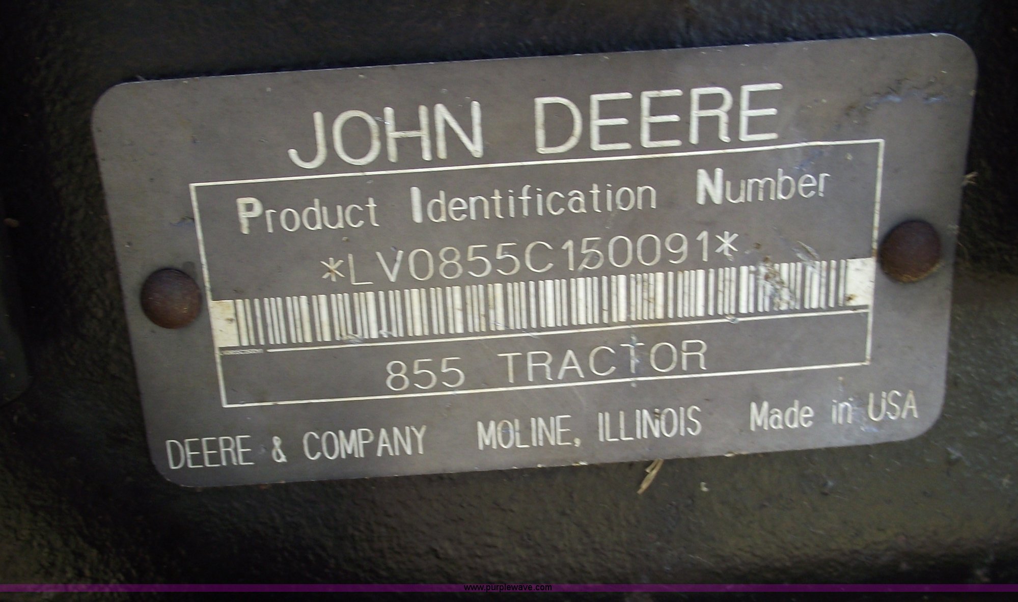 John Deere 855 lawn tractor. 1,525 hours on meter Actual hours unknown, meter stopped working Fall 2010, 72" mower deck, John Deere three cylinder diesel engine 24 HP, Model 3TN75RJ, Serial CH3033D019291, Hydrostatic transmission, Front wheel assist, ROPS, Three point, 540 PTO, Front hydraulic remotes, Joystick mower controls, 23-10.50-12 front tires, 33-12.50-15 rear tires, Serial LV0855C150091. Shipping quotes available. Sudheimer Motors. 2301 Rock Haven. Harrisonville, MO 64701