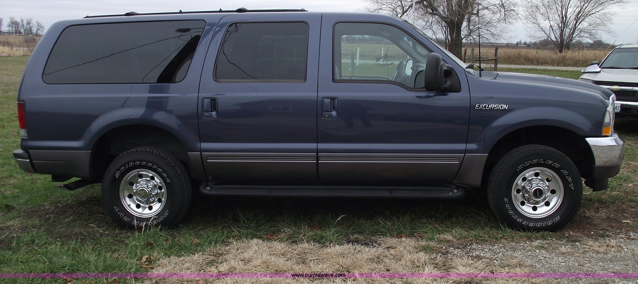 Purple Wave is selling a used Passenger Vehicle in Missouri. This item is a 2002 Ford Excursion XLT SUV with the following: 167,620 miles on odometer, 6.8L V10 EFI gas engine, Automatic transmission, Four wheel drive, Lockout hubs, AC and heat, Tilt, Cruise, AM/FM/CD, Power windows, locks, mirrors, and seats, Heated mirrors, Leather interior, Third row seating, Tinted windows, Reverse alarm, Electric brake controller, Luggage rack, Running boards, Receiver hitch, Trailer wiring, Aluminum wheels, 265/75/16 tires