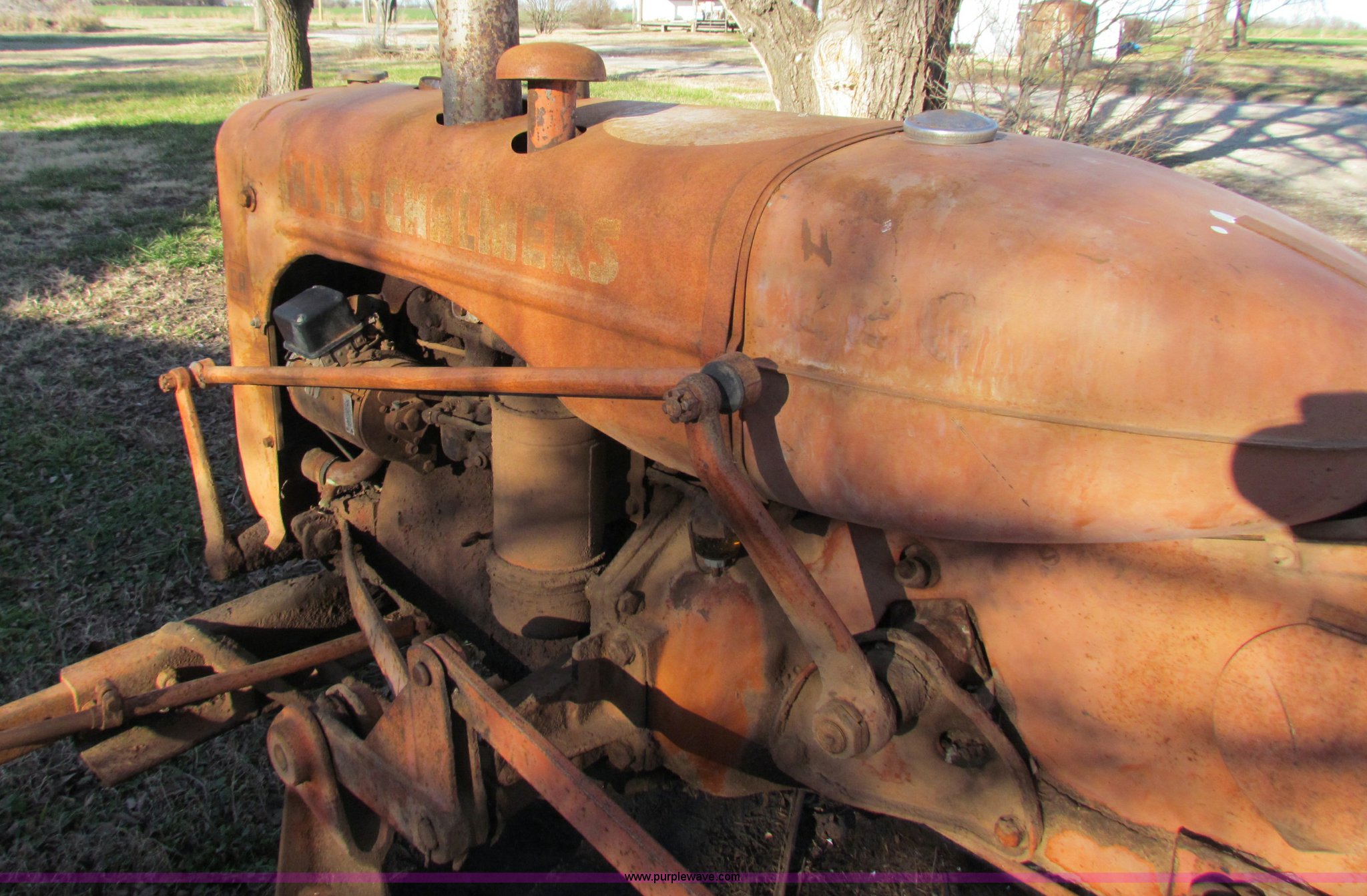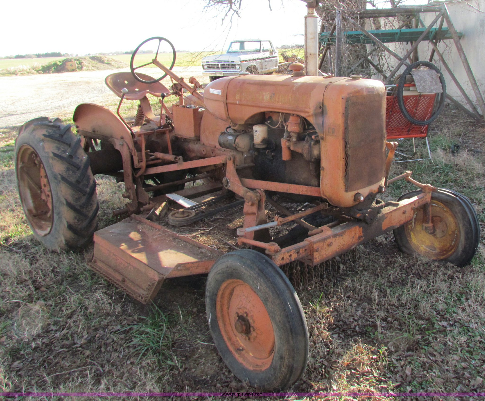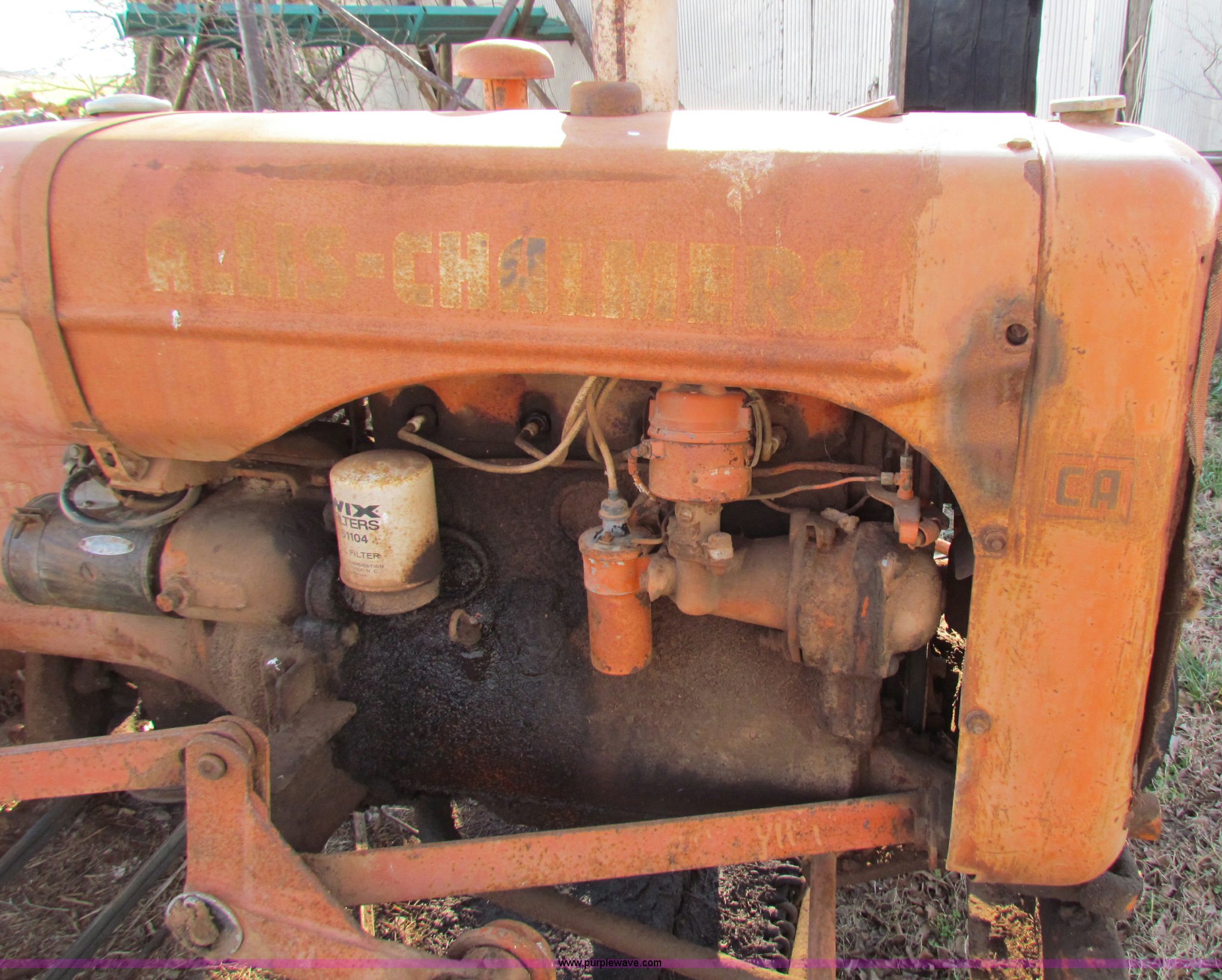 Purple Wave is selling a used Tractor in Oklahoma. This item is a 1952 Allis Chalmers CA tractor with the following: Four cylinder gas engine, Running condition, Three speed transmission, 5' mower deck, 9.00-24 rear tires, 5.00-15 front tires, Mower deck works but needs repair, Three point low on fluid, unknown working condition, Dead battery, Serial CA38934