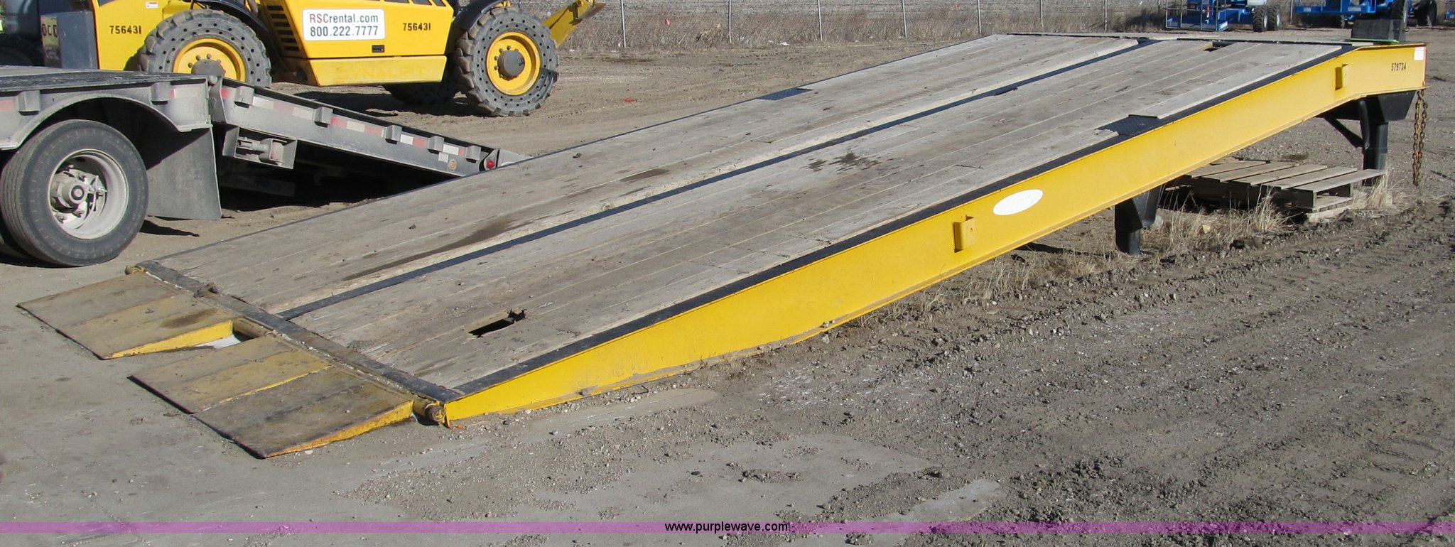 2005 Ledwell LW25RMP portable loading ramp. 25' overall length 21.5'L ramp, 42"L platform, 31" to 49" adjustable height, (4) 24" adjustable lengths, 10' width, Pine floor set 1/2" above steel rails (2) boards damaged, Set of 50,000 lb landing gear, Set of 20,000 lb landing gear, (3) 12" main beam members, 6" JR. I-beam cross members on 12" centers, Serial 060503418, EIN 579734. Completed temporary storage agreement required on payment. Shipping quotes available. RSC Equipment Rental - Spencer. 4016 Highway Blvd. Spencer, IA 51301