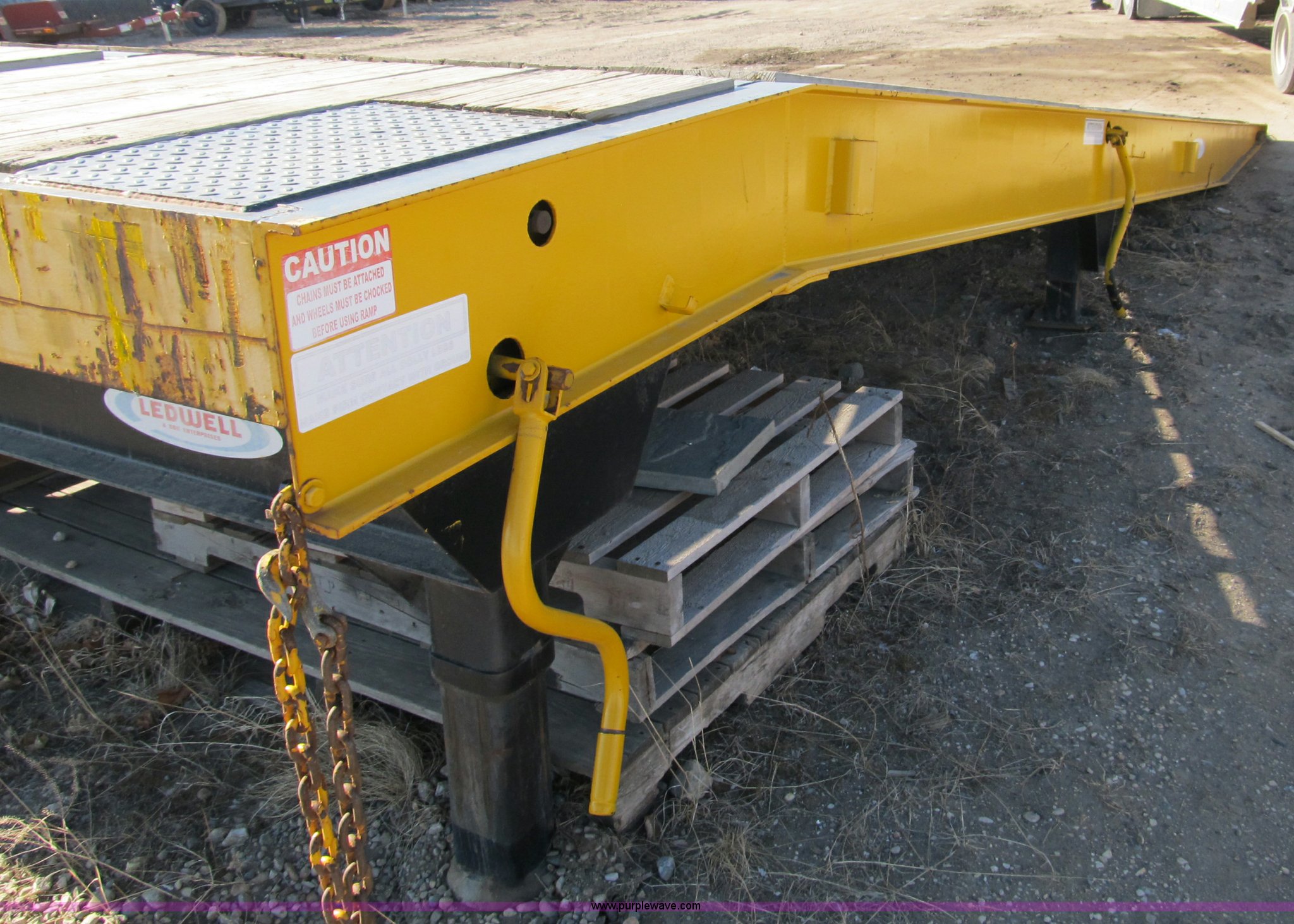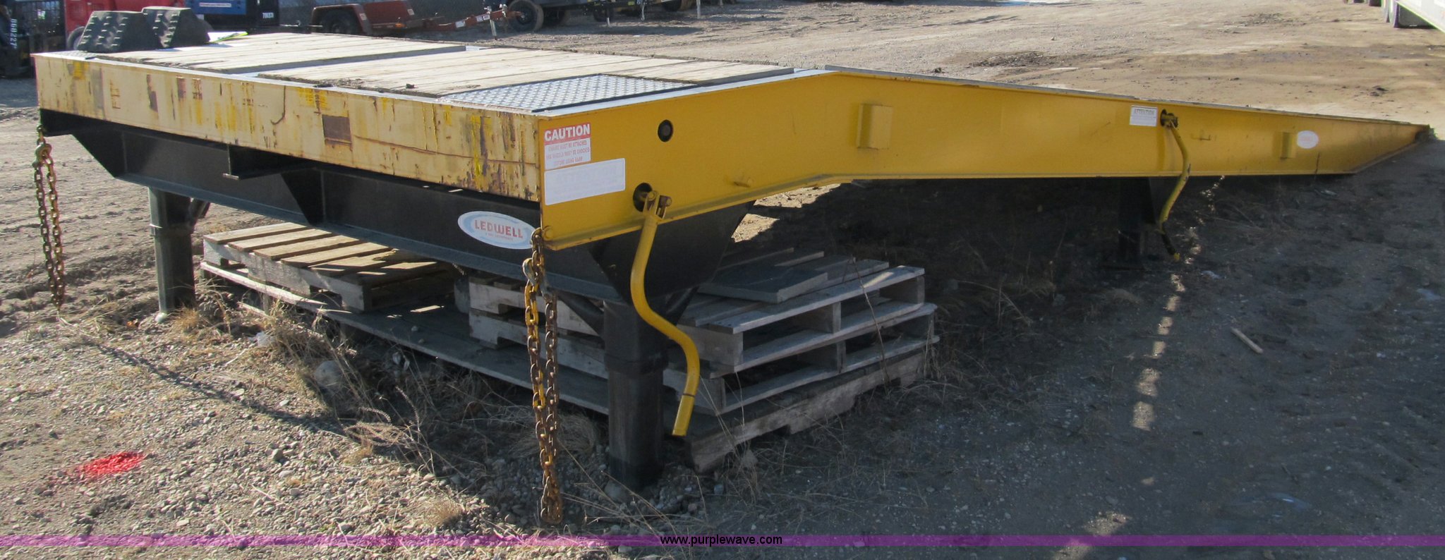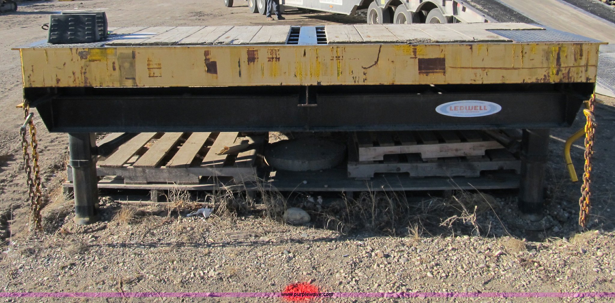 Purple Wave is selling a used Other Industrial or Business in Iowa. This item is a 2005 Ledwell LW25RMP portable loading ramp with the following: 25' overall length, 21.5'L ramp, 42"L platform, 31" to 49" adjustable height, (4) 24" adjustable lengths, 10' width, Pine floor set 1/2" above steel rails, (2) boards damaged, Set of 50,000 lb landing gear, Set of 20,000 lb landing gear, (3) 12" main beam members, 6" JR. I-beam cross members on 12" centers, Serial 060503418, EIN 579734