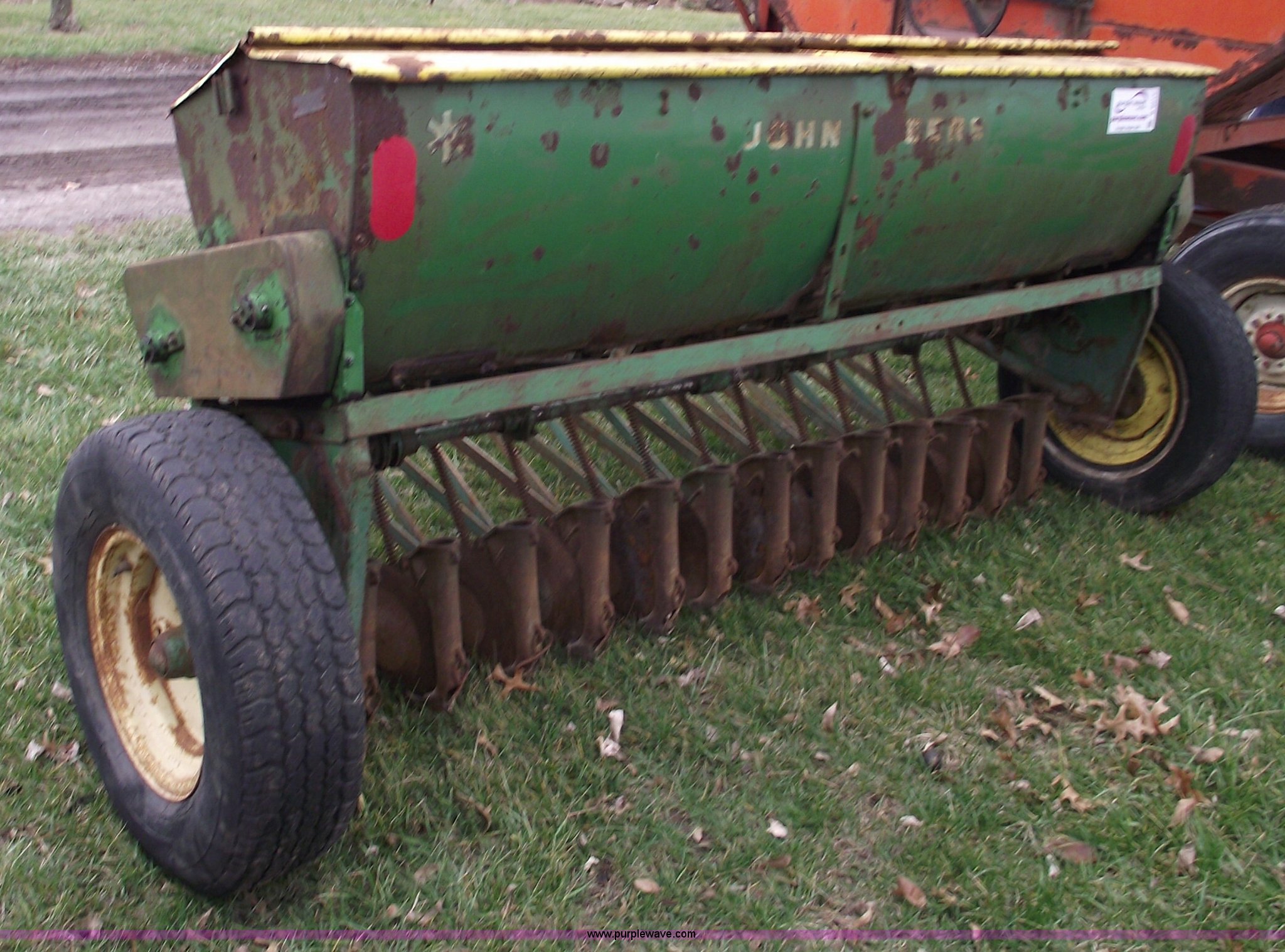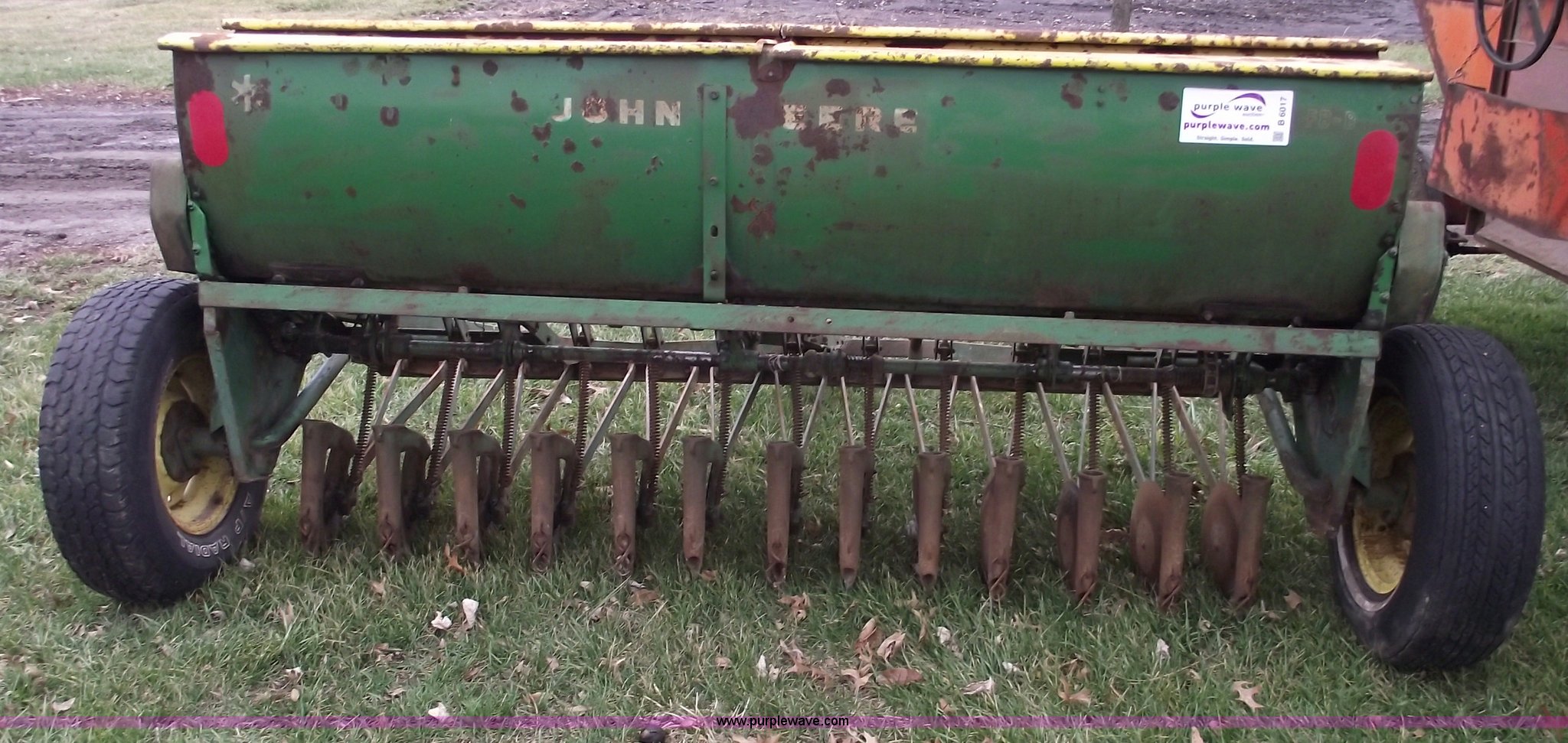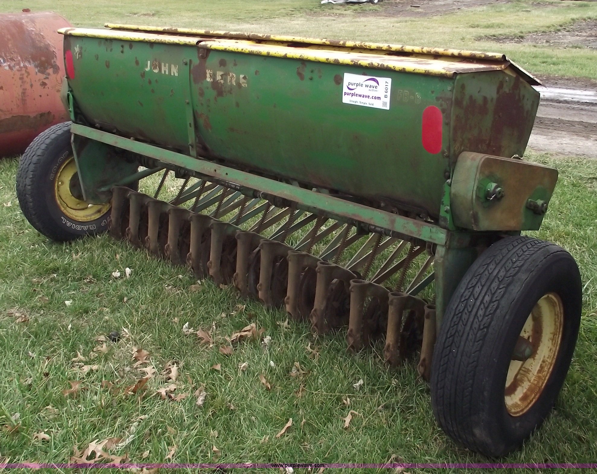 Purple Wave is selling a used Grain Drill or Seeder in Missouri. This item is a John Deere FB-8 drill with the following: 8' planting width, Pin hitch, LR78-15LT tires, Missing funnels