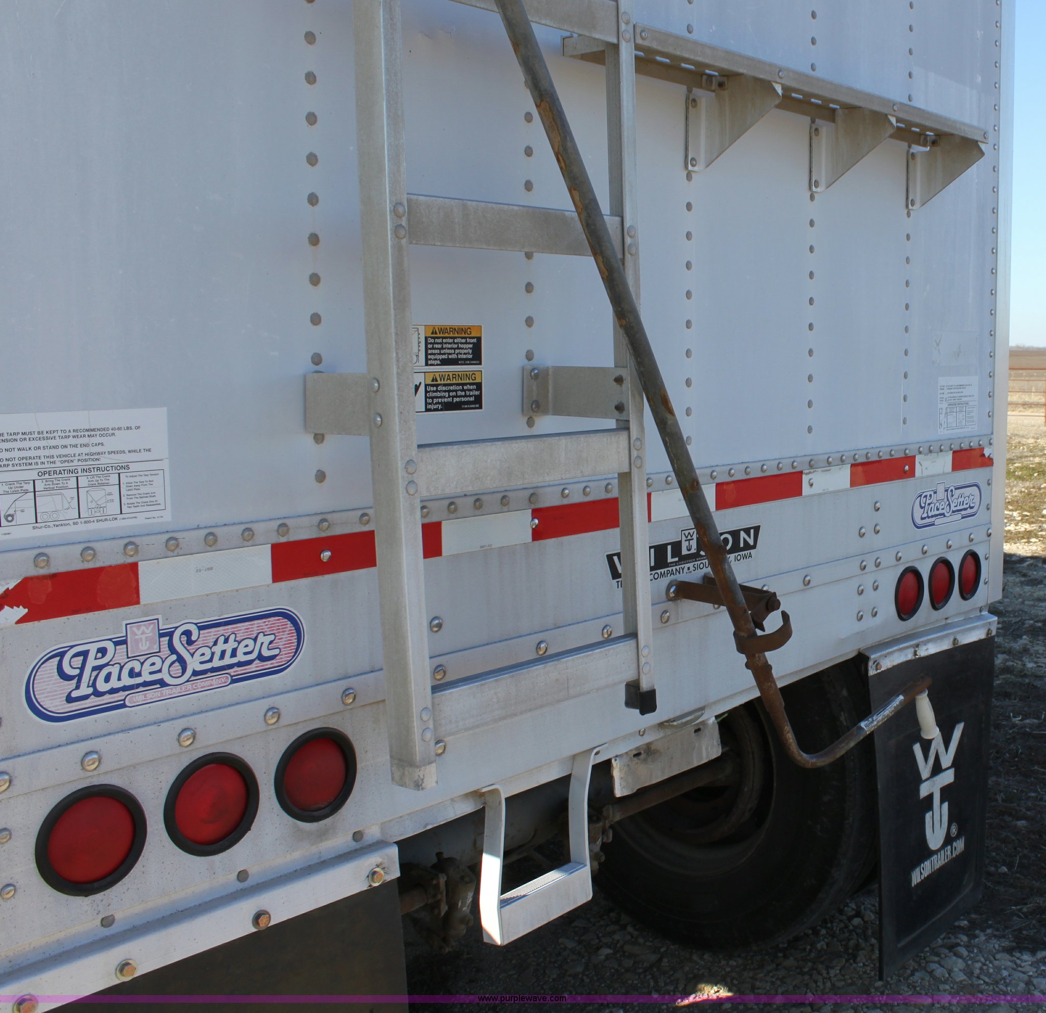 Purple Wave is selling a used Grain or Commodity Trailer in Kansas. This item is a 1999 Wilson 43' grain trailer with the following: 102" wide, 78"H sides, Dual hoppers, Shur-Lok roll over tarp, New tarp, Air brakes, Air suspension, Virgin tires on rear axle, 11R24.5 tires