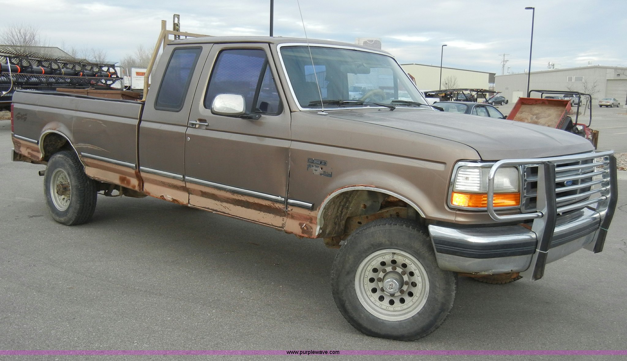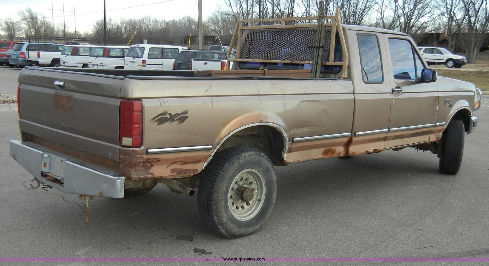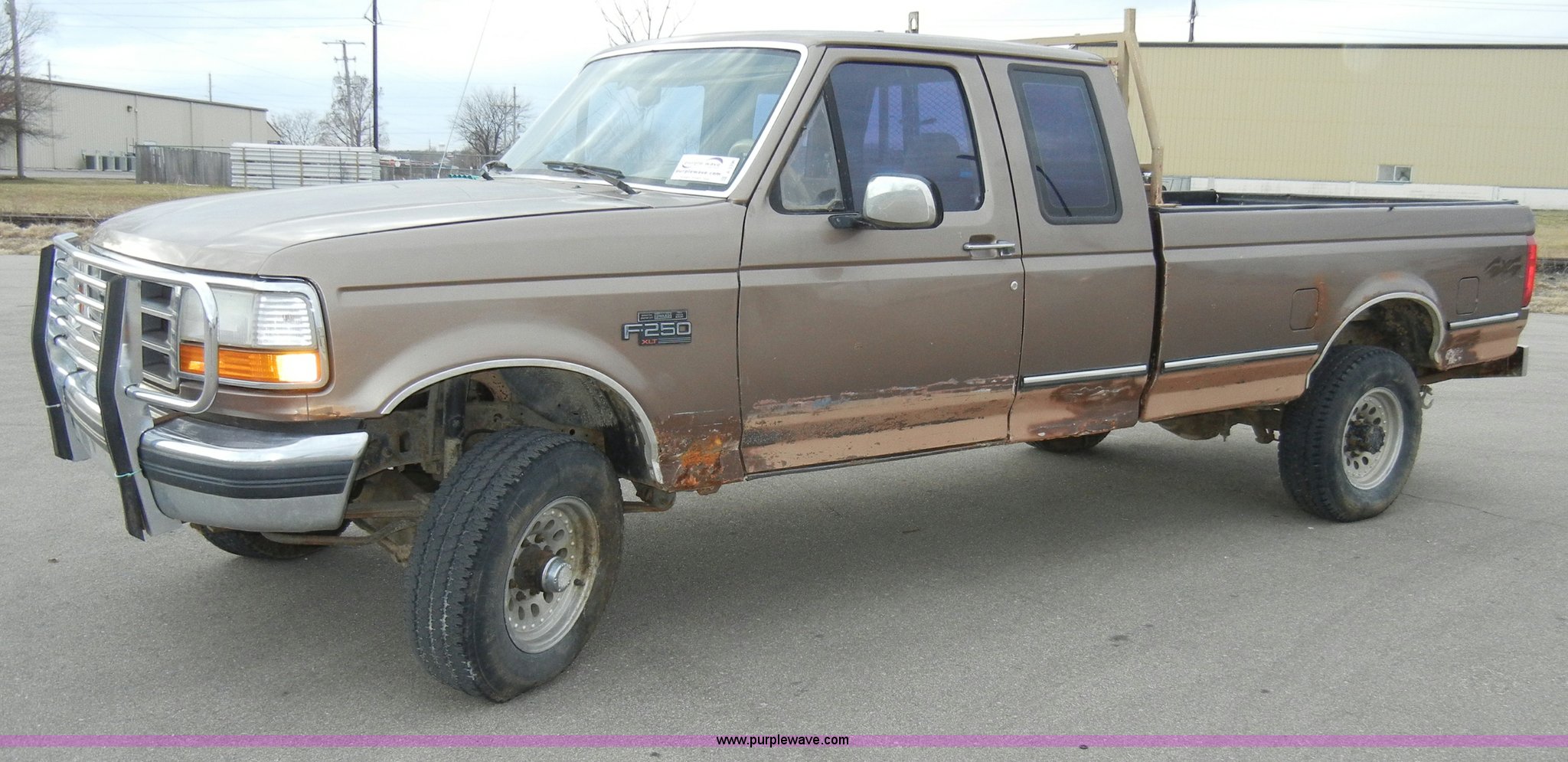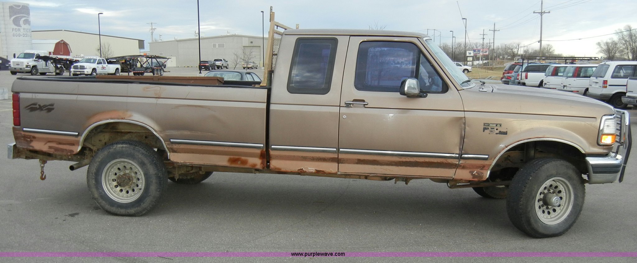 Purple Wave is selling a used Passenger Vehicle in Kansas. This item is a 1992 Ford F250 XLT Supercab pickup truck with the following: 231,681 miles on odometer, 5.8L V8 EFI engine, Automatic transmission, Four wheel drive, AC and heat, Tilt, Cruise, AM/FM, Power windows and locks, Cloth bench seat, Grill guard, Bed liner, Toolbox with assorted tools, Dual fuel tanks, Pin hitch, Trailer wiring, 245/75R16 tires, Recently replaced battery, Chains and cables included, Shifter needle inoperable, Cracked dash, Body rust, Interior/exterior cosmetic damage, Dents and scratches, Bad brakes, Seized vehicle