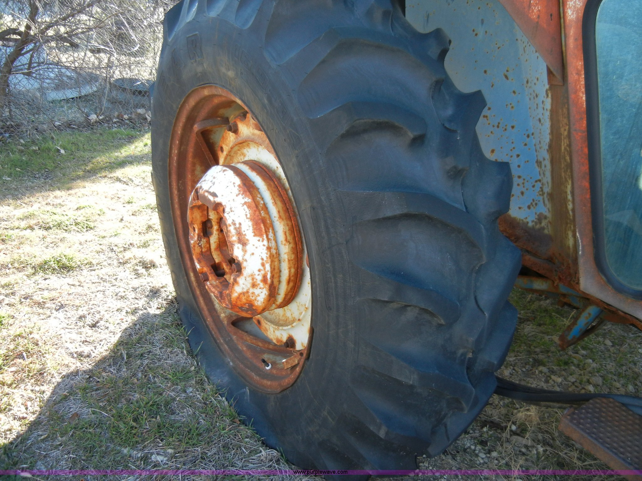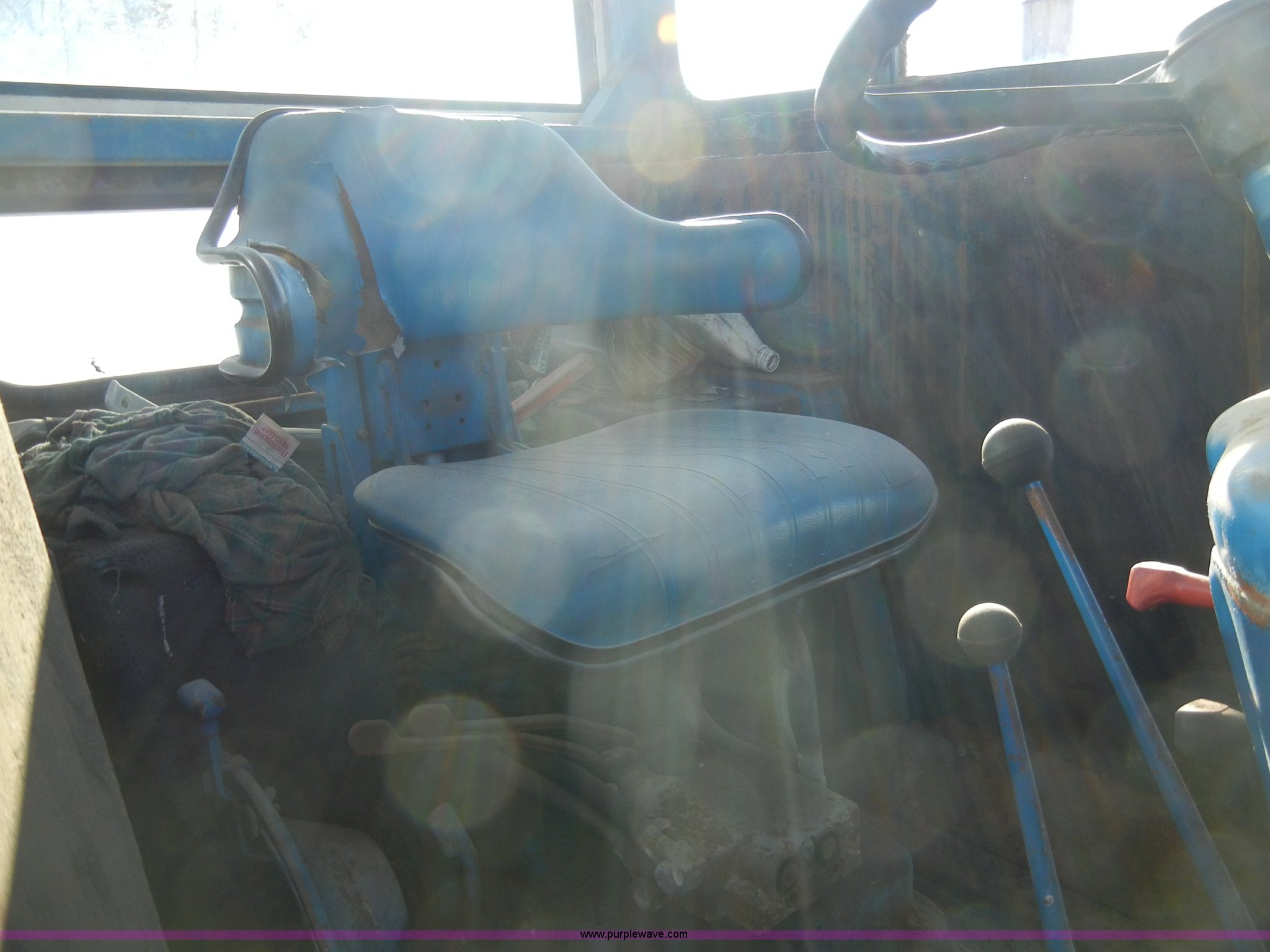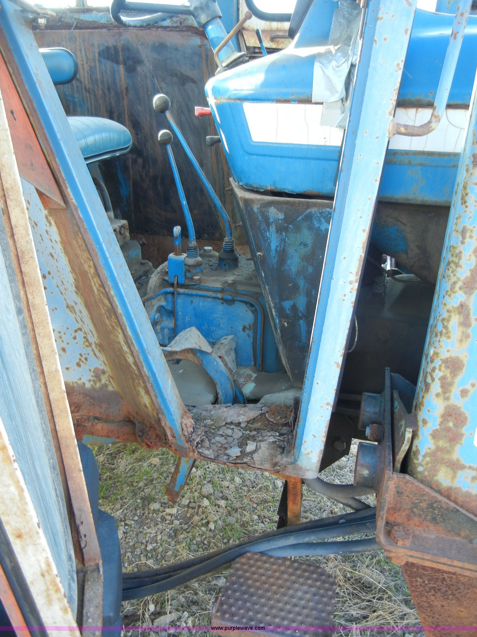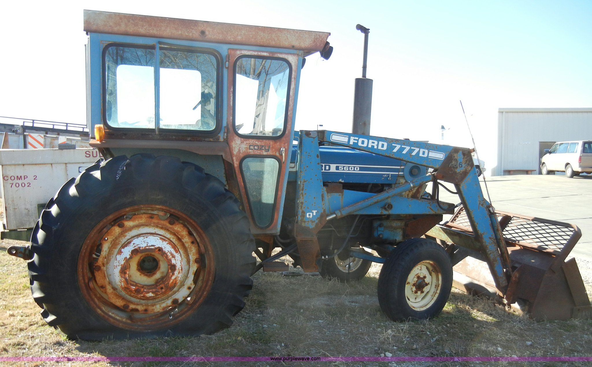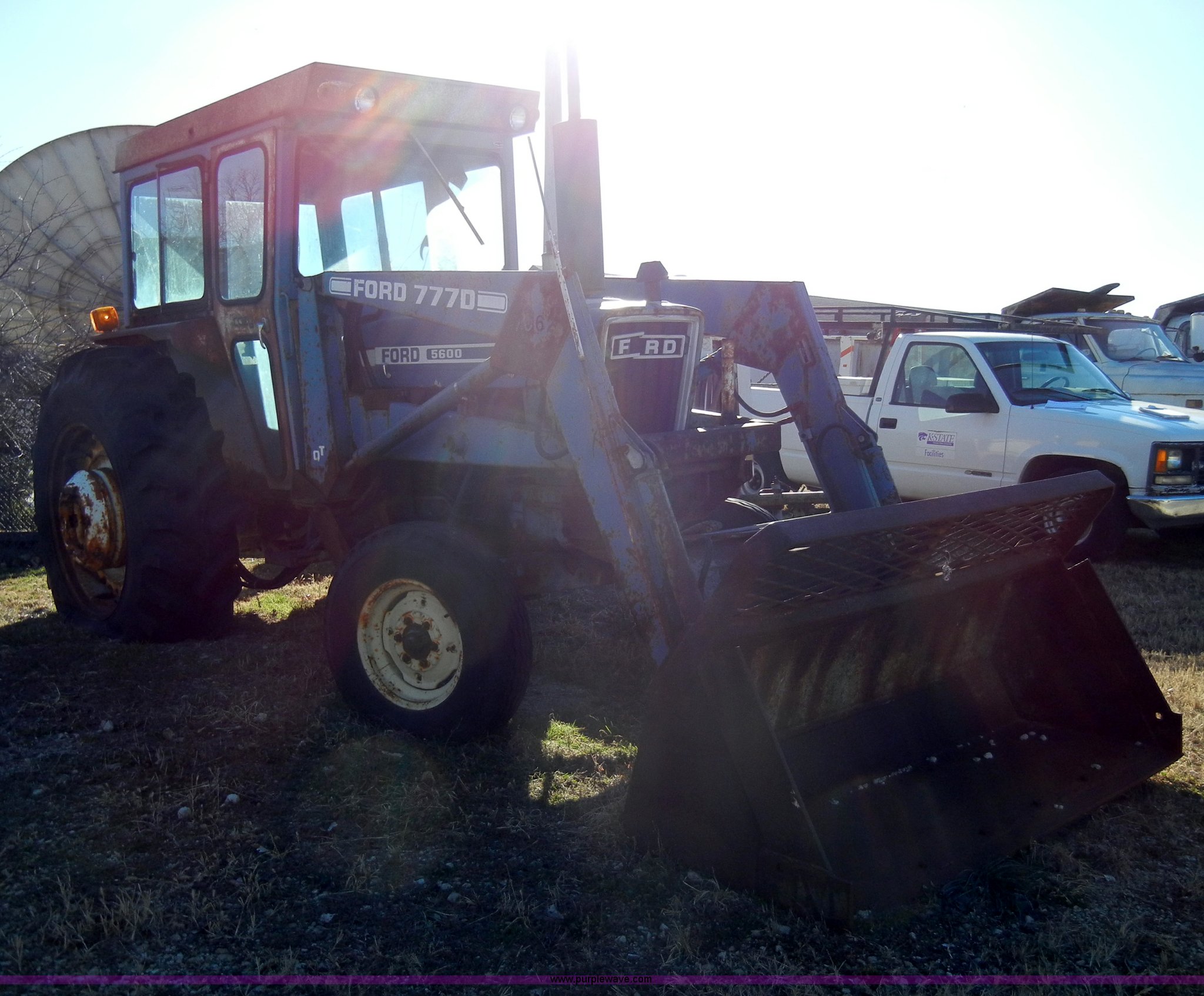 Purple Wave is selling a used Tractor in Kansas. This item is a 1981 Ford 5600 tractor with the following: 2,038 hours on meter, Four cylinder diesel engine, Powershift transmission, 8F-2R gears, AC and heat, Spring ride seat, Instructor seat, 777D loader with 6' bucket, Three point, Draw bar, 540 PTO, Rear hydraulic remote, Block heater, Wheel weights, 8.00-16 front tires, 16.9-34 rear tires, flat, 70" wheelbase, Cab rusted, Windows broken