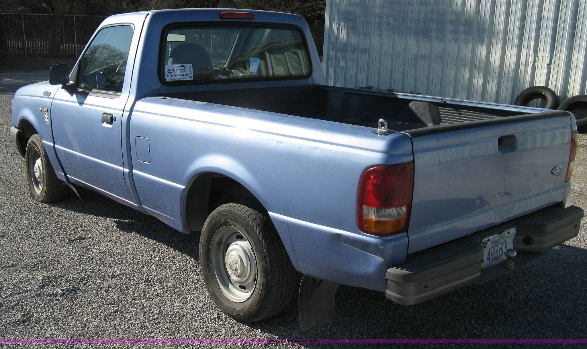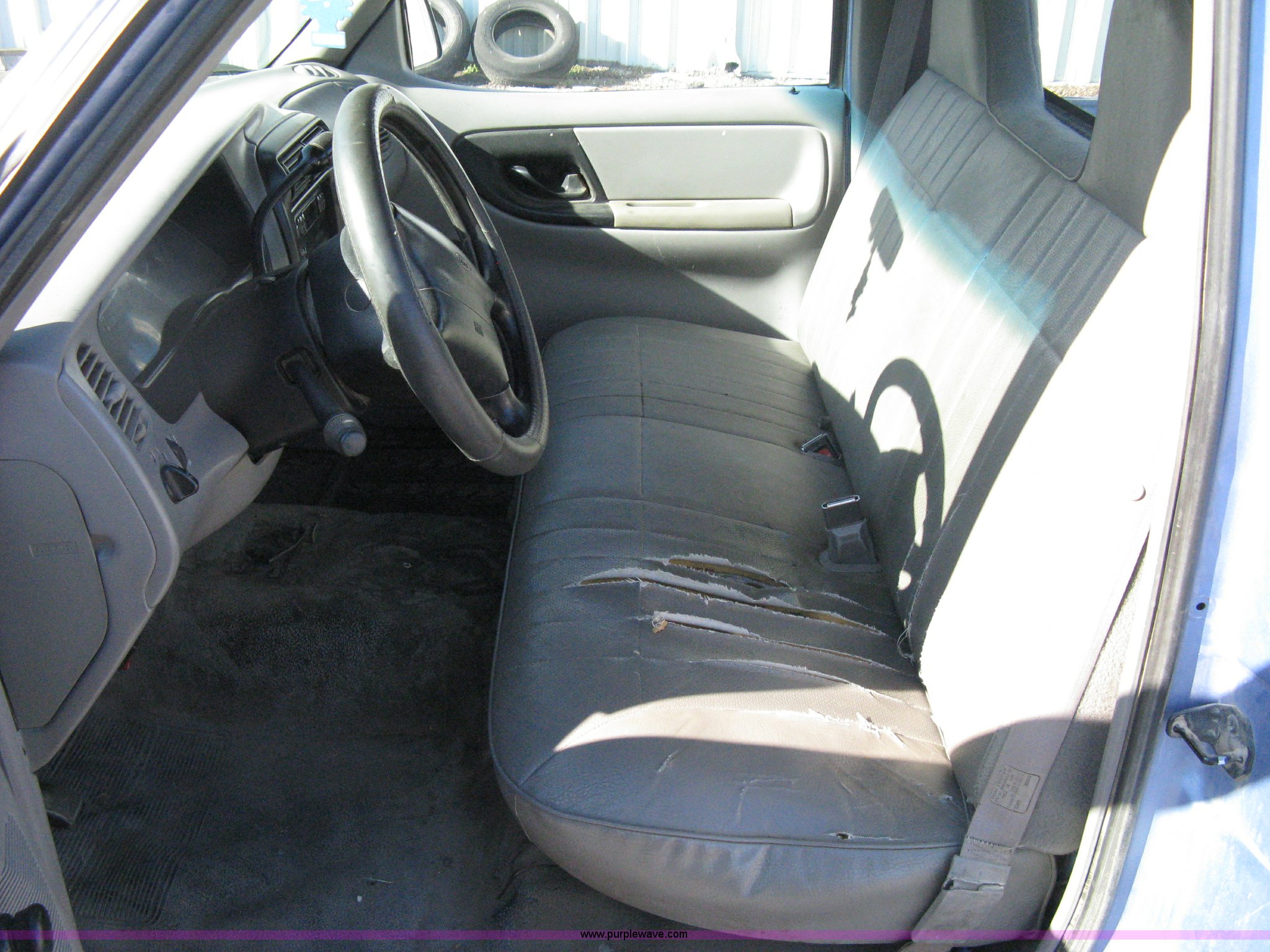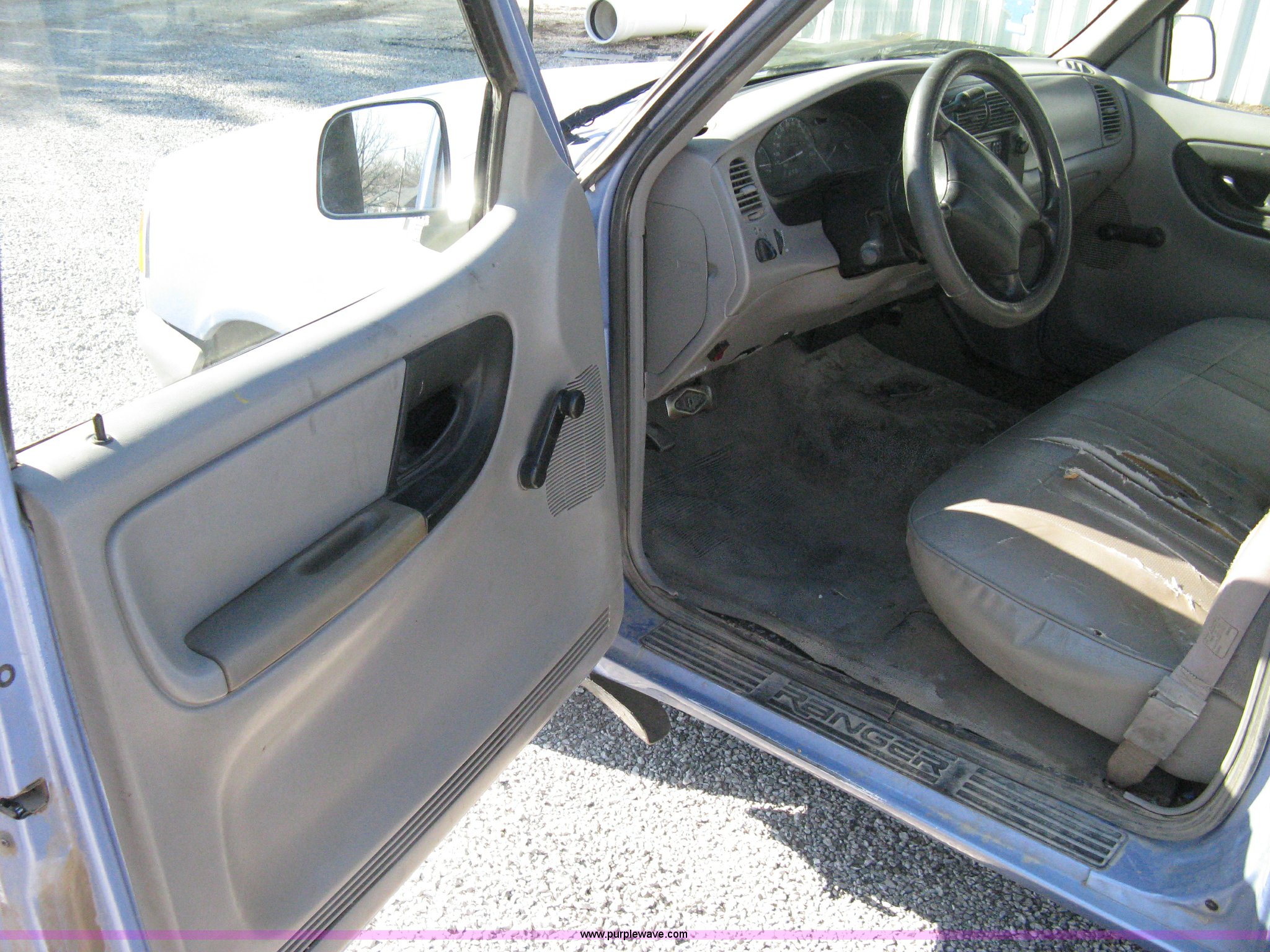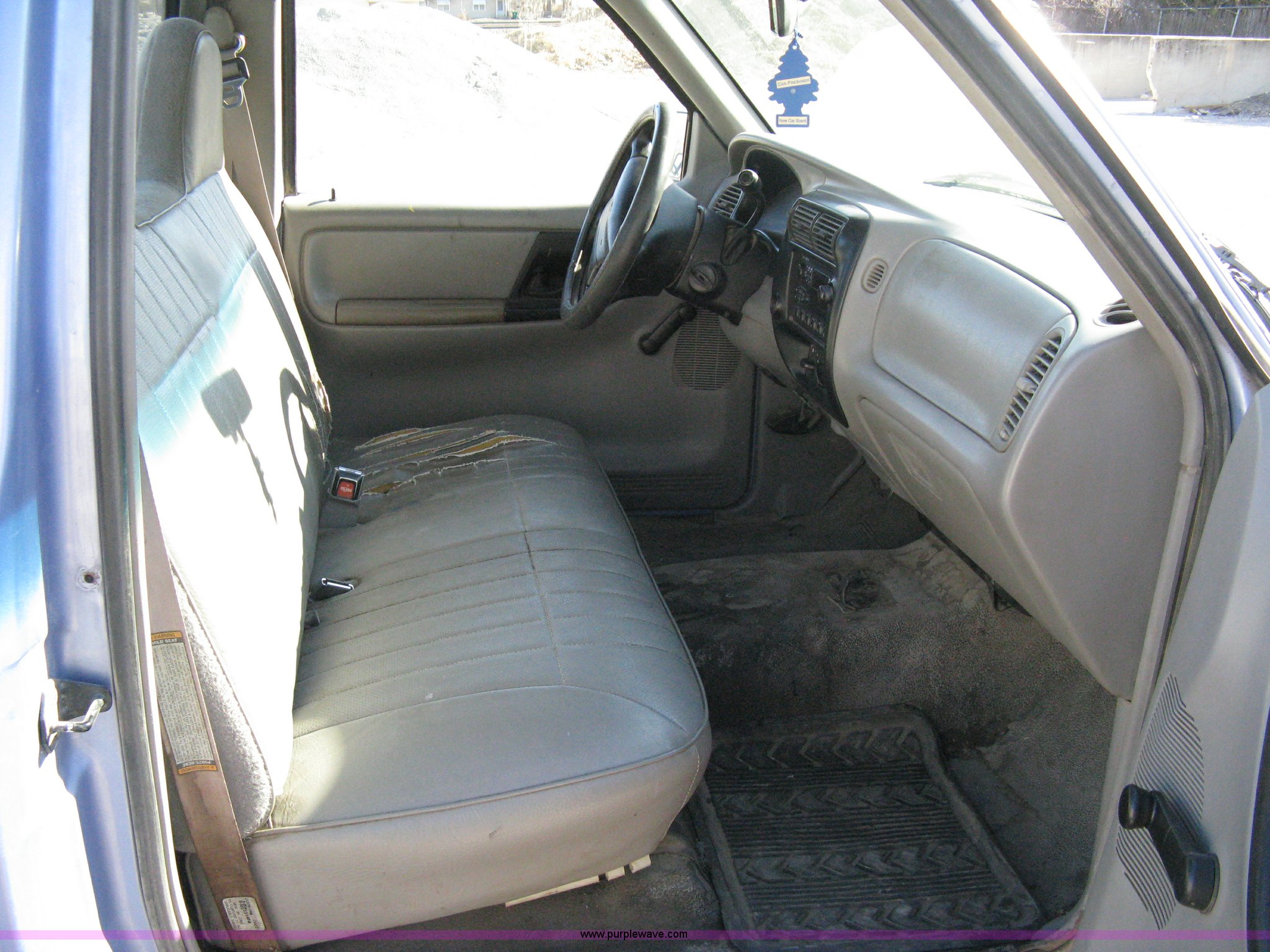 Purple Wave is selling a used Passenger Vehicle in Kansas. This item is a 1997 Ford Ranger pickup truck with the following: 74,246 miles on odometer, 2.3L I4 EFI engine, Automatic transmission, AC and heat, AM/FM, Manual windows and locks, Bench seat, Plastic bed liner, 2" ball, 195/70R14 tires, Dead battery, Interior/exterior cosmetic damage