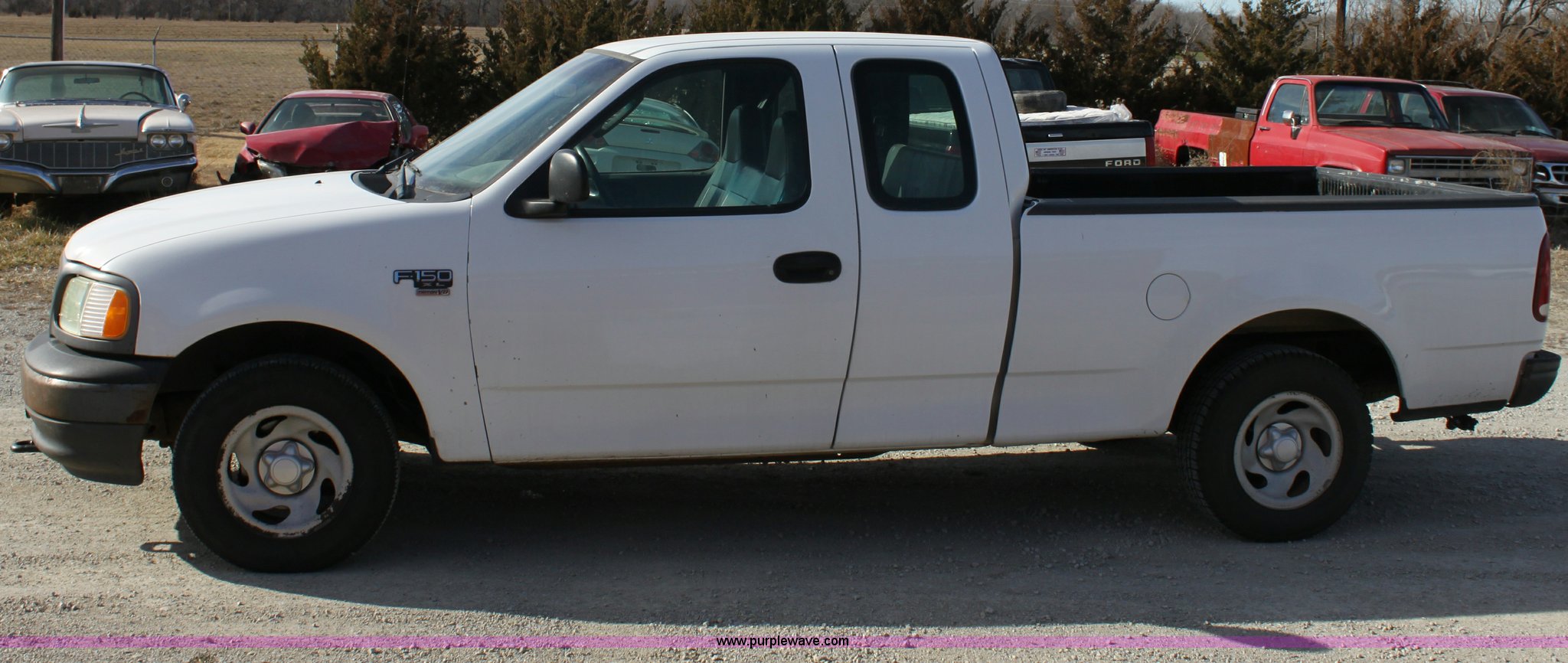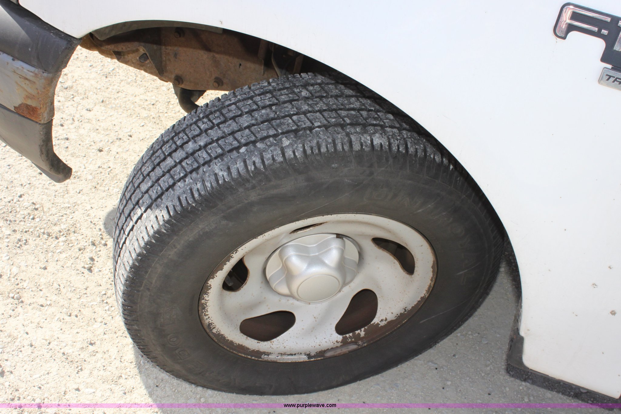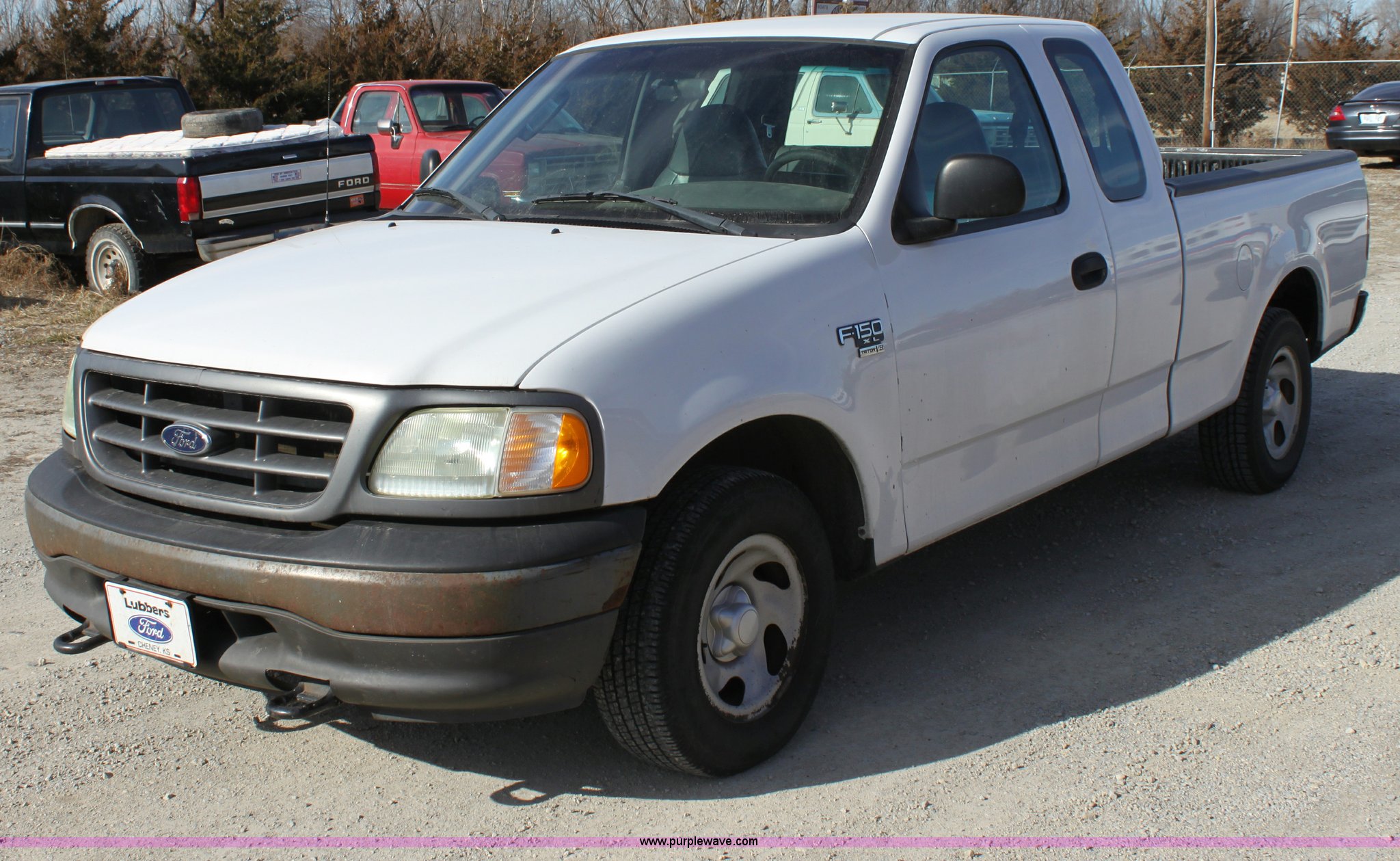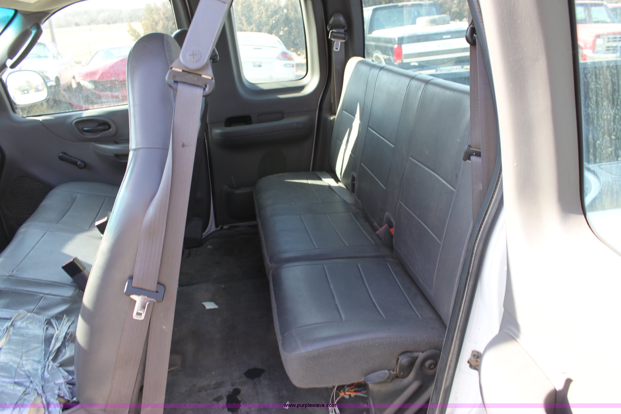 Purple Wave is selling a used Passenger Vehicle in Kansas. This item is a 2003 Ford F150 XL Supercab pickup truck with the following: 131,255 miles on odometer, 4.6L V8 EFI engine, Automatic transmission, AC and heat, Tilt, Cruise, AM/FM/Cassette, Manual windows and locks, Vinyl interior, Front tow hooks, Bed liner, Receiver hitch, Trailer wiring, 235/70R16 tires, Damage to seat, Dent in passenger rear bedside, Equip# 0665