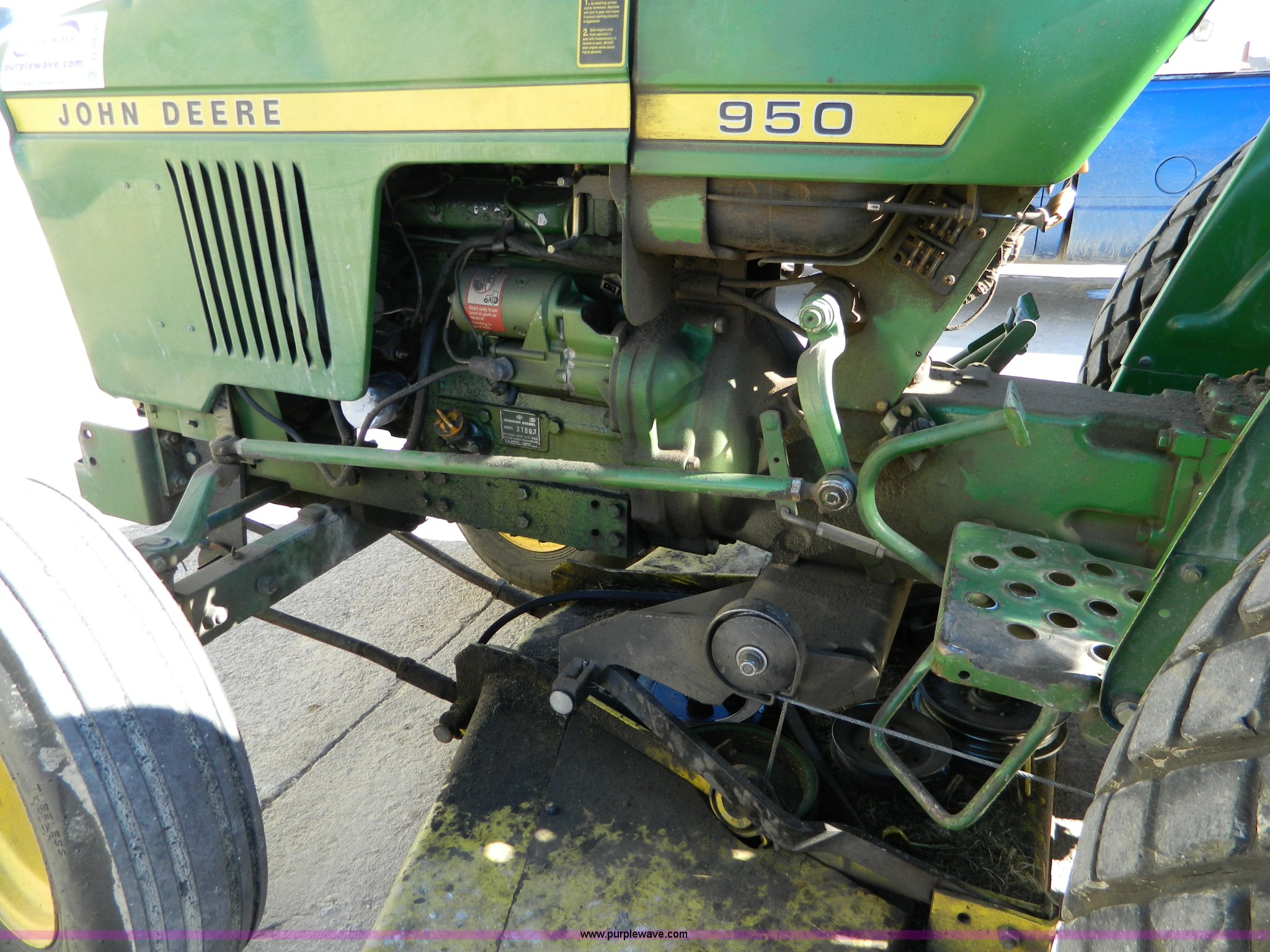Purple Wave is selling a used Tractor in Kansas. This item is a 1979 John Deere 950 tractor with the following: 3,567 hours on meter, Yanmar 3T90J diesel engine, Eight speed transmission, Three point, 540 PTO, 72" belly mower, 13.6-12-28 rear turf tires, 7.60-15 front tires, Tire chains, Manuals, Mower gearbox or deck pulley issues, Throws belt consistently, Tractor oil leaks, Serial 006150