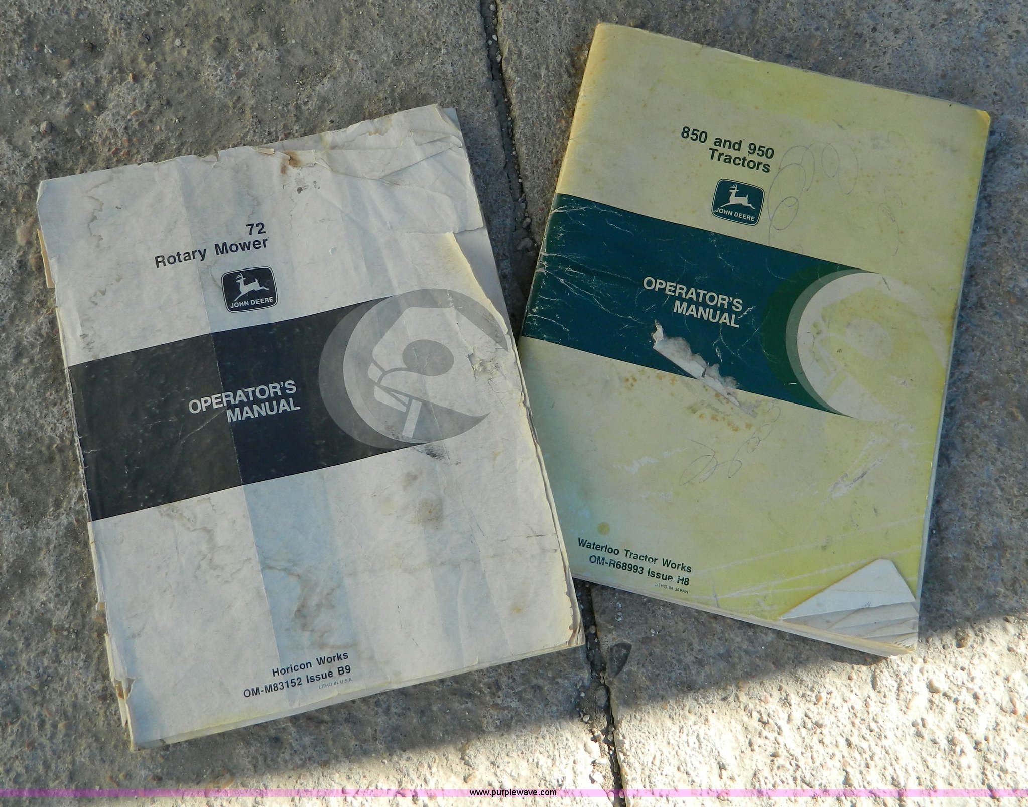 1979 John Deere 950 tractor. 3,567 hours on meter, Yanmar 3T90J diesel engine, Eight speed transmission, Three point, 540 PTO, 72" belly mower, 13.6-12-28 rear turf tires, 7.60-15 front tires, Tire chains, Manuals, Mower gearbox or deck pulley issues, Throws belt consistently, Tractor oil leaks, Serial 006150. USD 392. 234 W Washington. Osborne, KS 67473