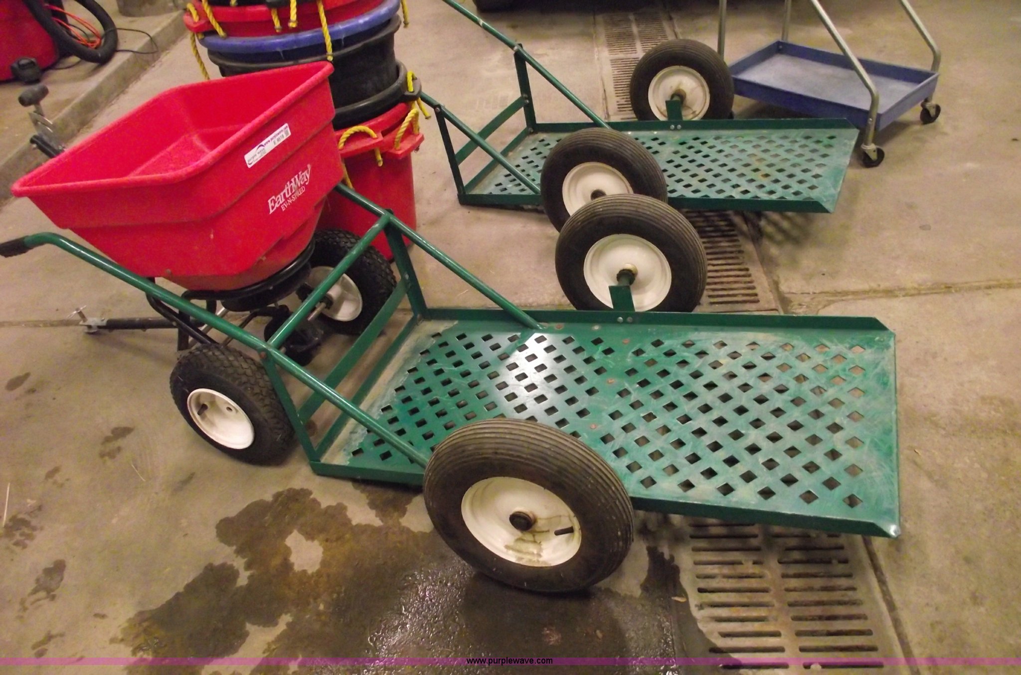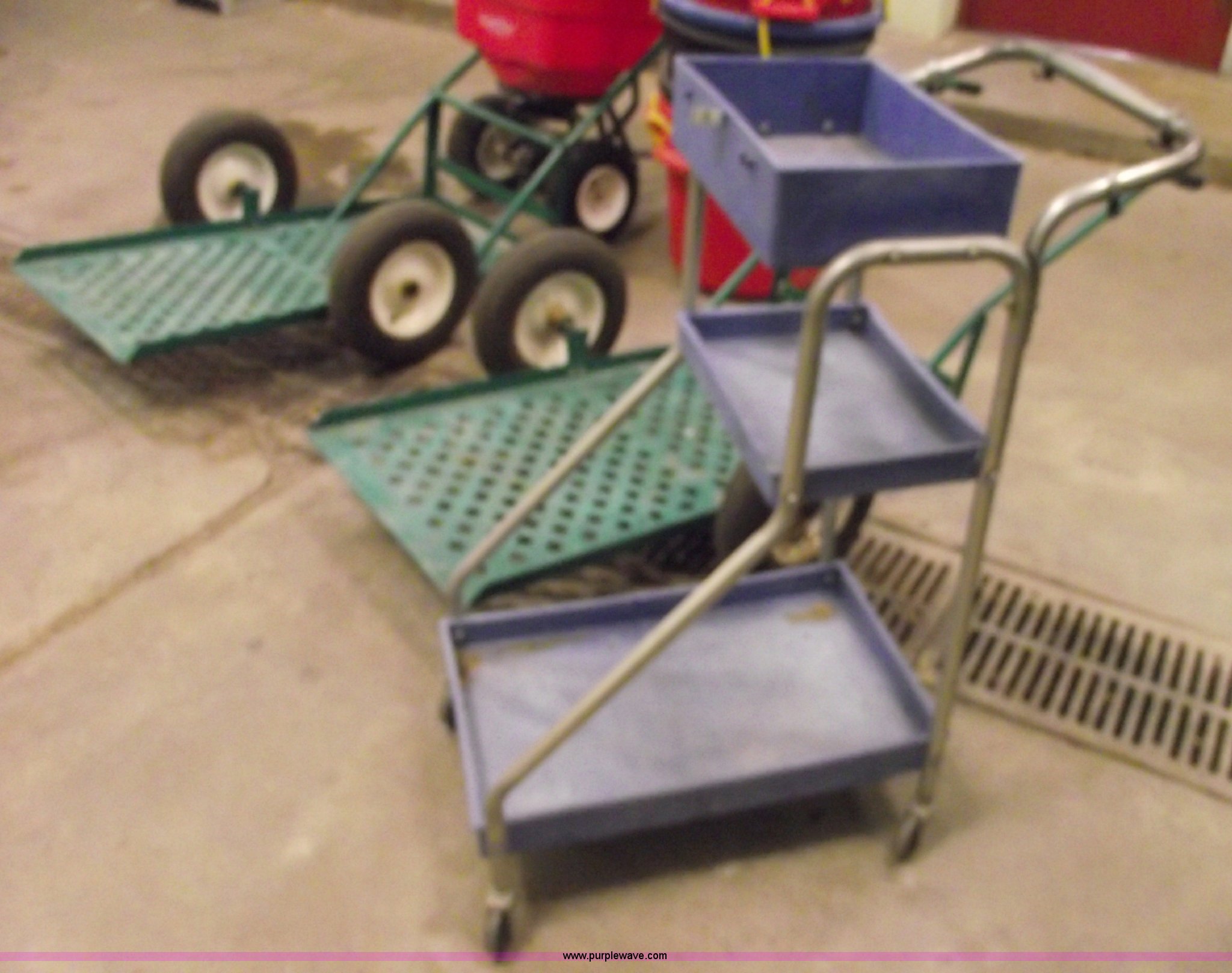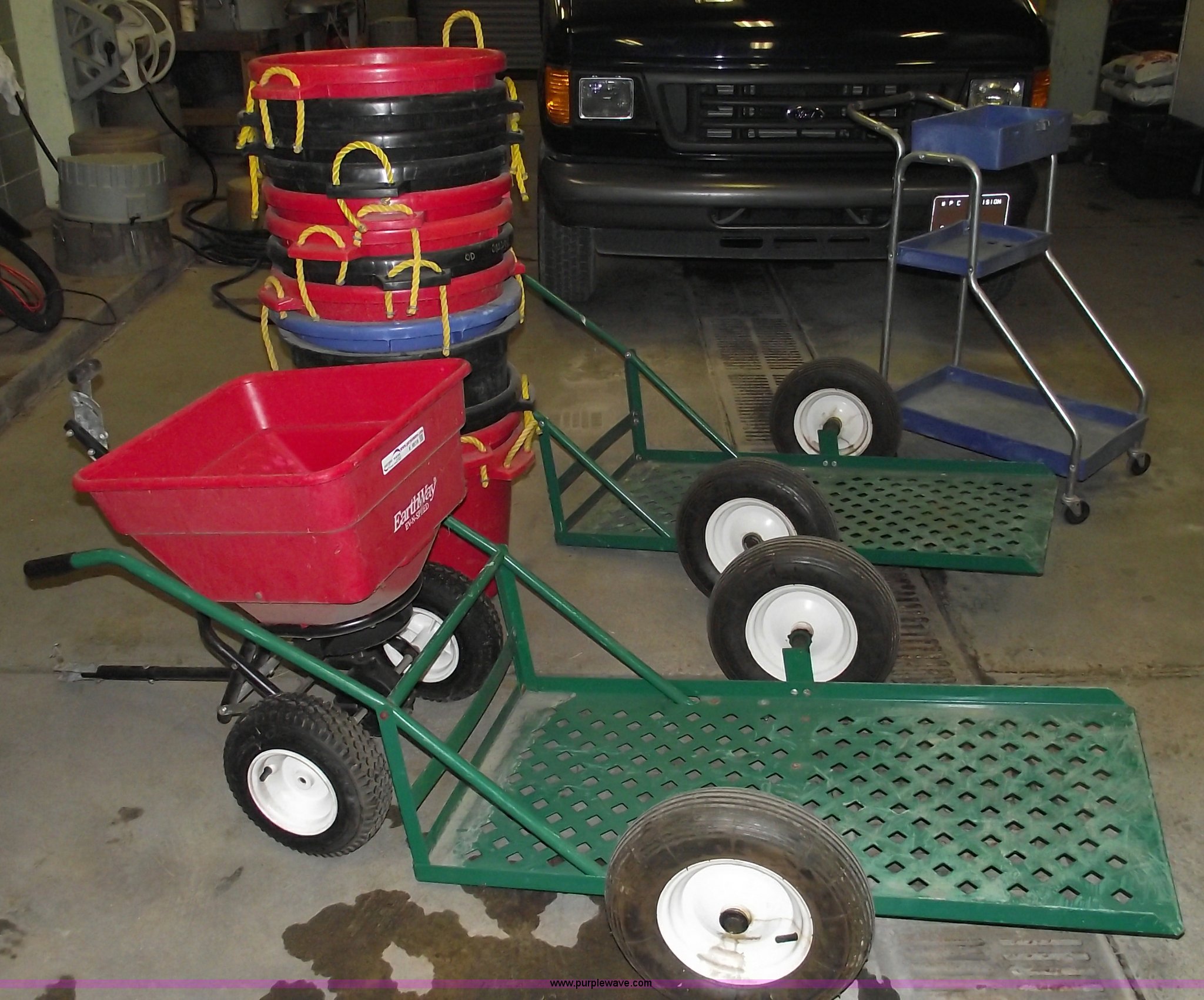 Purple Wave is selling a used Lawn and Garden in Missouri. This item is a Assorted outdoor supplies with the following: (13) 70 quart tubs, (2) Steel yard carts, Earthway salter/sander, Towable, Upright cart on coasters