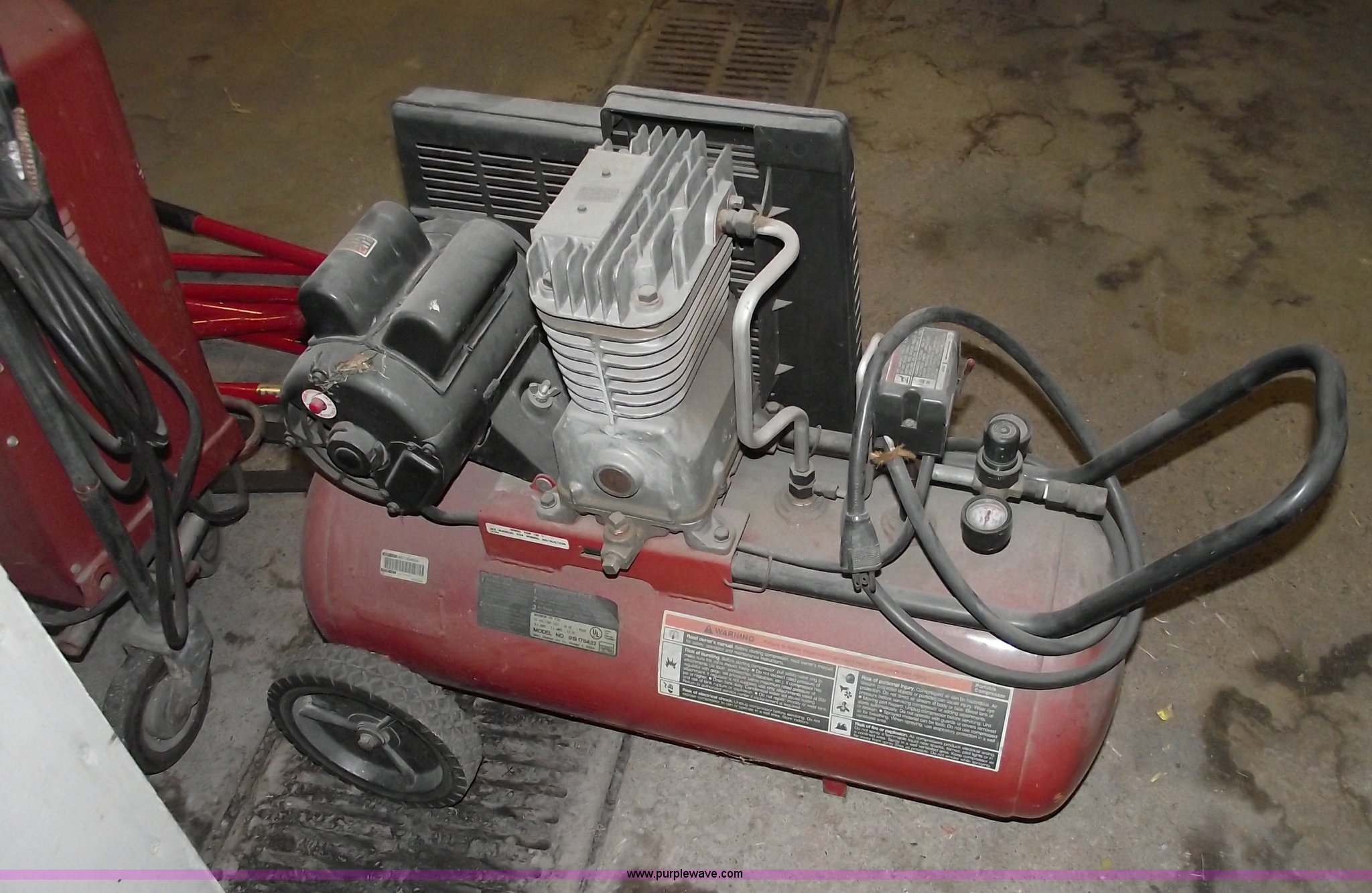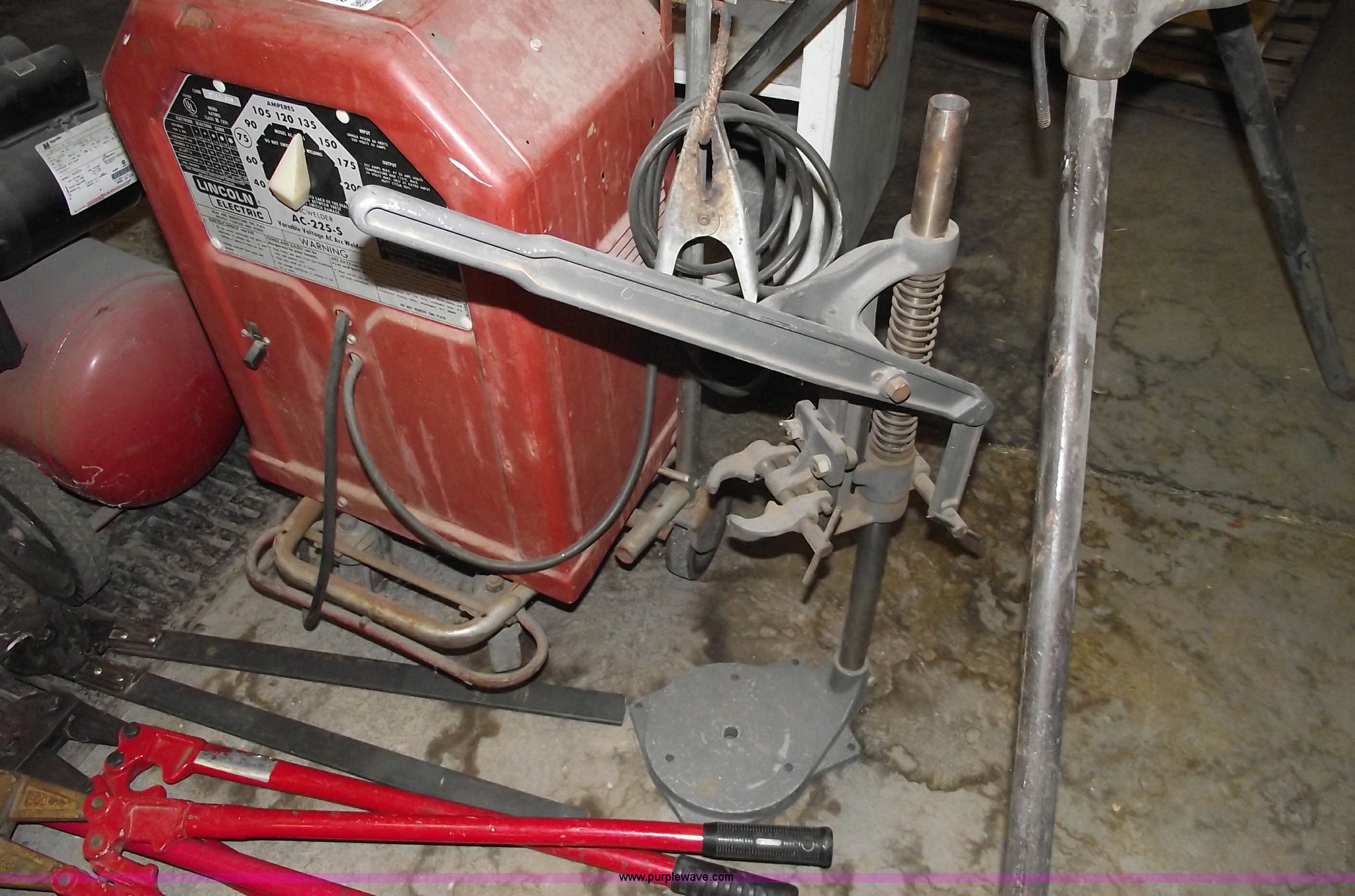 Purple Wave is selling a used Tools in Missouri. This item is a Assorted shop equipment with the following: Lincoln AC 225-5 ArcWelder on cart, 10' lead, 10' ground, Craftsman 15 gallon air compressor, (5) 36" long blot cutters, Pipe stand with clamp, Table mounted drill press for hand drill, Shelf cart on casters, DeWalt reciprocating saw, String of shop lights, Tool box, 18 volt batteries