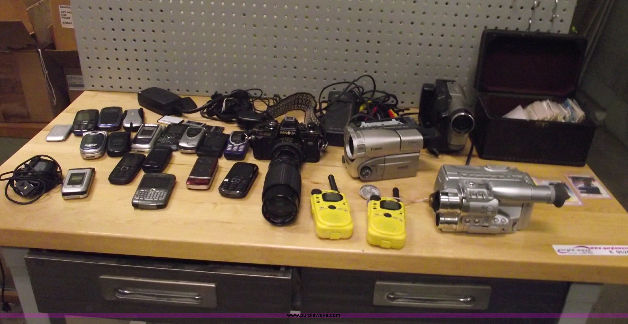 Purple Wave is selling a used Electronics in Missouri. This item is a Assorted electronics and baseball cards with the following: (15) cell phones, (3) video cameras, 35 mil. camera, Various chargers, Approx 150 assorted baseball cards, Work bench