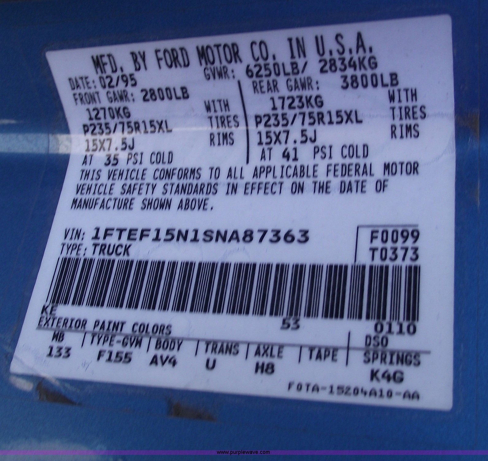 Purple Wave is selling a used Passenger Vehicle in Missouri. This item is a 1995 Ford F150 Eddie Bauer/XL with the following: 61,486 miles on odometer, 5.0L V8 EFI gas engine, Automatic transmission with over drive, AC and heat, Tilt, AM/FM, Manual windows and locks, Vinyl interior, Sliding back glass, Pickup bed, Receiver hitch, Trailer wiring, Steel wheels, Weather guard box, Bed mat, Electric brake controller, 235-75-15 tires